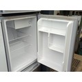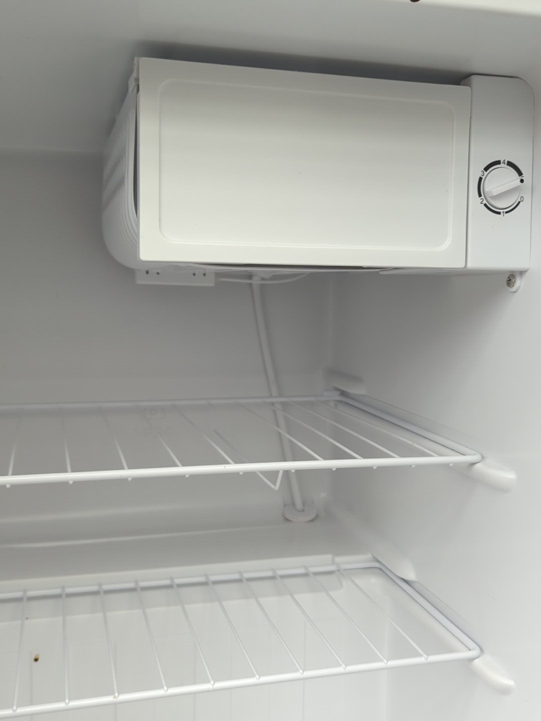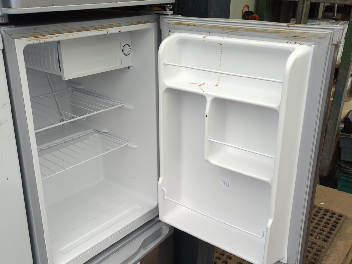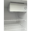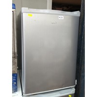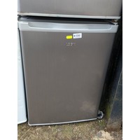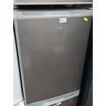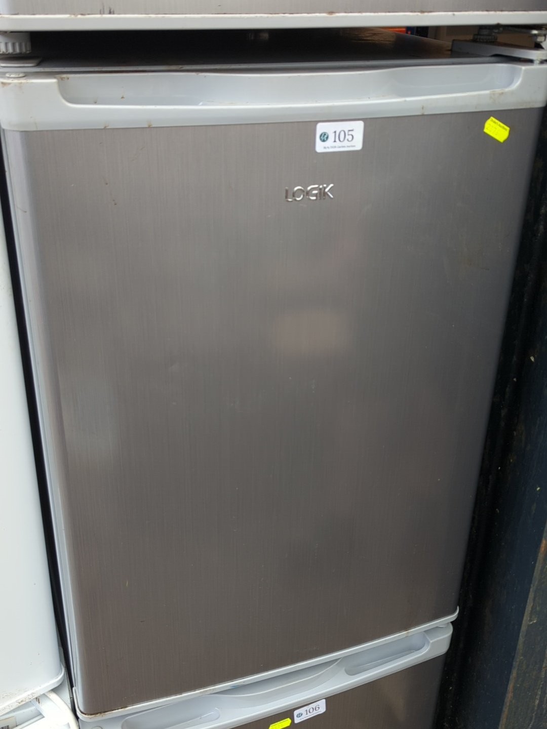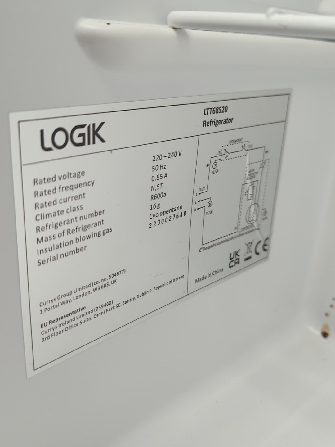 LOGIK under-counter refrigerator, model LTT68S20, with brushed-effect grey door, white interior, ice box compartment, adjustable thermostat dial, two wire shelves, and door racks; label notes 220–240V, 50Hz, R600a refrigerant.