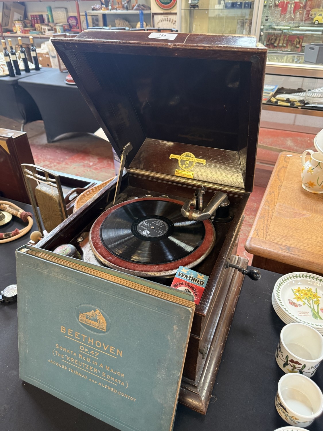 A vintage Columbia mahogany cased gramophone together with an album of 78rpm records by Beethoven
