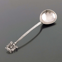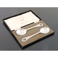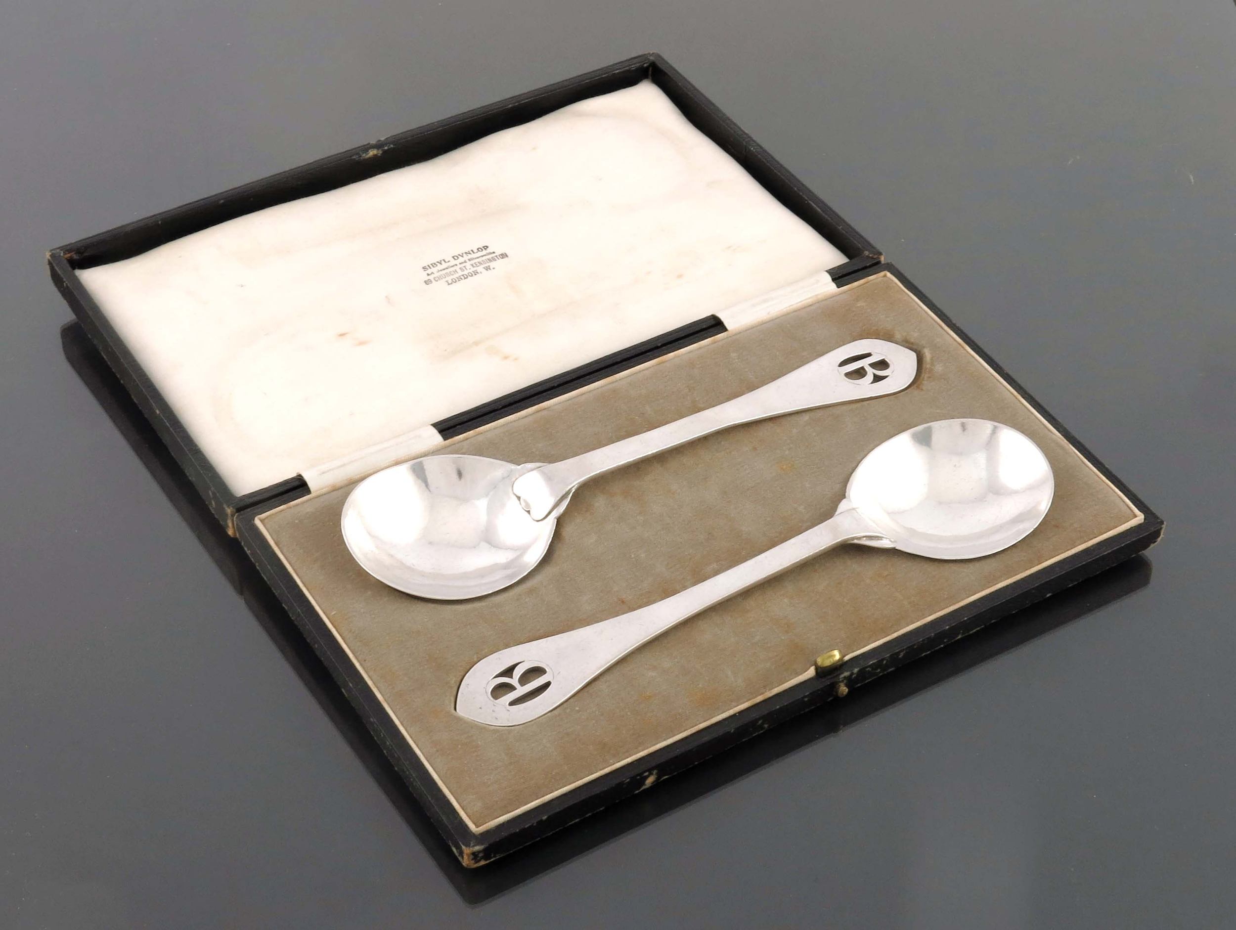Sibyl Dunlop, a pair of Arts and Crafts silver serving spoons, London 1931, planished form with circular bowls and Celtic point ends pieced with the letter B to the terminals, the handled united to the bowls with trefid tongue lappets, in original fitted box, 22cm long, 6.05ozt (2)