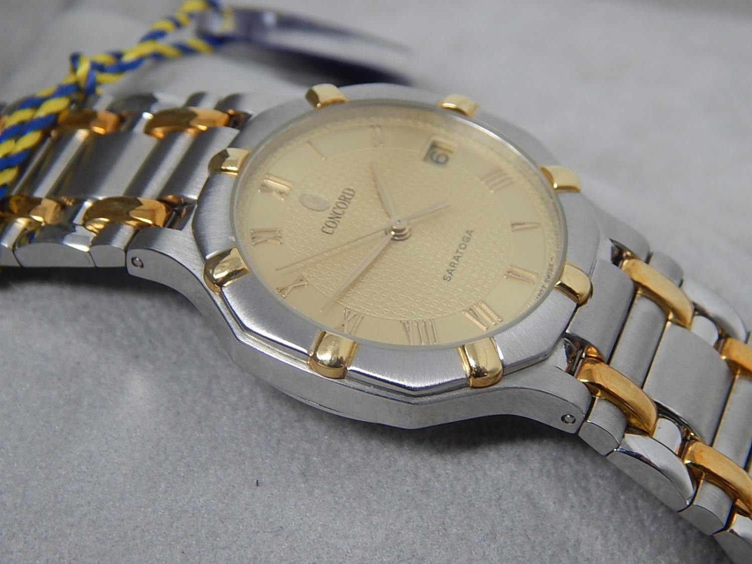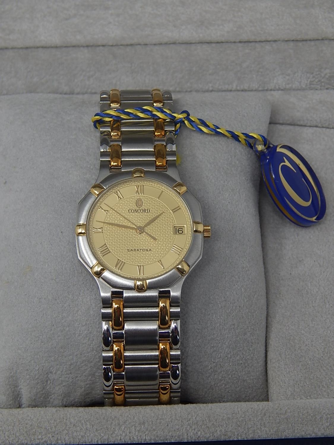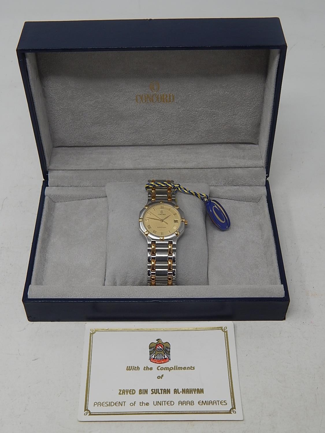 Gentleman's CONCORD SARATOGA 18ct Gold & Stainless Steel Wristwatch with Date Aperture. The Watch is Unused & is Complete with Original Tags in Its Fitted Box. Presented to our vendor by "Zayed Bin Sultan Al-Nahyan" President of The United Arab Emirates.