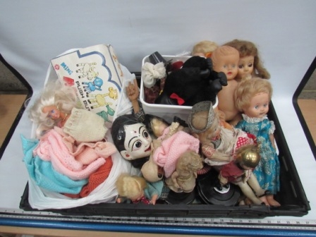 Box of vintage dolls + toys