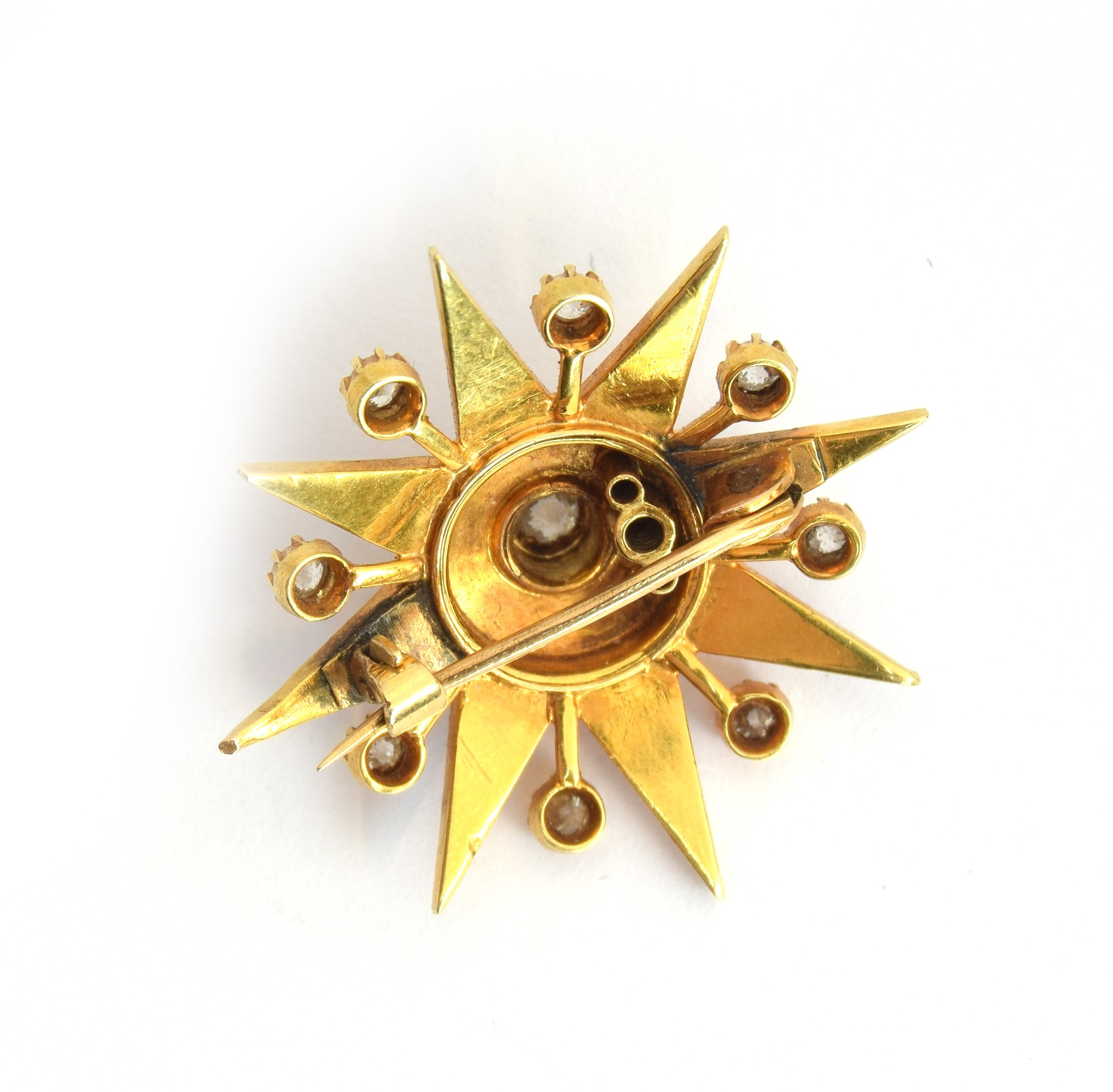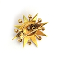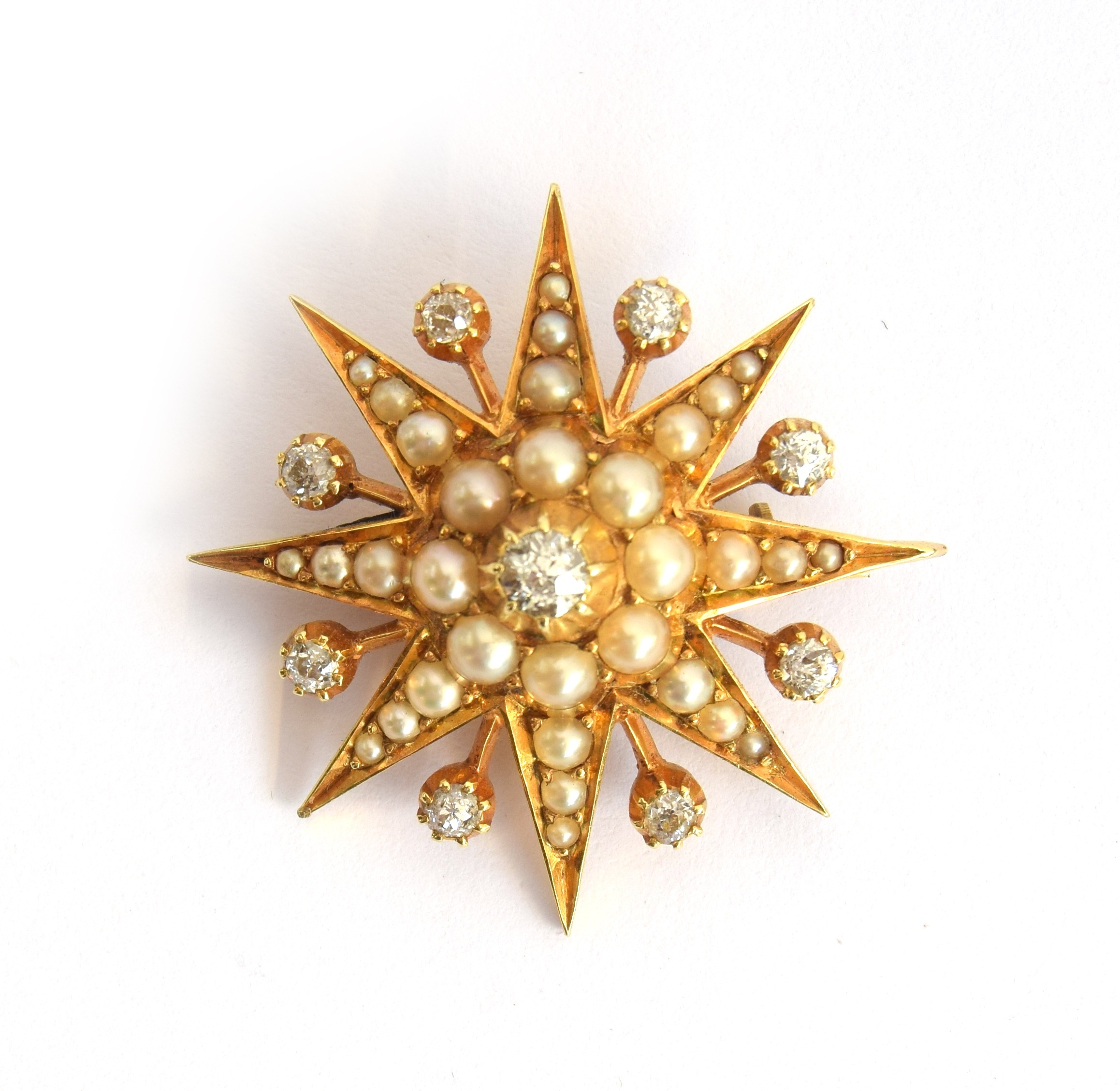 A late 19th/early 20th century gold mounted star burst brooch set with old cut diamonds and split pearls, 3cm diameter, unmarked but tests as 15ct gold or higher, 7.3g