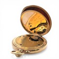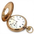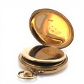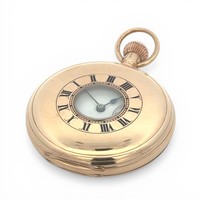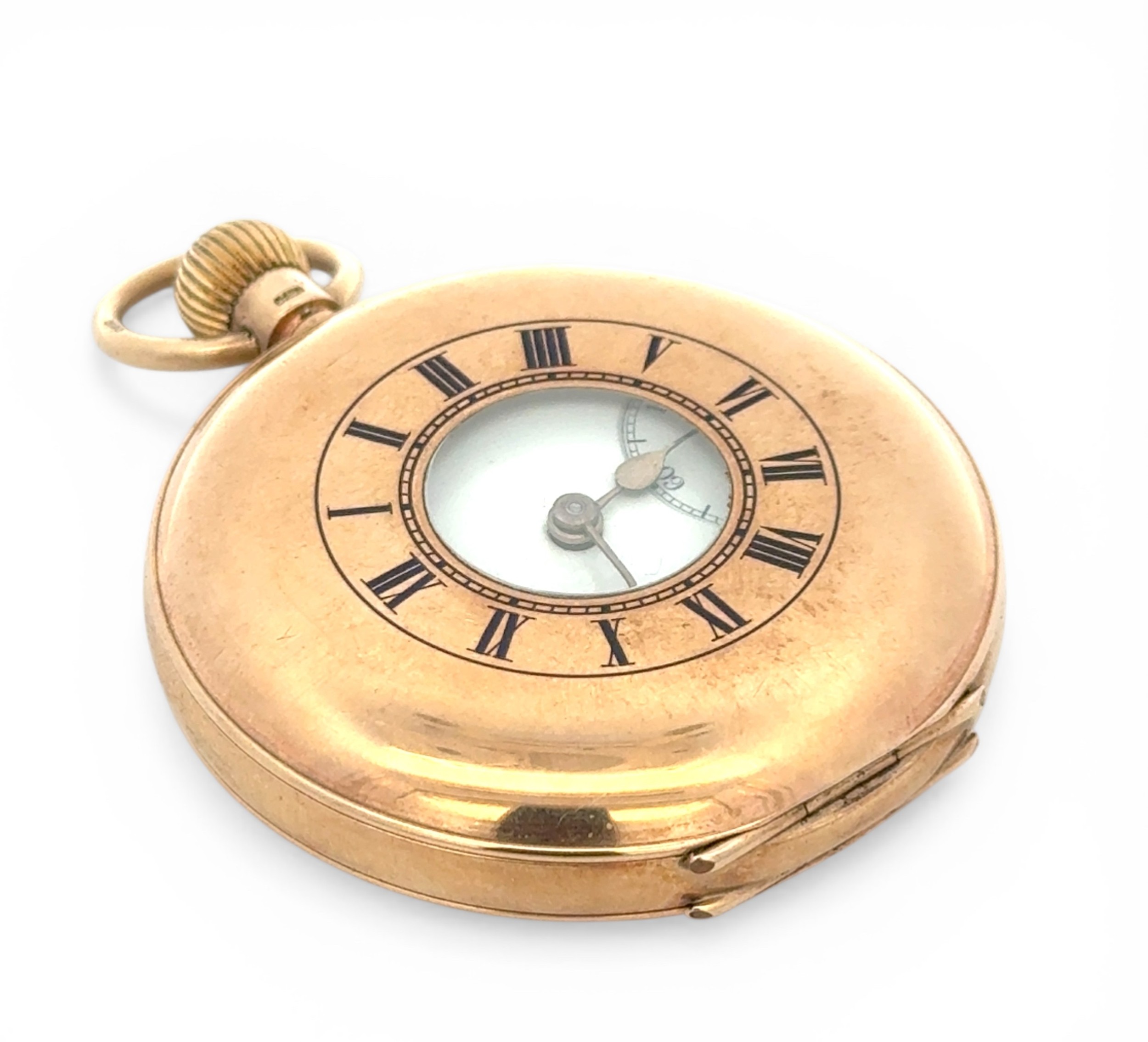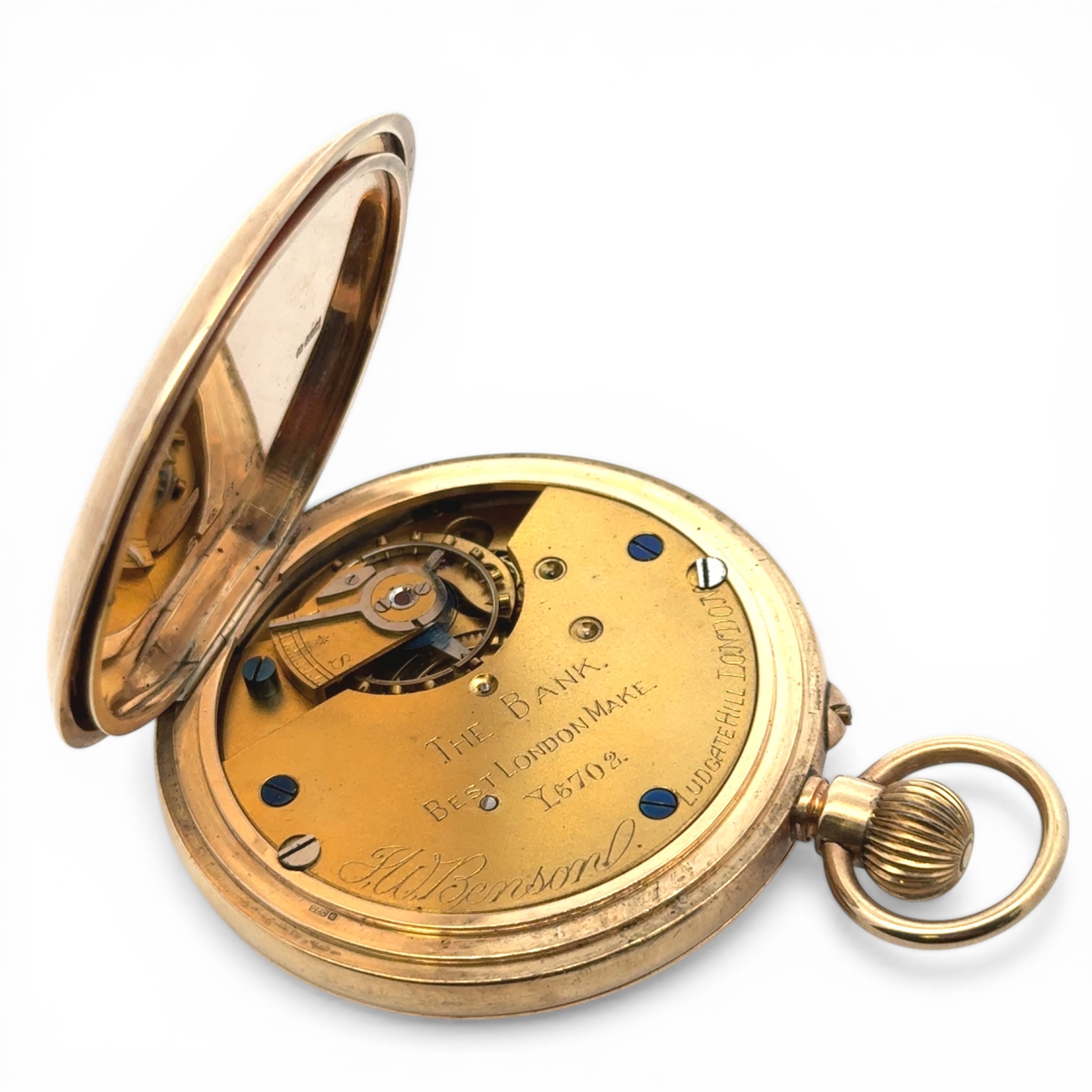 J W Benson Ltd 9ct gold half hunter lever pocket watch. Signed white enamel dial with Roman numeral markers and subsidiary seconds dial. Gilt three quarter plate movement signed "J.W. Benson, Ludgate Hill, London, The Bank, Best London Make, Y.6702". Gold cuvette, 50mm case hallmarked JWBLd, London 1938, numbered 2688. Case diameter 49mm. 90.4g