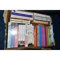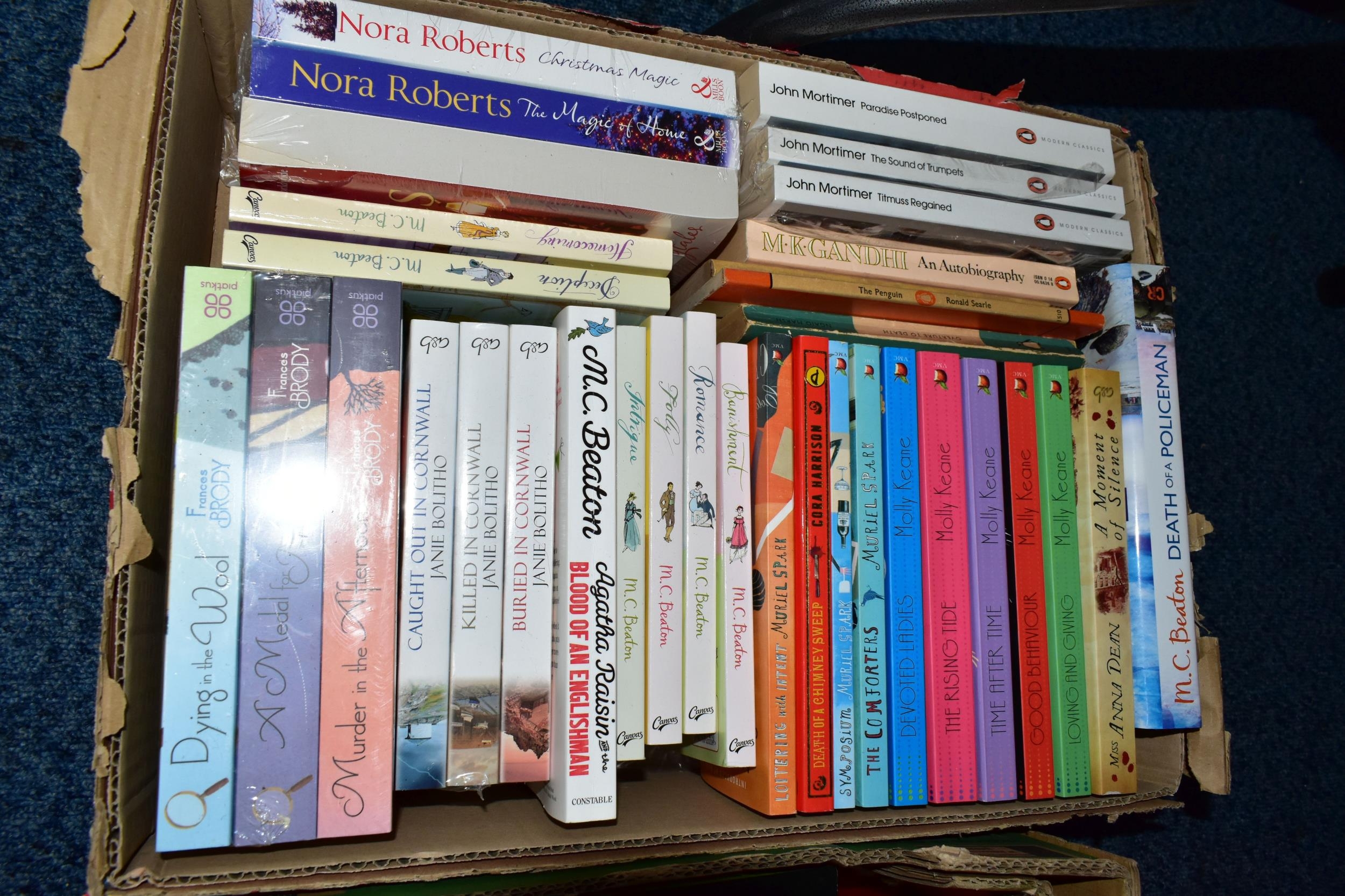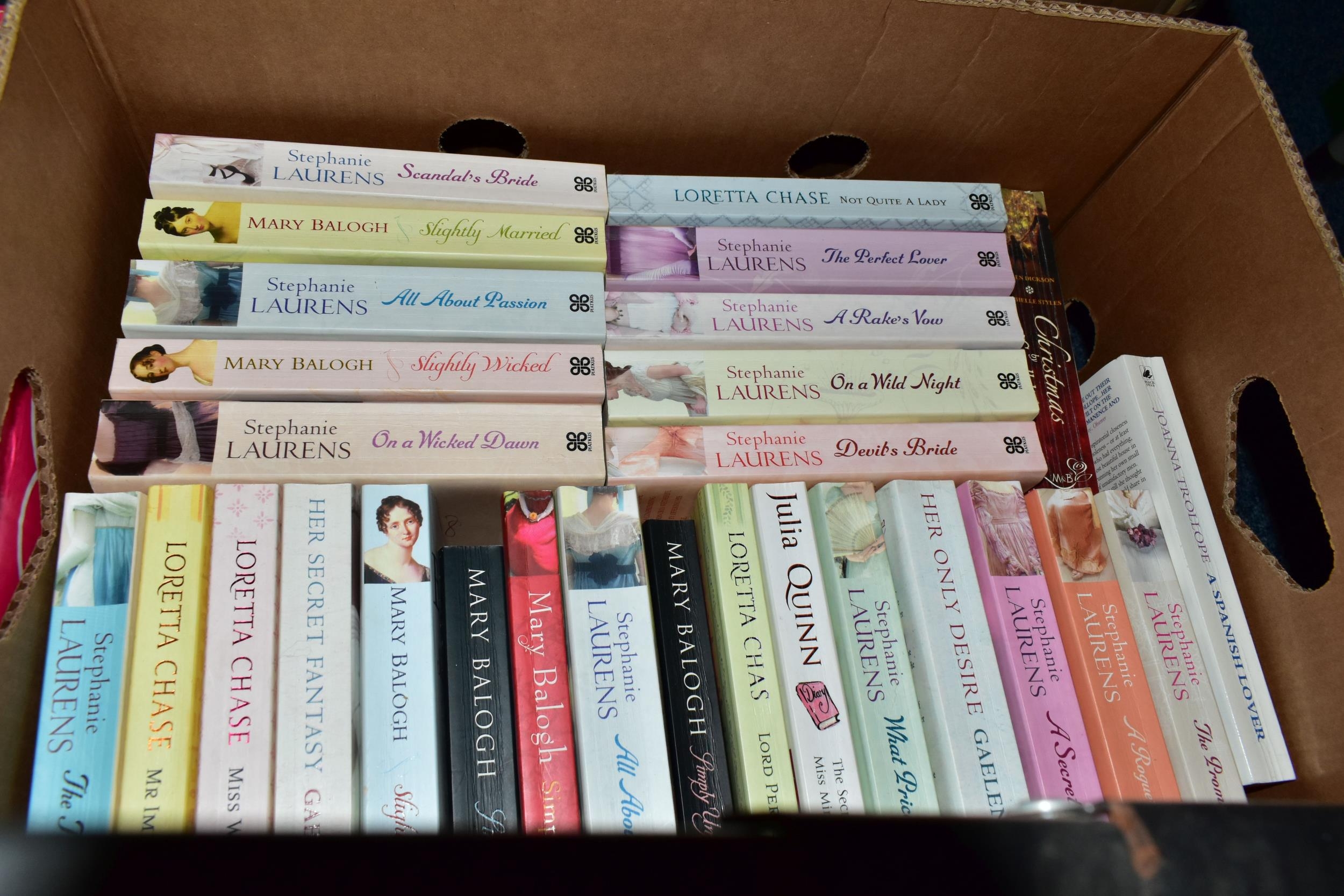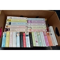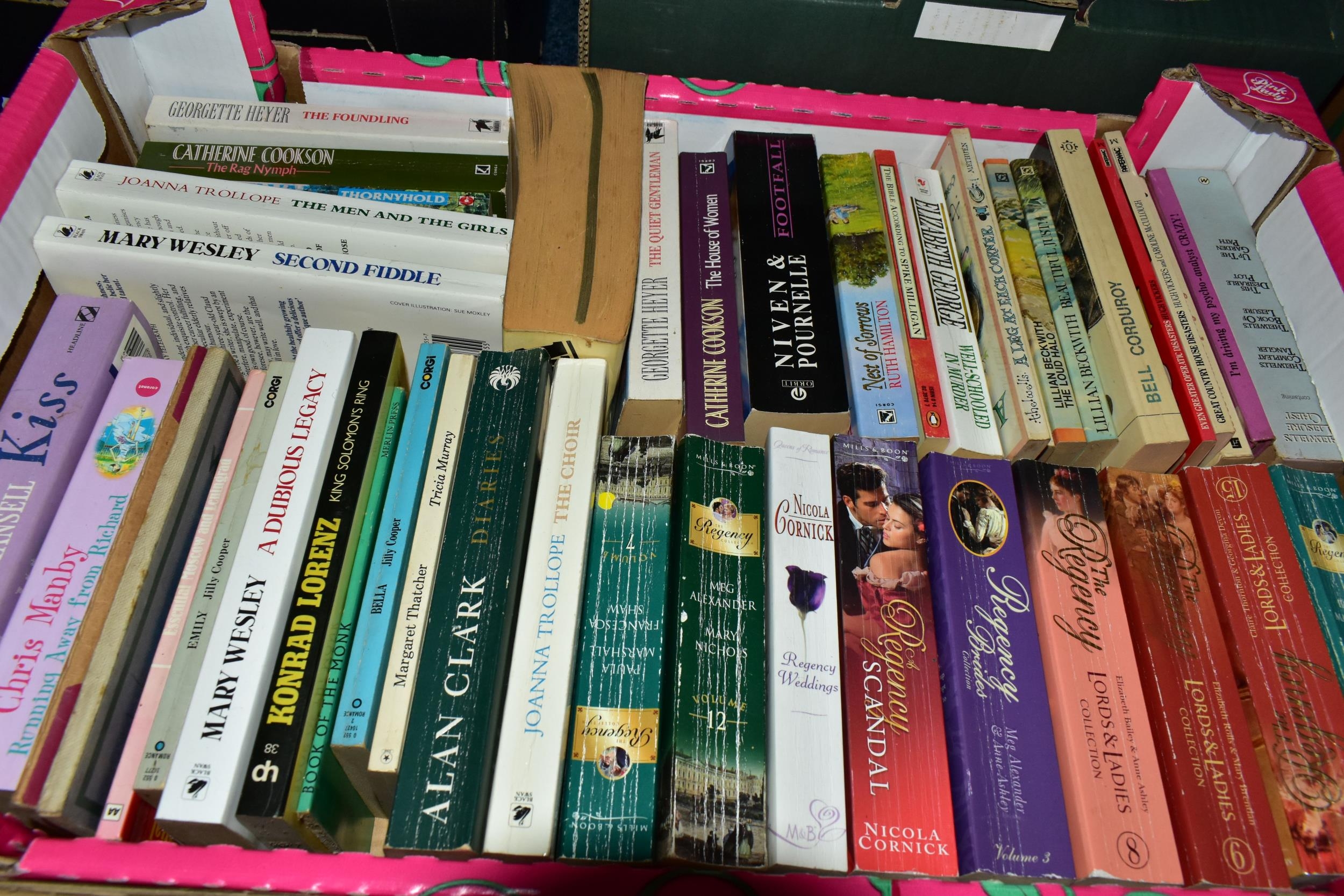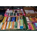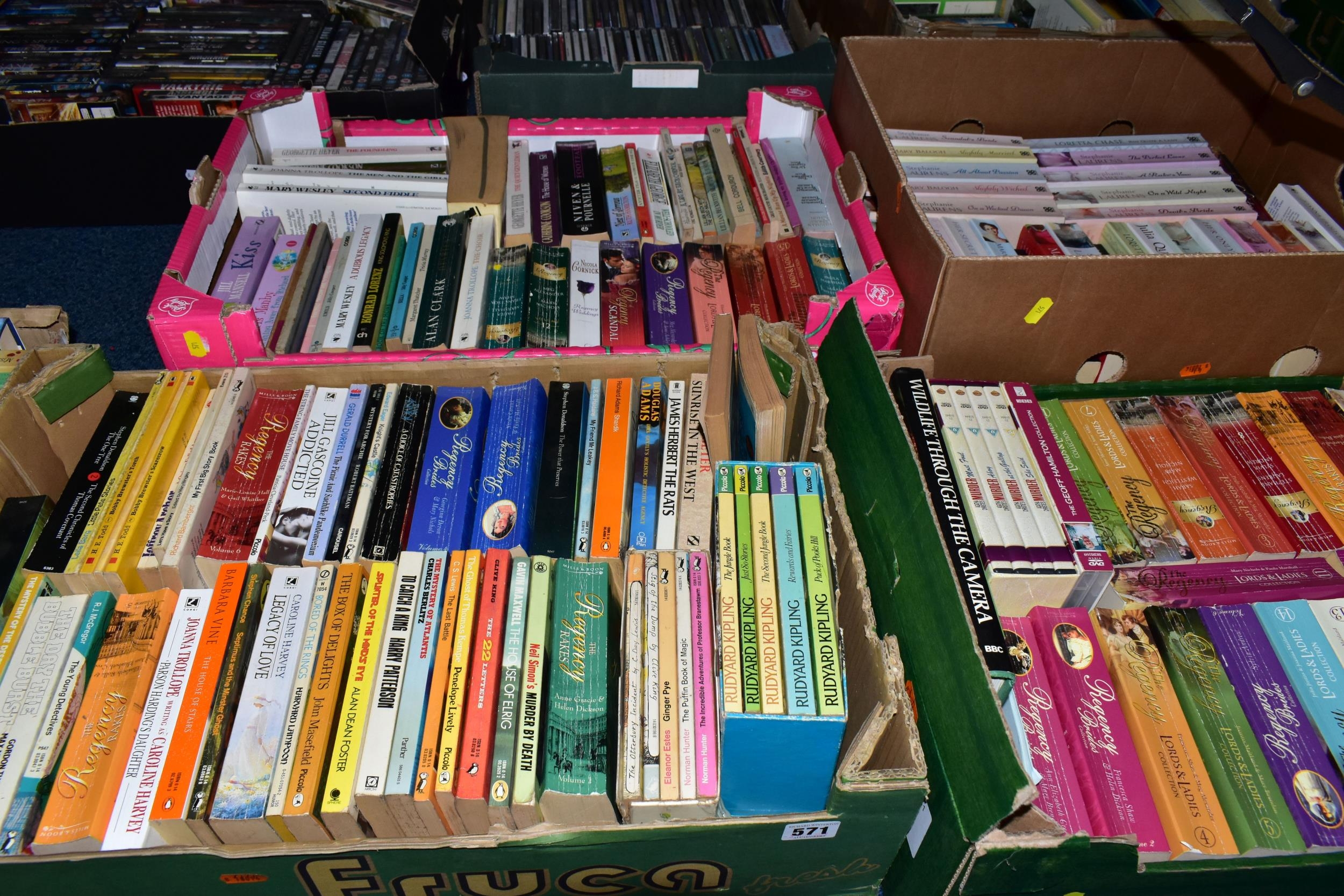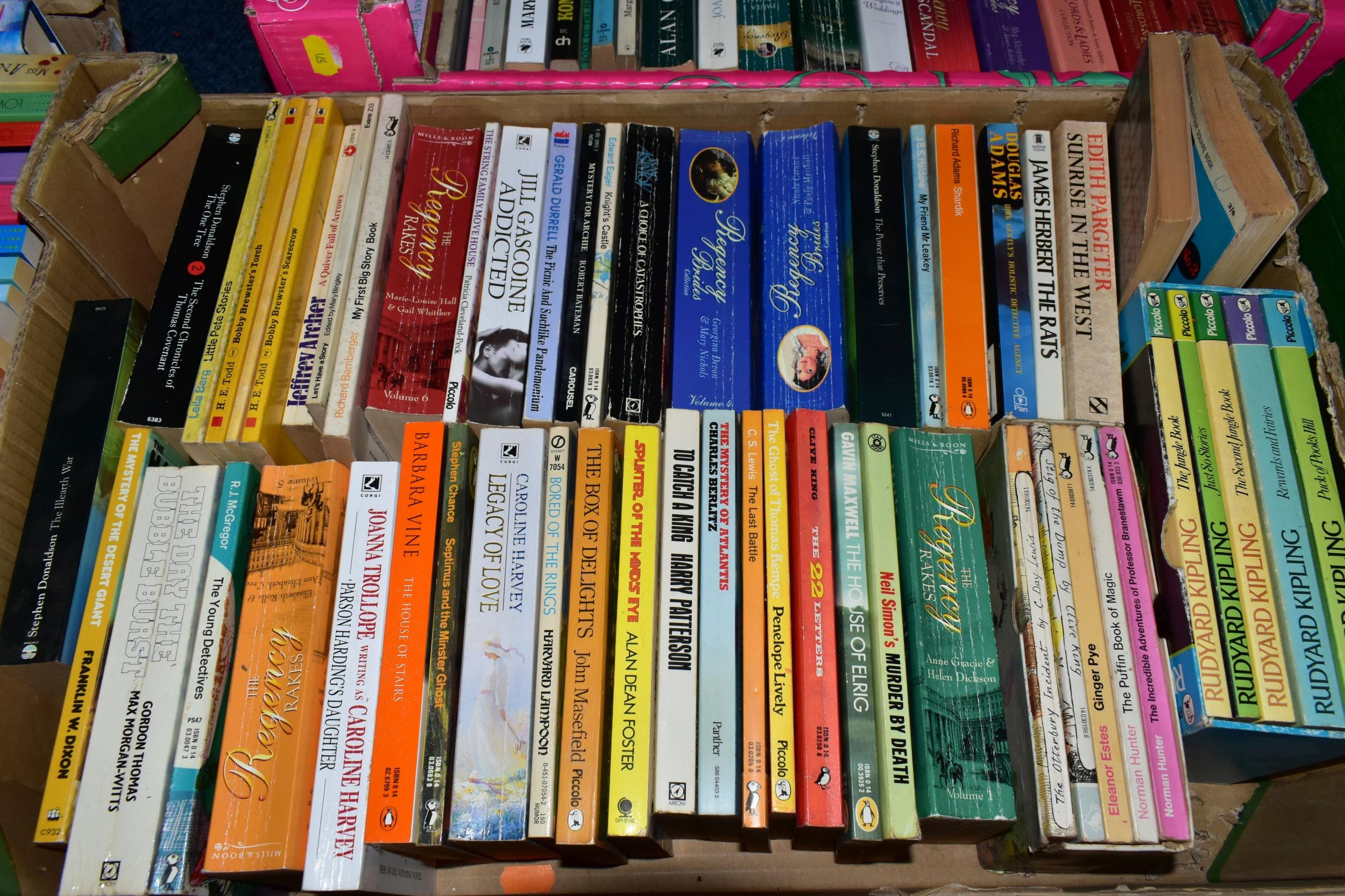 FIVE BOXES OF BOOKS containing over 185 miscellaneous titles in paperback format, most titles are classic or contemporary fiction, authors include Rudyard Kipling, Stephen Donaldson, John Mortimer, Ian Fleming, James Herbert, Douglas Adams, Alan Clarke (Diaries) Mary Wesley, Jill Gascoigne and many others including a large number of female writers of a specific genre including a collection of 'The Regency' Series (5 boxes)