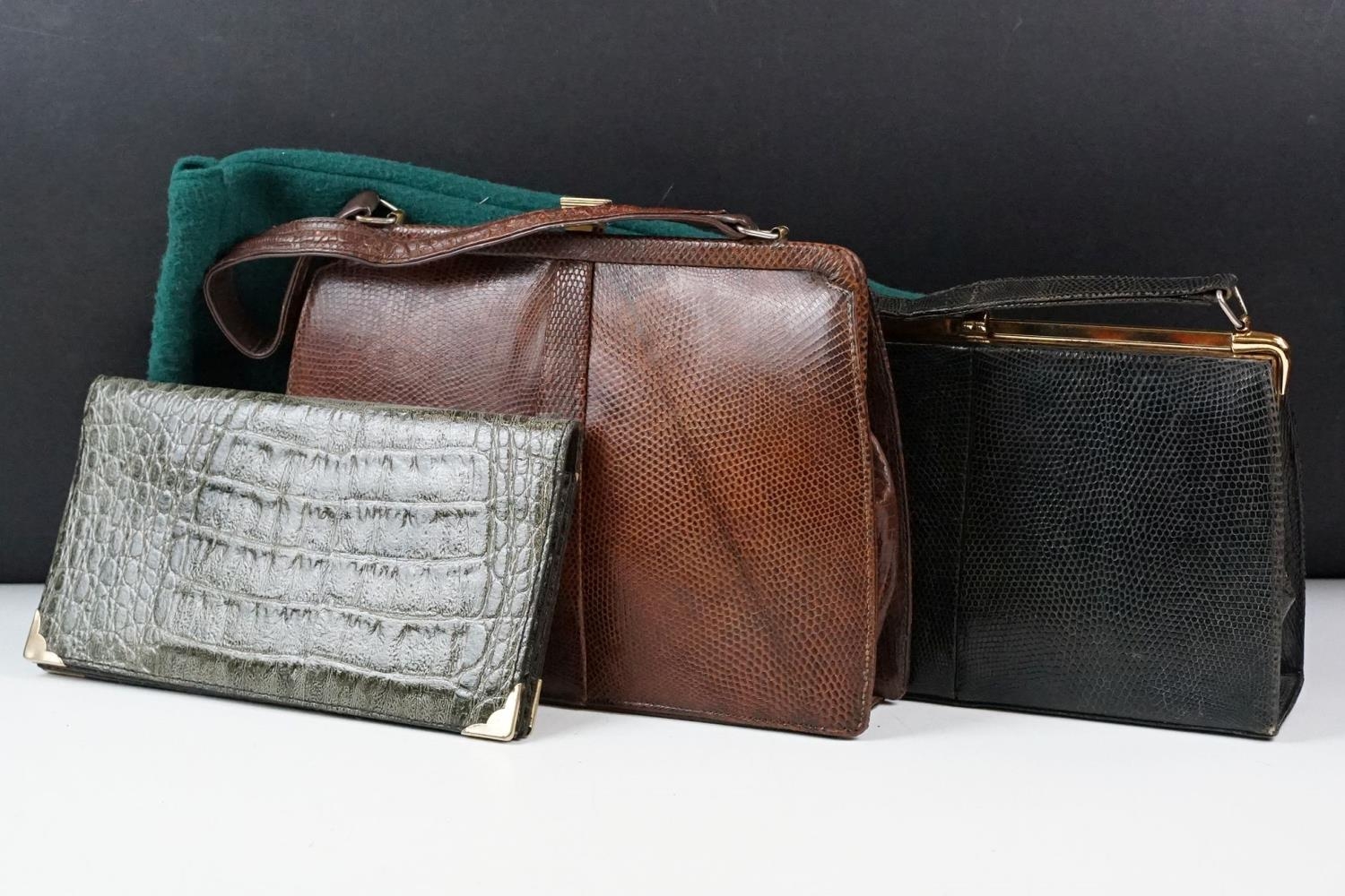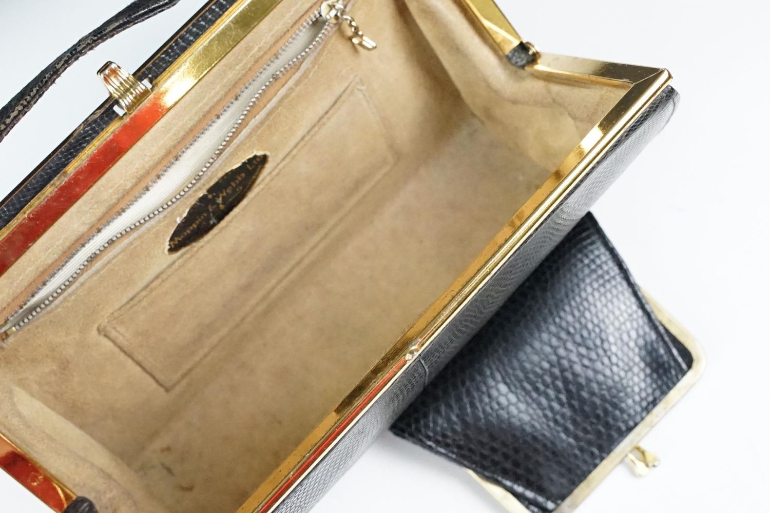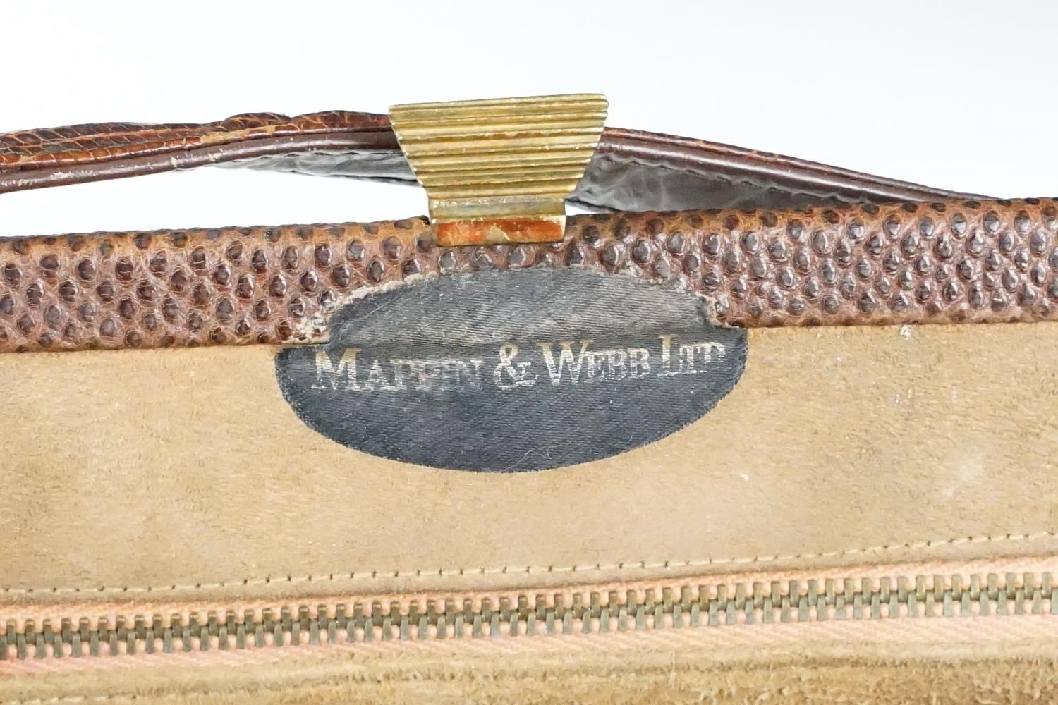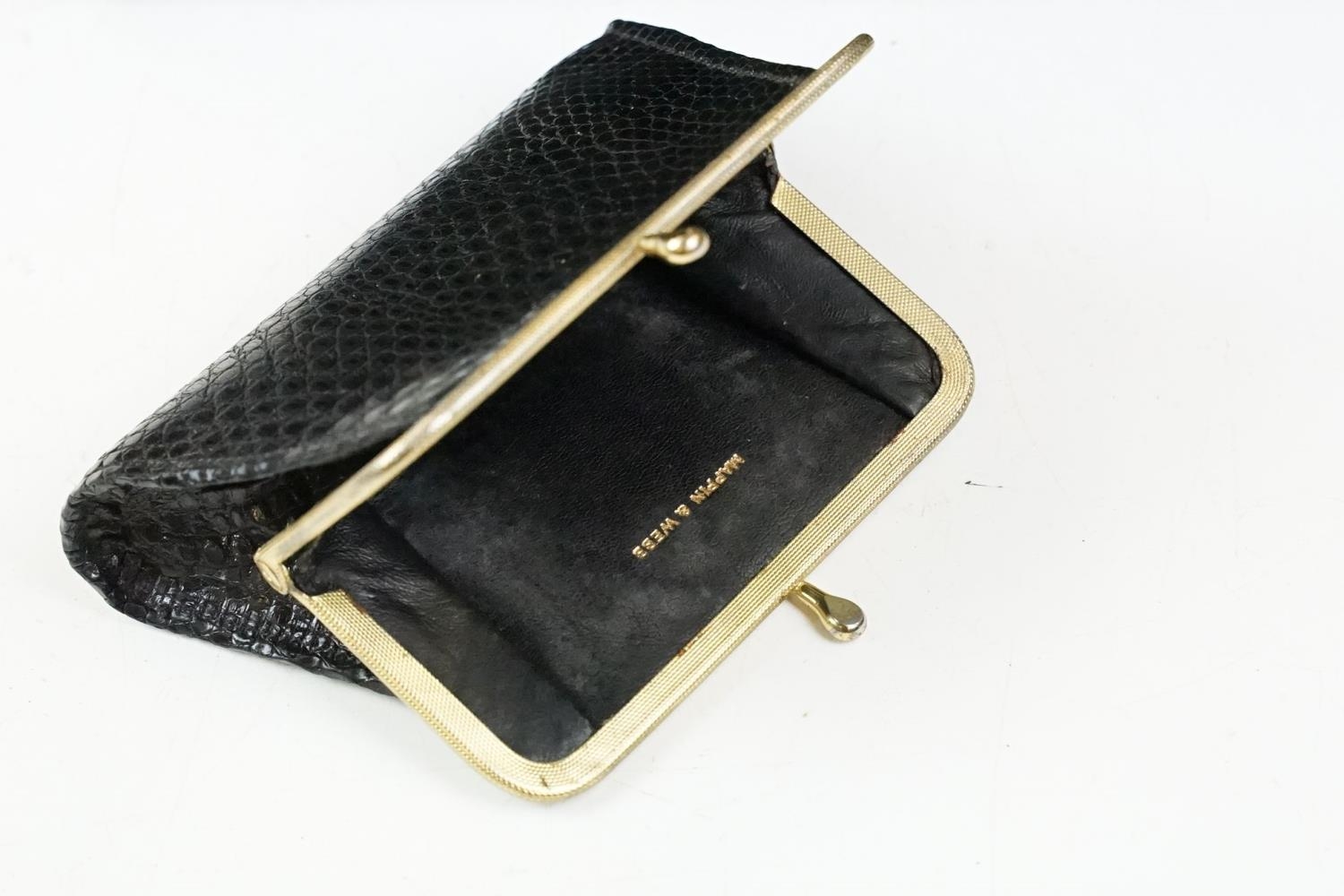 Two vintage Mappin & Webb snake skin handbags each having yellow metal purse clasps and makers labels within. Together with a crocodile skin wallet.