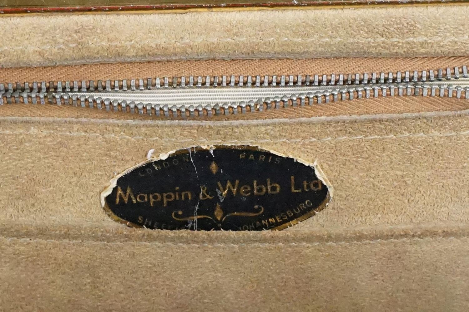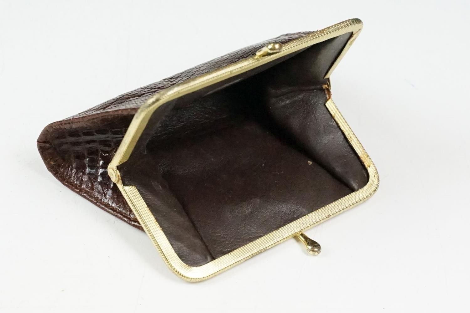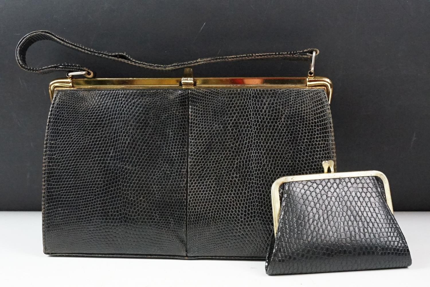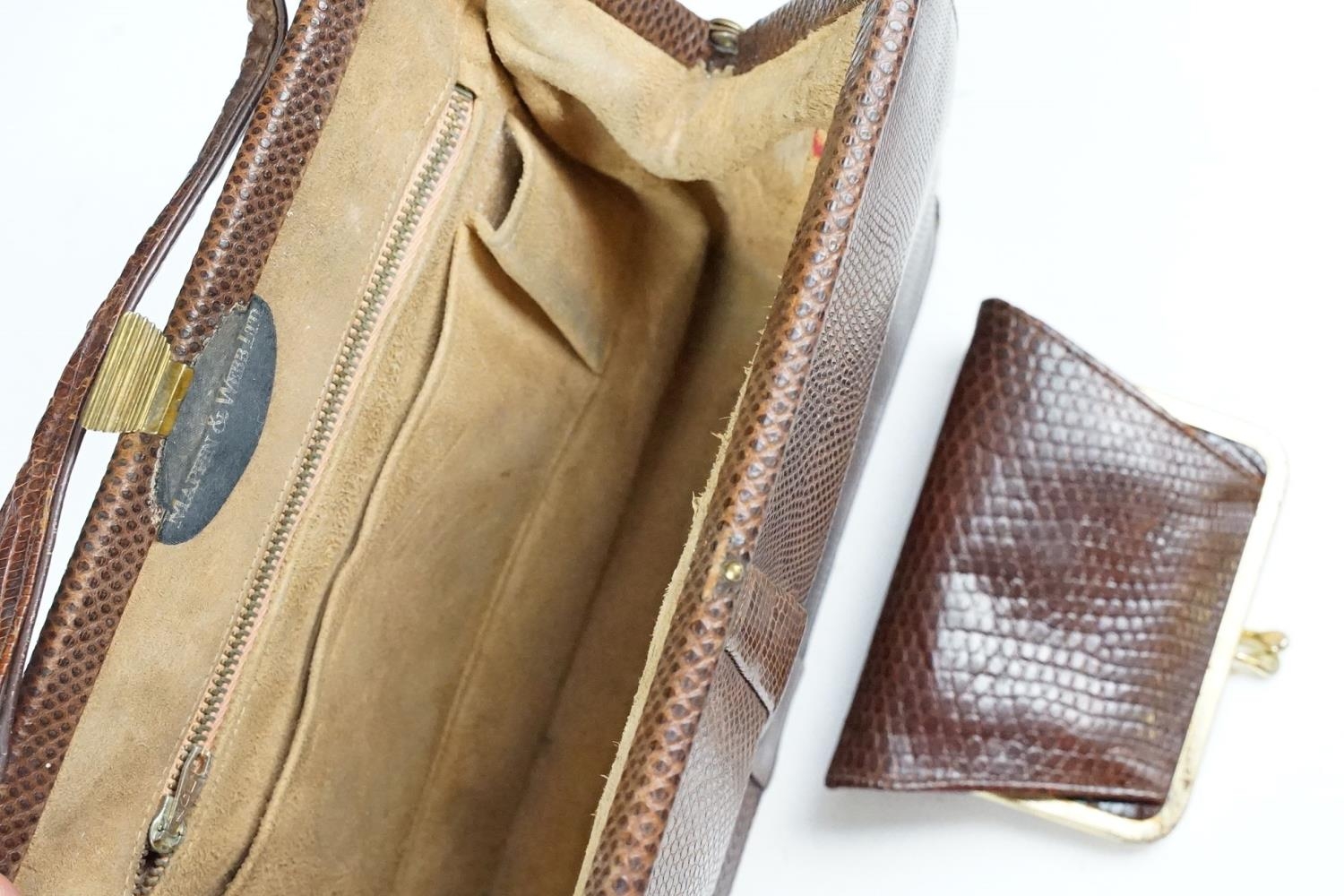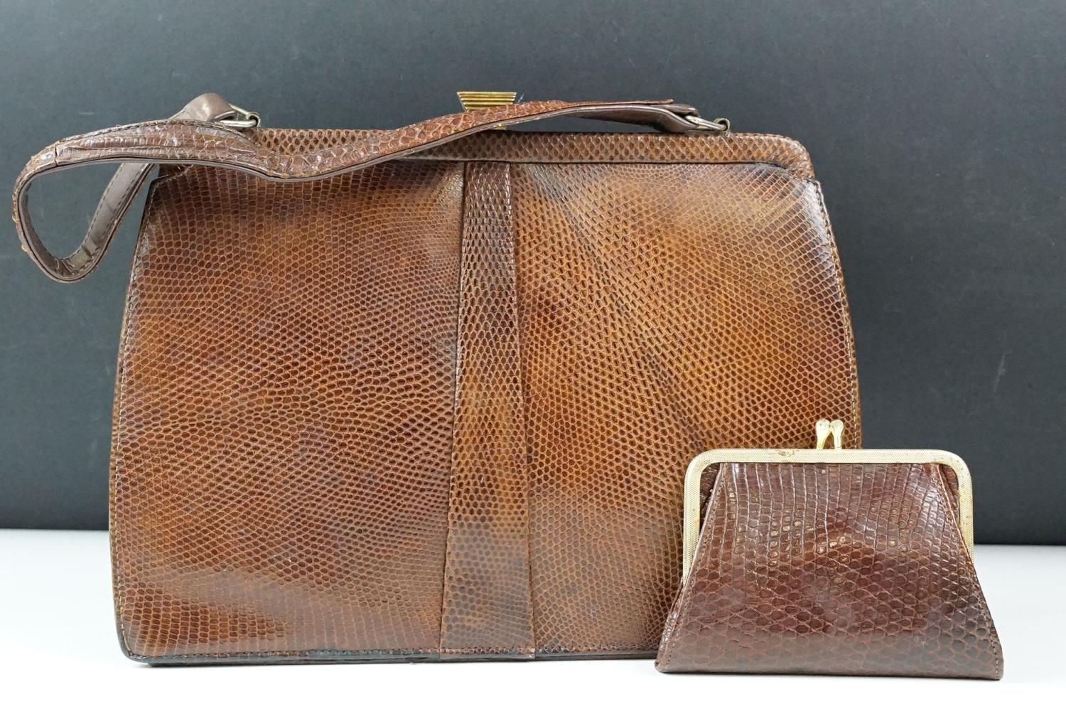 Two vintage Mappin & Webb snake skin handbags each having yellow metal purse clasps and makers labels within. Together with a crocodile skin wallet.