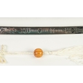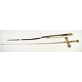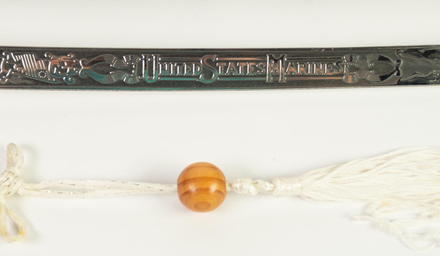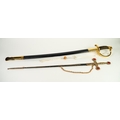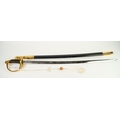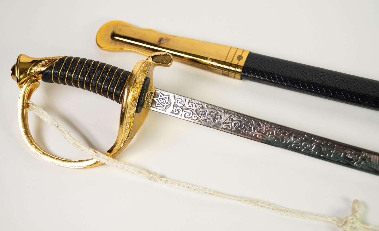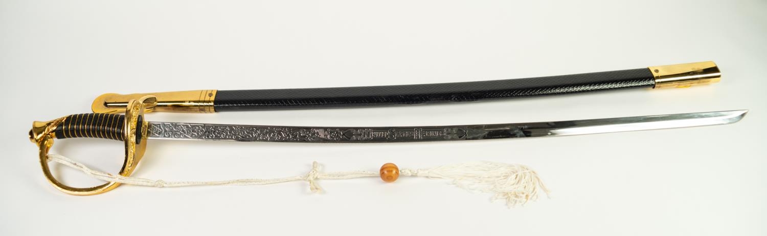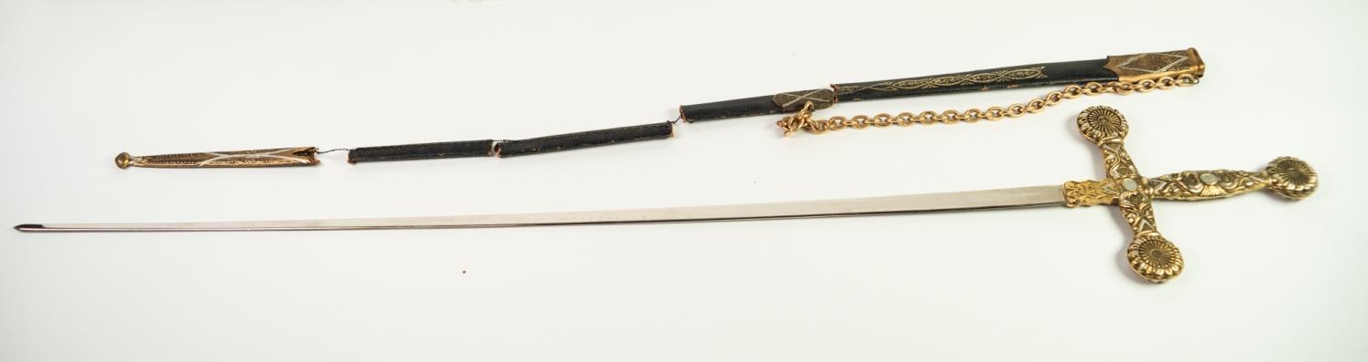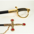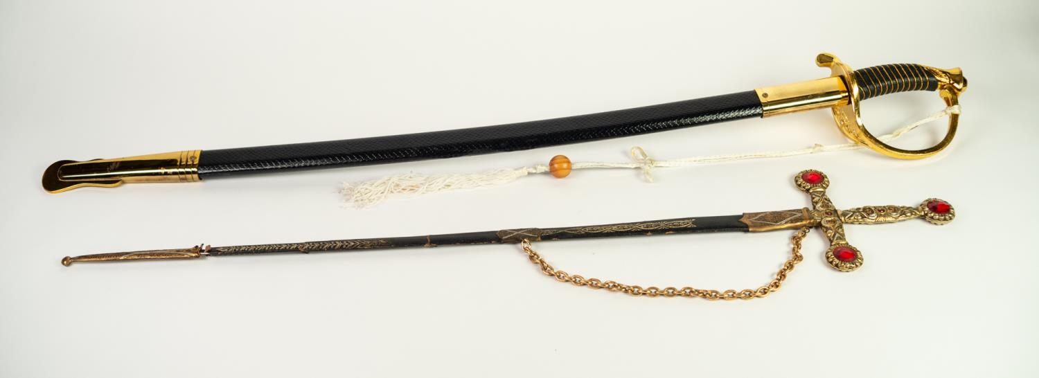 MODERN REPRODUCTION SWORD IN GILT METAL AND SIMULATED LEATHER, the curved clade with United States Marines and foliate scrolls in bas relief, scabbard with gilt metal drag and a REPRODUCTION CEREMONIAL SWORD, the cruciform blade inlet with coloured glass stones, GILT METAL AND LEATHER SCABBARD IN PIECES (2)