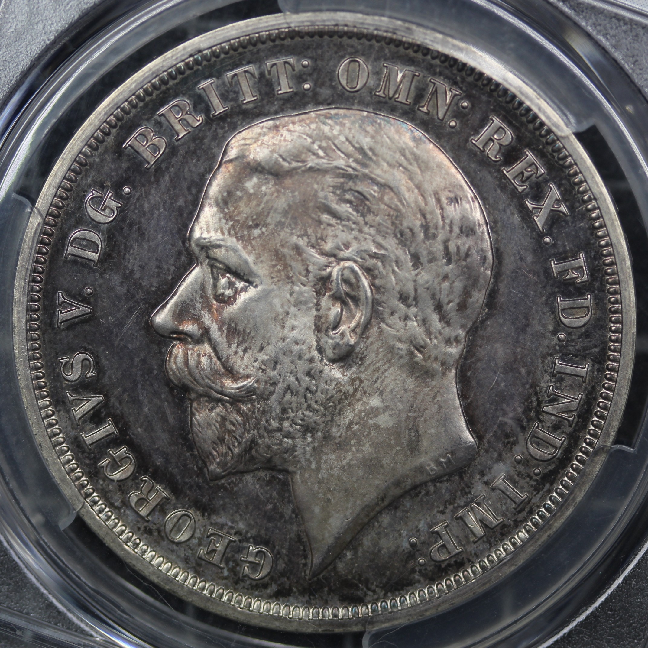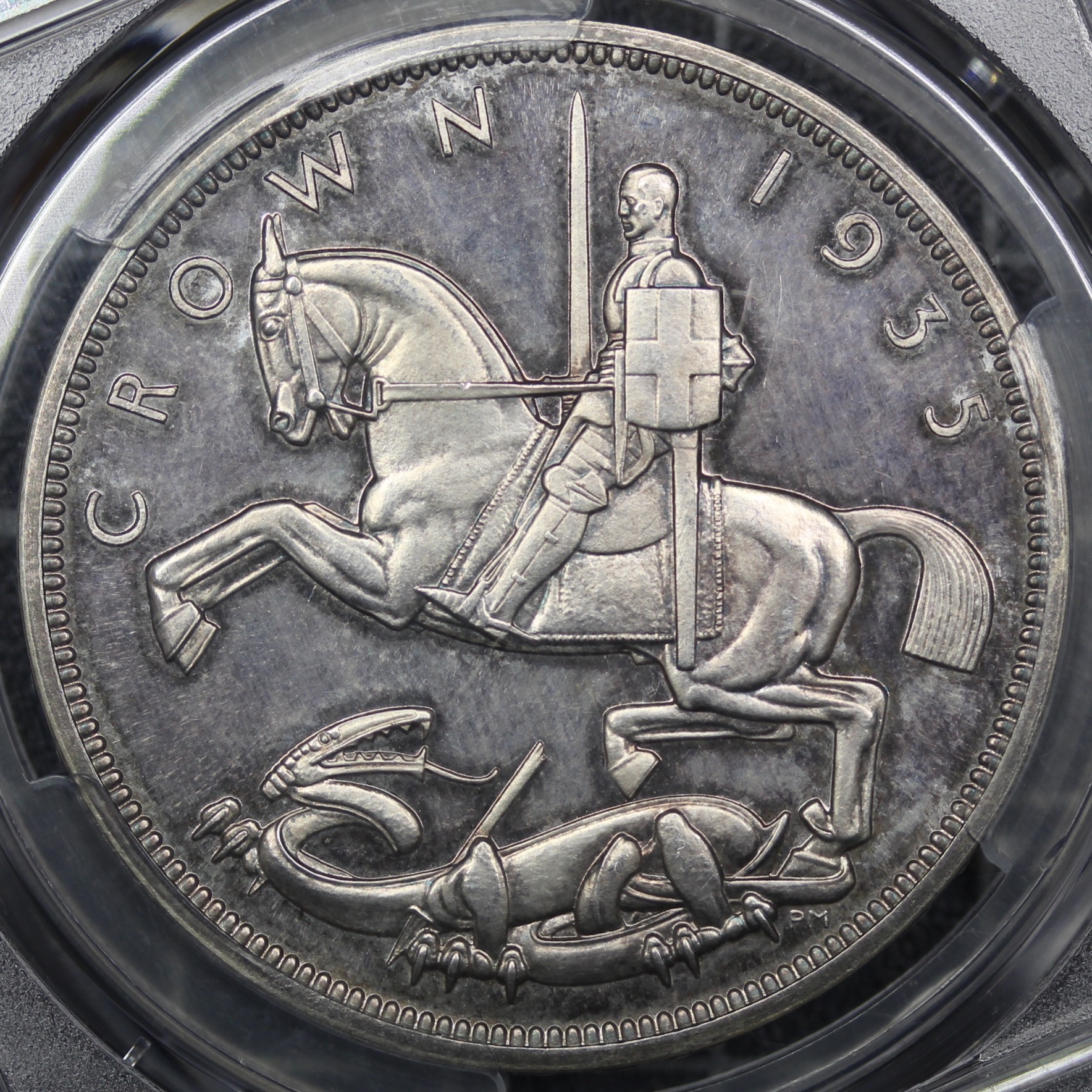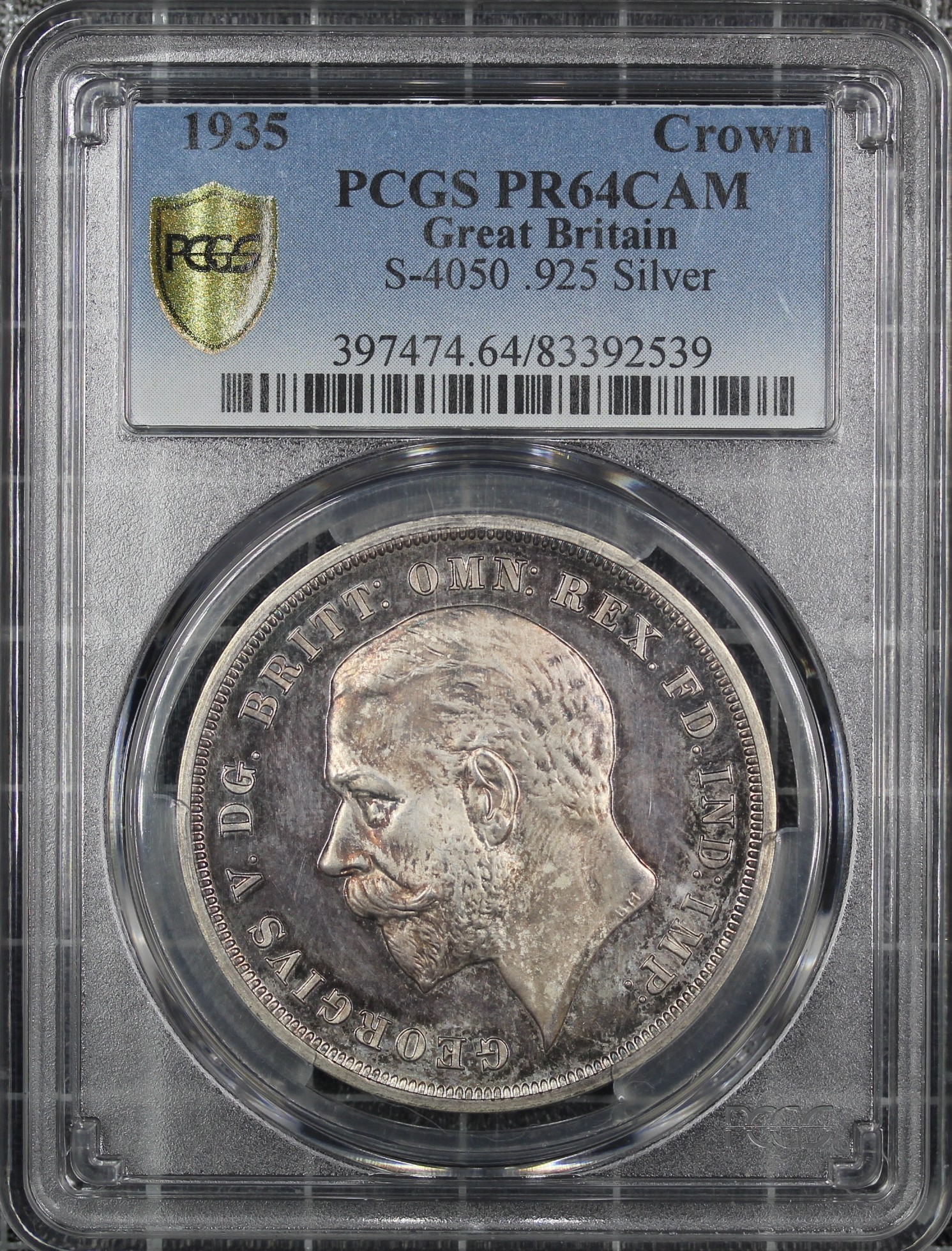 1935 Raised Edge Proof Crown, George V (ESC 378, Bull 3655, S.4048). Graded PCGS PF64 Cameo. Some light handling evident and may possibly benefit from conservation however irrespective a choice example with underlying toning.