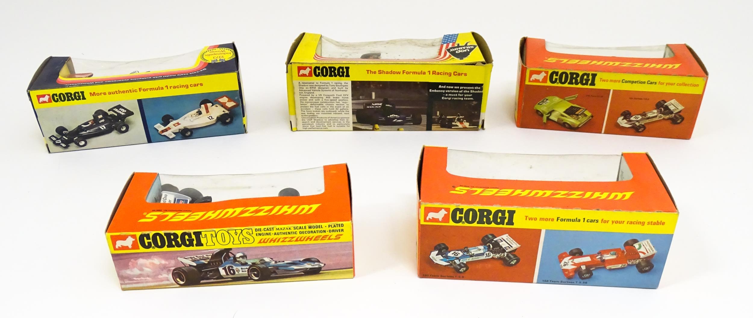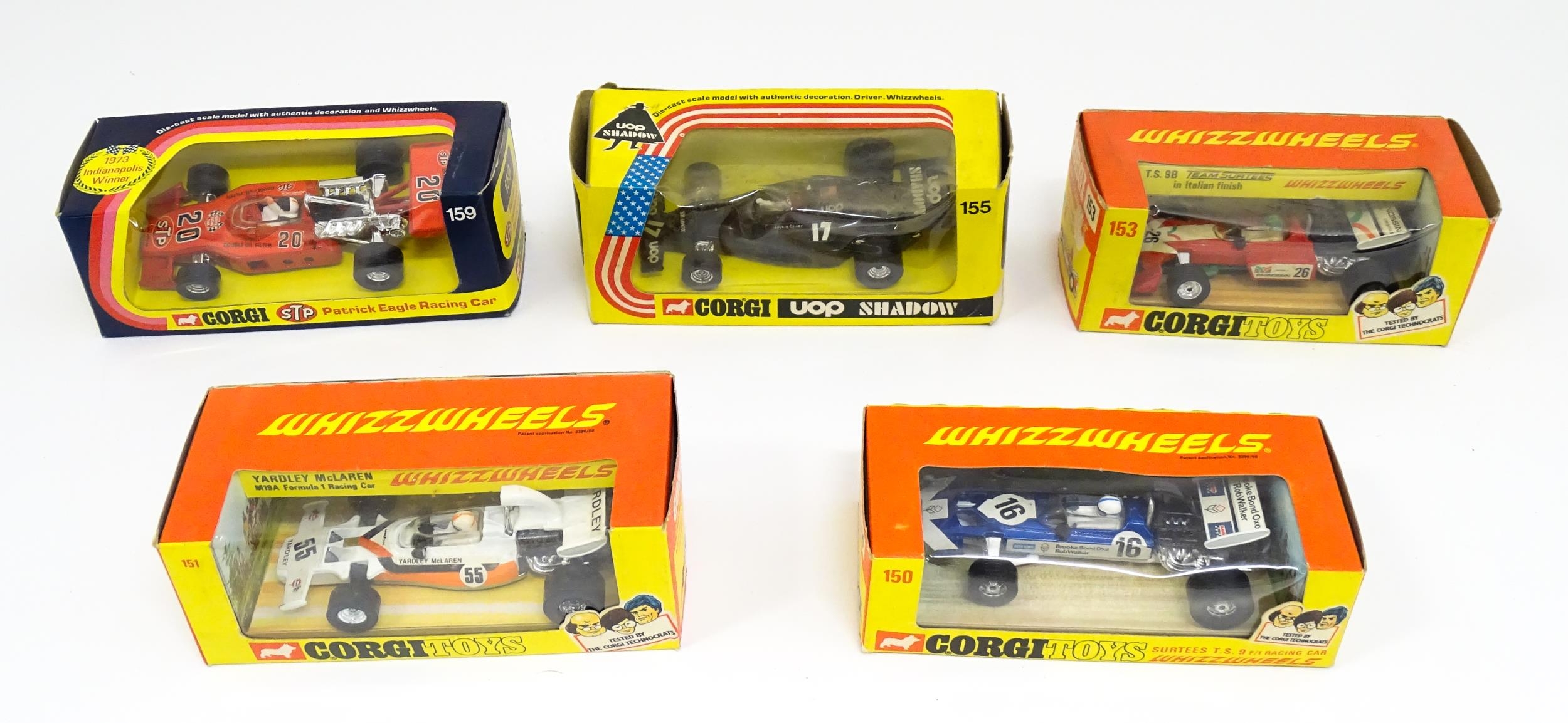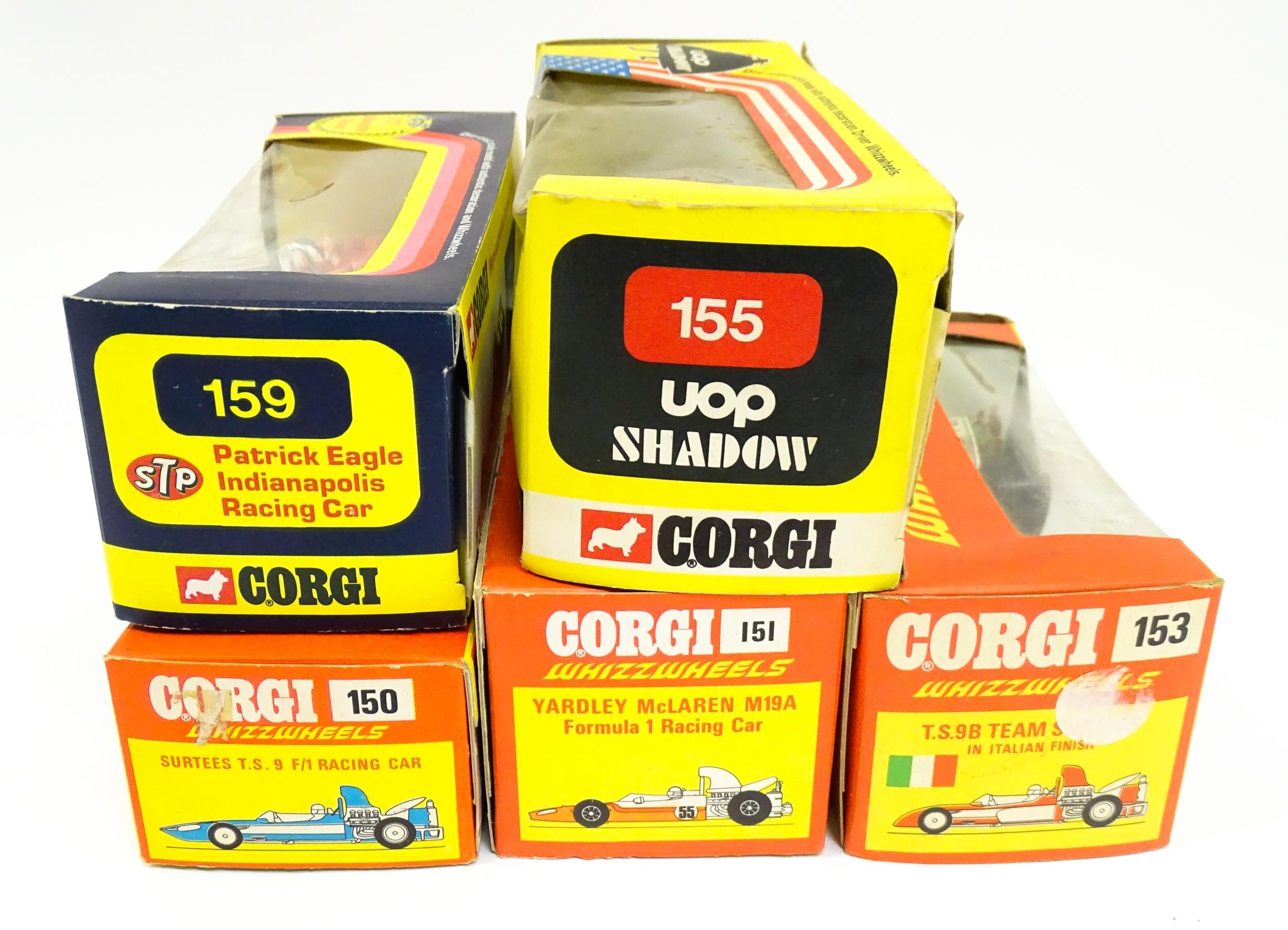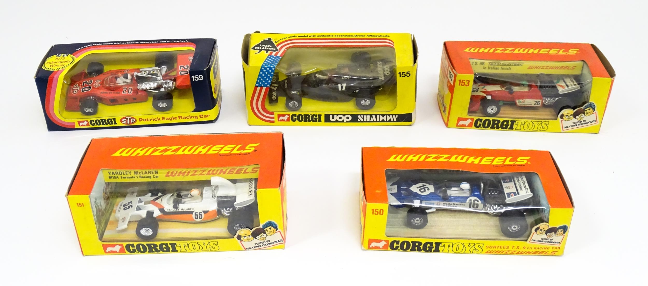 Toys: Five Corgi Toys die cast scale model Whizz Wheely racing cars comprising Surtees T. S. 9 F/1 Racing Car no. 150, Yardley McLaren M19A Formula 1 Racing Car no. 151, T. S. 9B Team Surtees no. 153, UOP Shadow F1 Racing Car no. 155, and Patrick Eagle Indianapolis Racing Car no. 159. Boxed. (5)