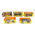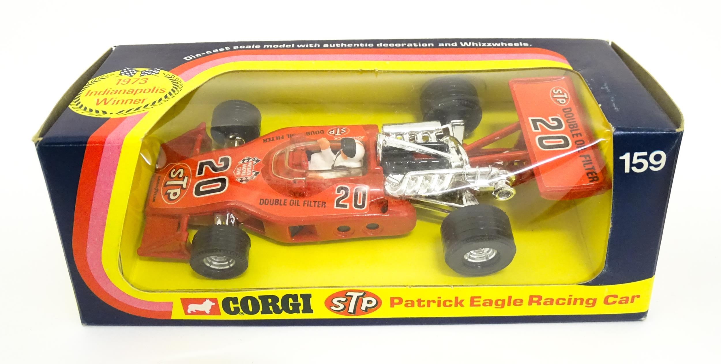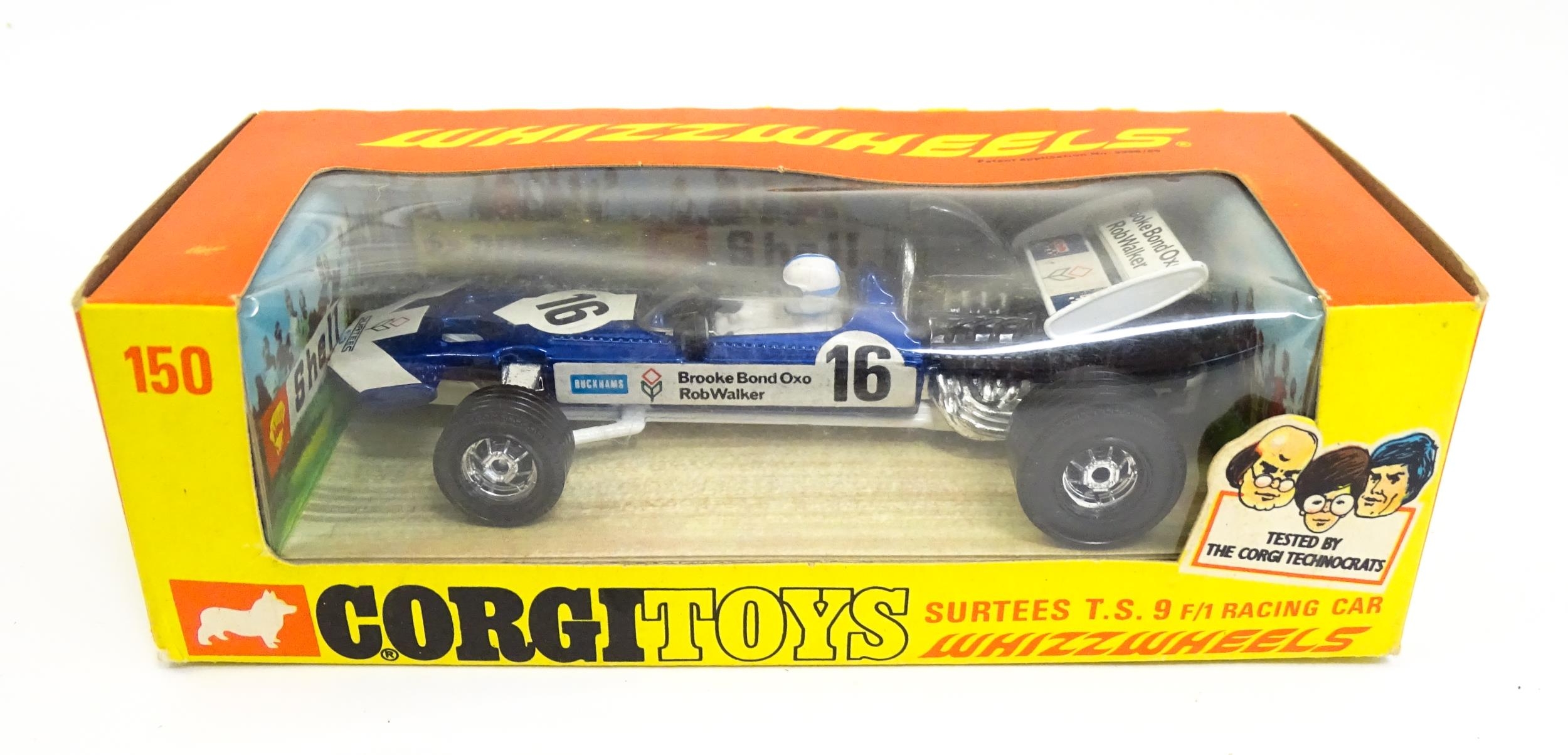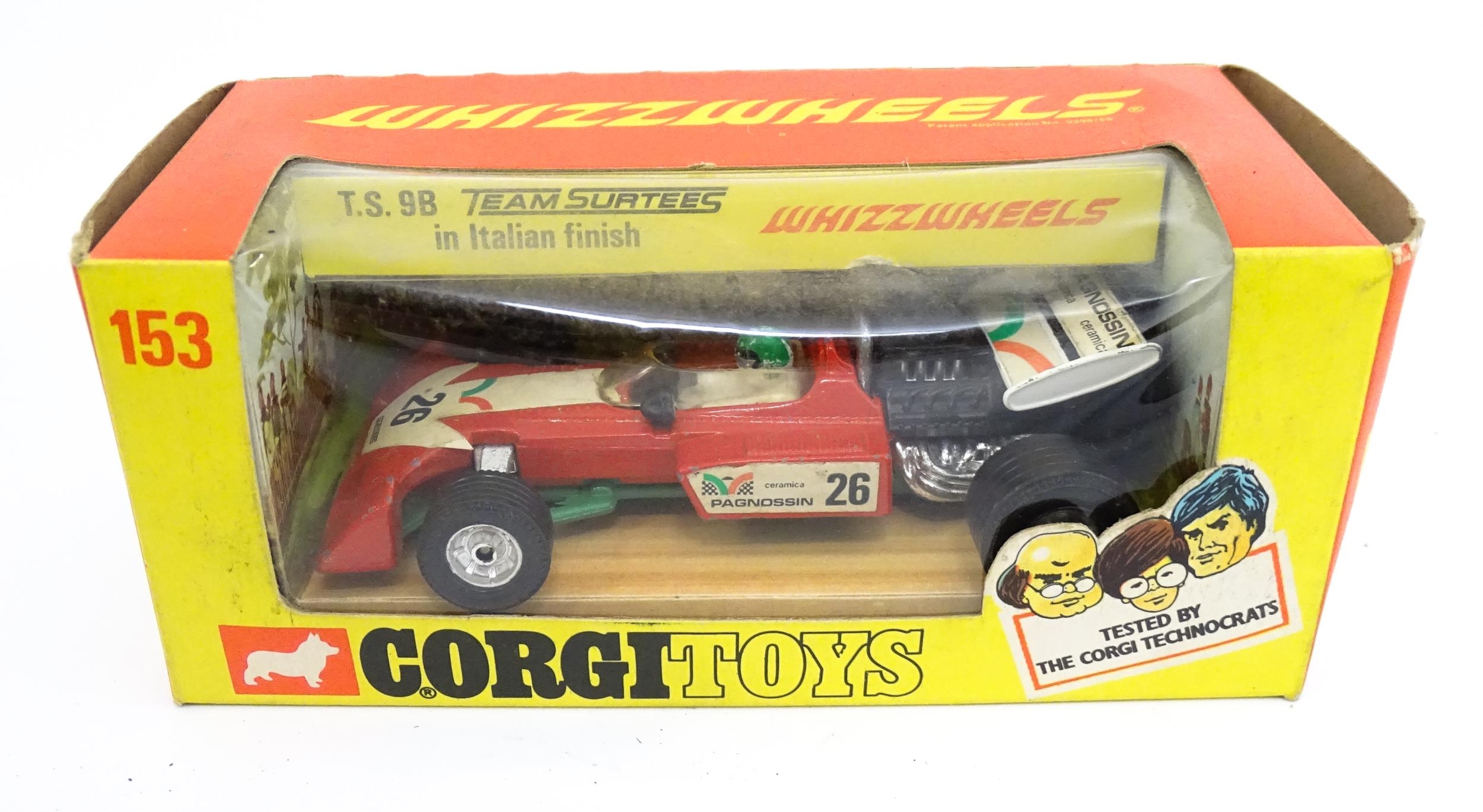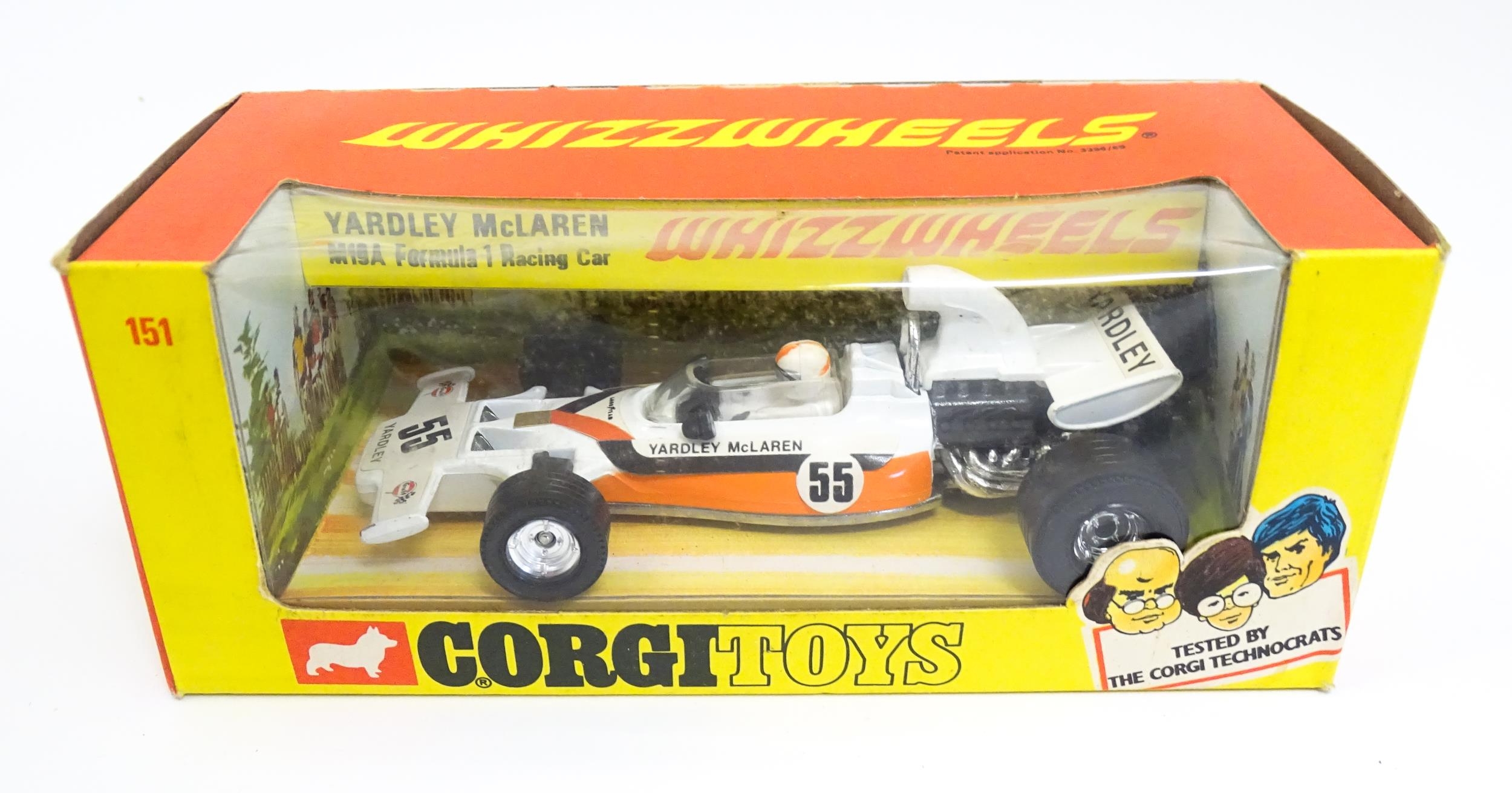 Toys: Five Corgi Toys die cast scale model Whizz Wheely racing cars comprising Surtees T. S. 9 F/1 Racing Car no. 150, Yardley McLaren M19A Formula 1 Racing Car no. 151, T. S. 9B Team Surtees no. 153, UOP Shadow F1 Racing Car no. 155, and Patrick Eagle Indianapolis Racing Car no. 159. Boxed. (5)