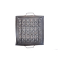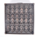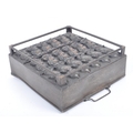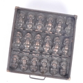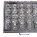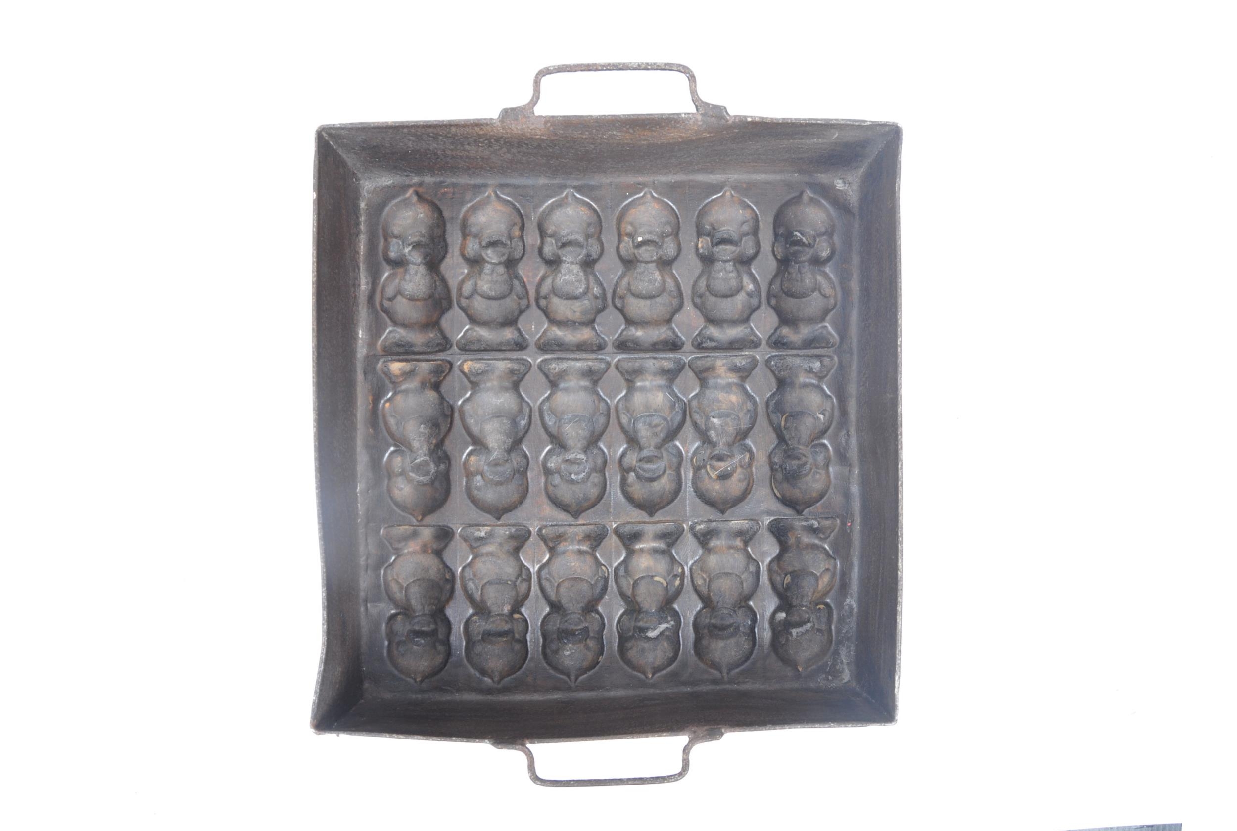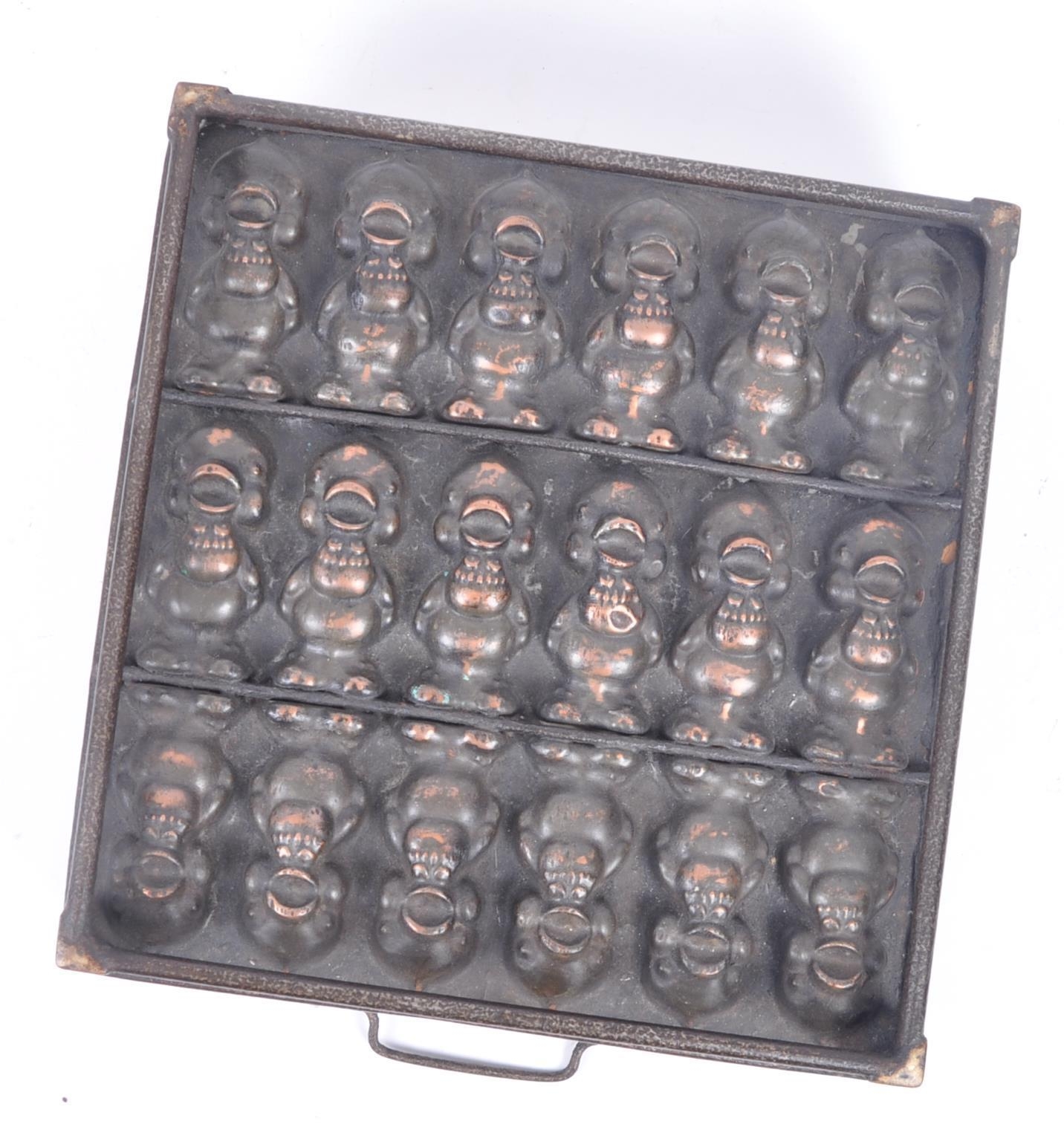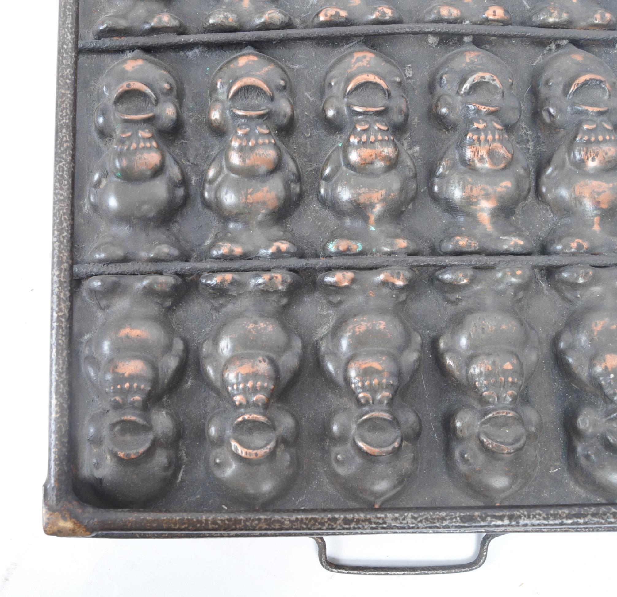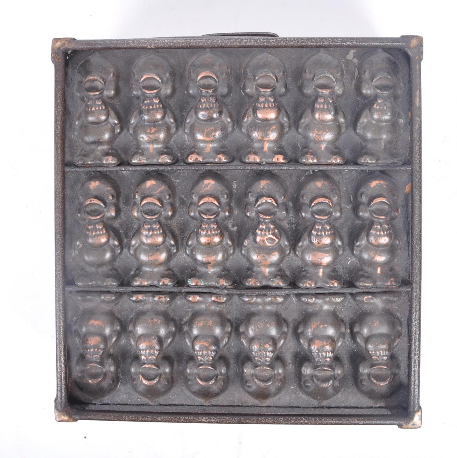 A retro 20th century copper and cast iron chocolate mould, featuring three lines of chirping chicks / birds / chickens, six to each line. Birds are copper, with the frame and handles of the mould cast iron. Measures approx. 36cm x 35cm x 15cm.