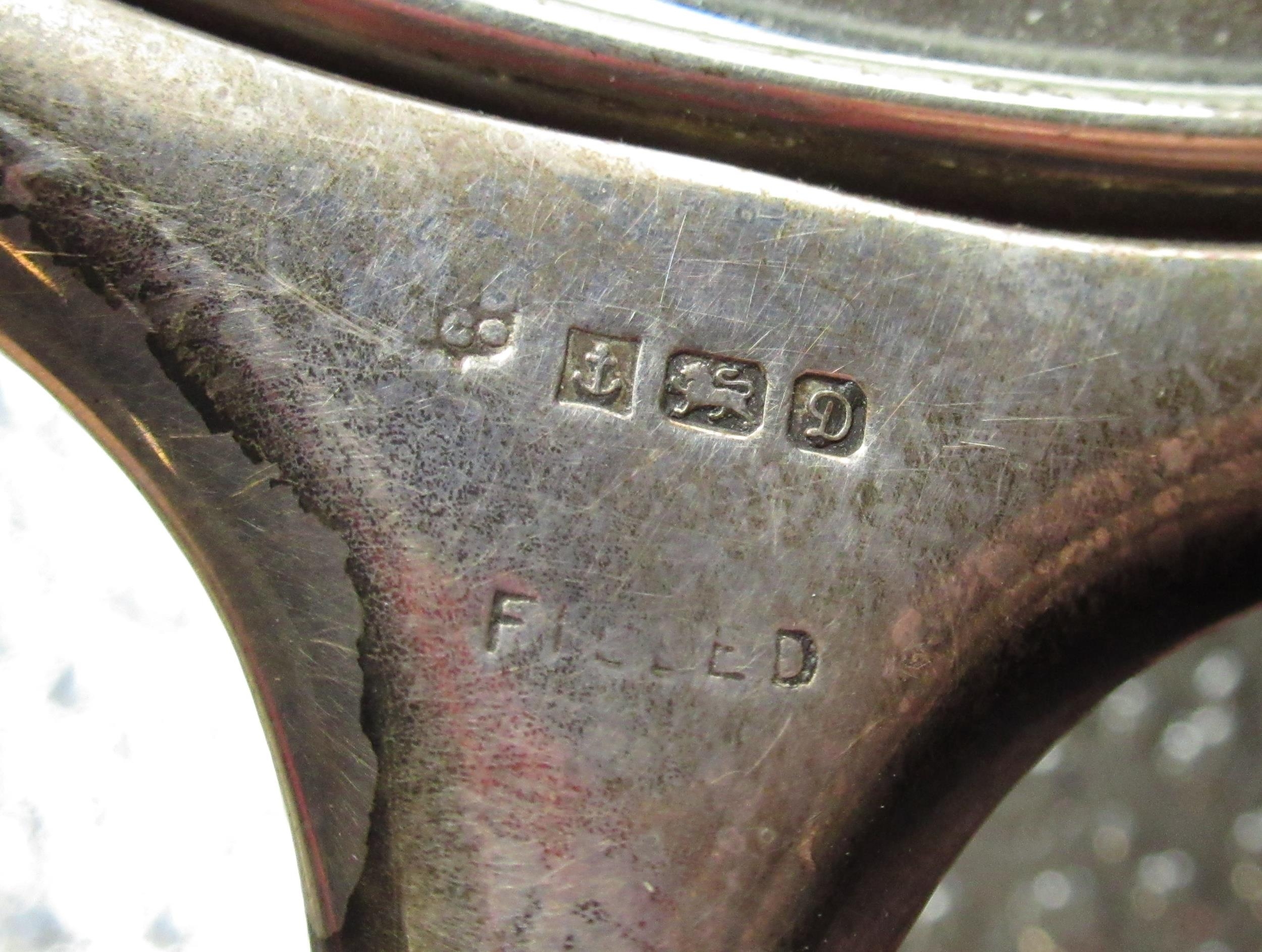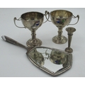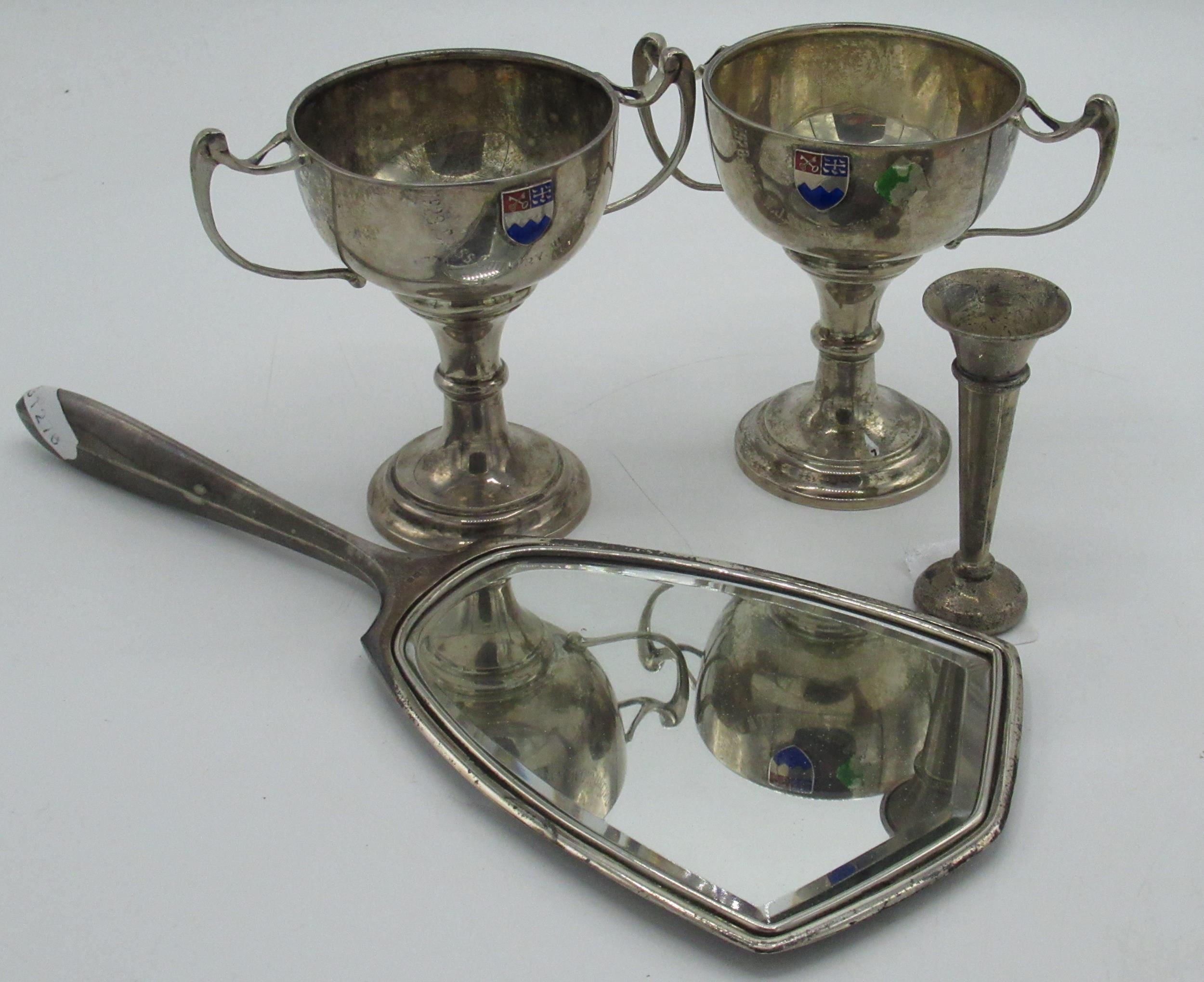 Geo.V hallmarked Sterling silver miniature prize cup inscribed 'Cross-Country, W.J. Stirling, 1928'; another, similar, to the same, H10cm, an engine turned hallmarked Sterling silver backed hand mirror, and posy vase by L J Millington, Birmingham, 1994, H8cm (4)