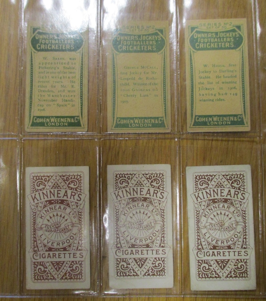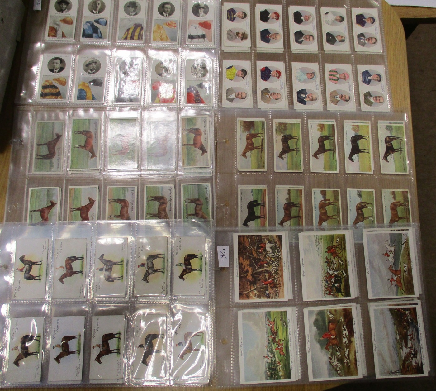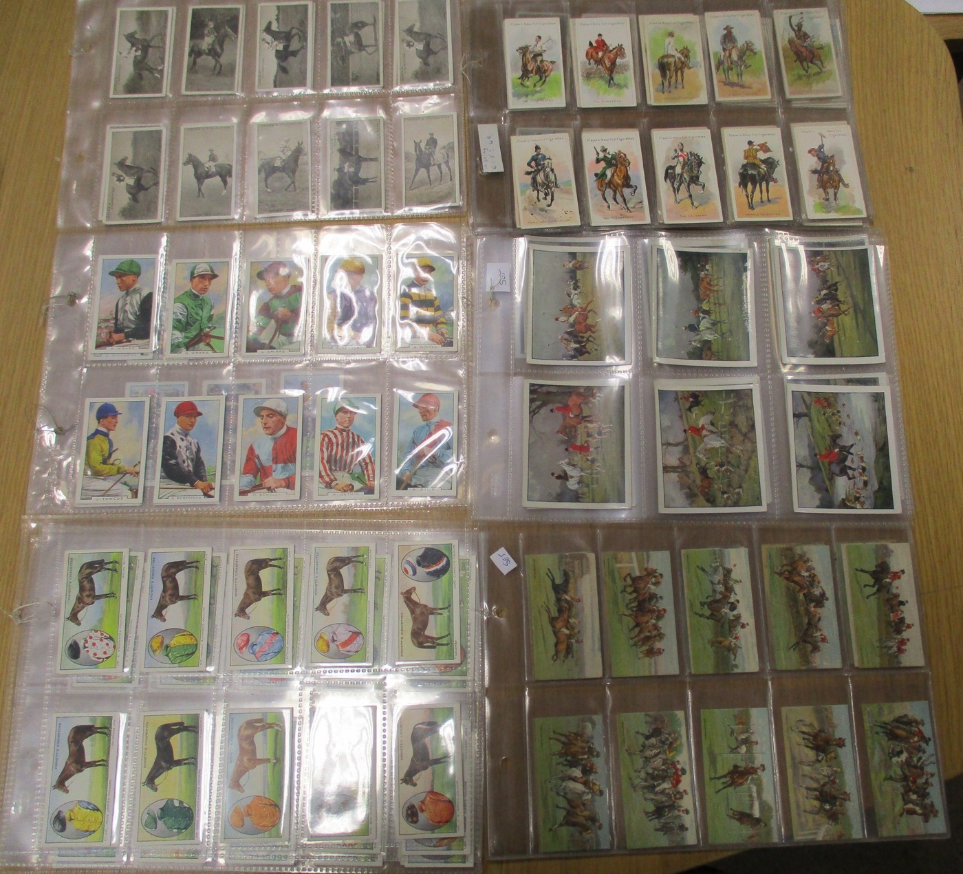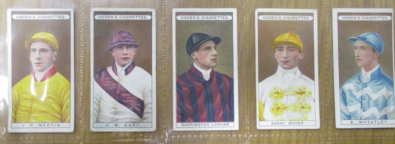 Collection in plastic sleeves with complete sets including Carreras Horses & Hounds, Races Historic & Modern, Hignett Prominent Racehorses of 1933, Ogdens Derby Entrants, useful odds including Kinnear Jockeys (Tod Sloan), (large (2)), Taddy Famous Jockeys (with frame (1)), plus ranges from C. Weenen, Faulkner, L&B, Players, Wills Scissors, etc, generally good. Qty 320 approx (B)