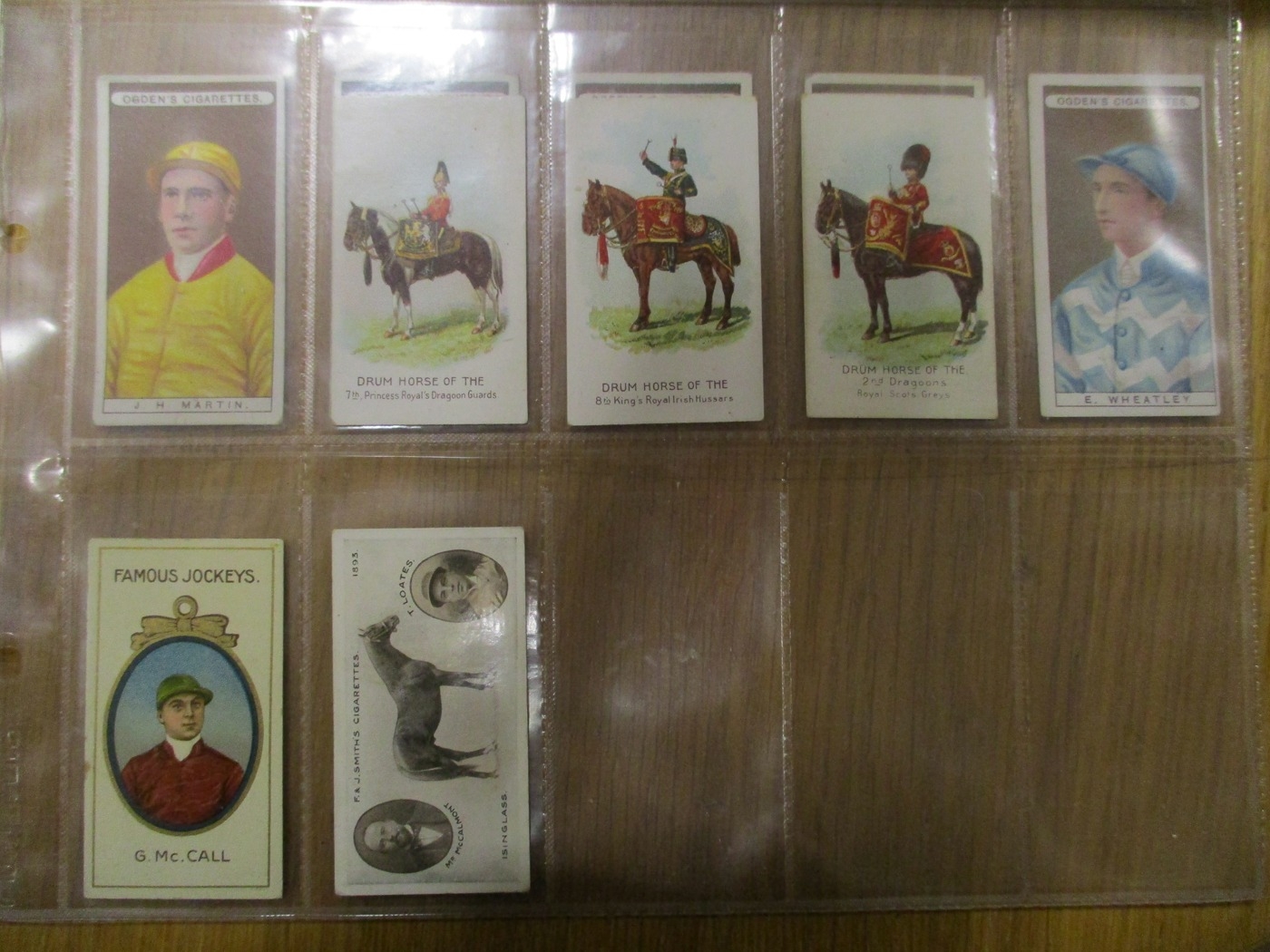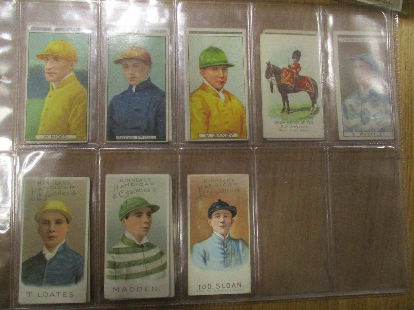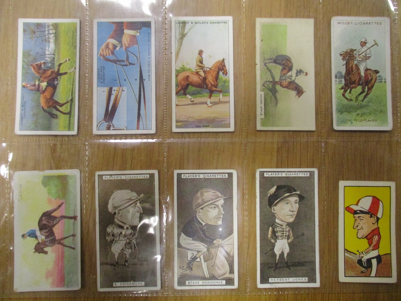 Collection in plastic sleeves with complete sets including Carreras Horses & Hounds, Races Historic & Modern, Hignett Prominent Racehorses of 1933, Ogdens Derby Entrants, useful odds including Kinnear Jockeys (Tod Sloan), (large (2)), Taddy Famous Jockeys (with frame (1)), plus ranges from C. Weenen, Faulkner, L&B, Players, Wills Scissors, etc, generally good. Qty 320 approx (B)