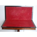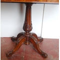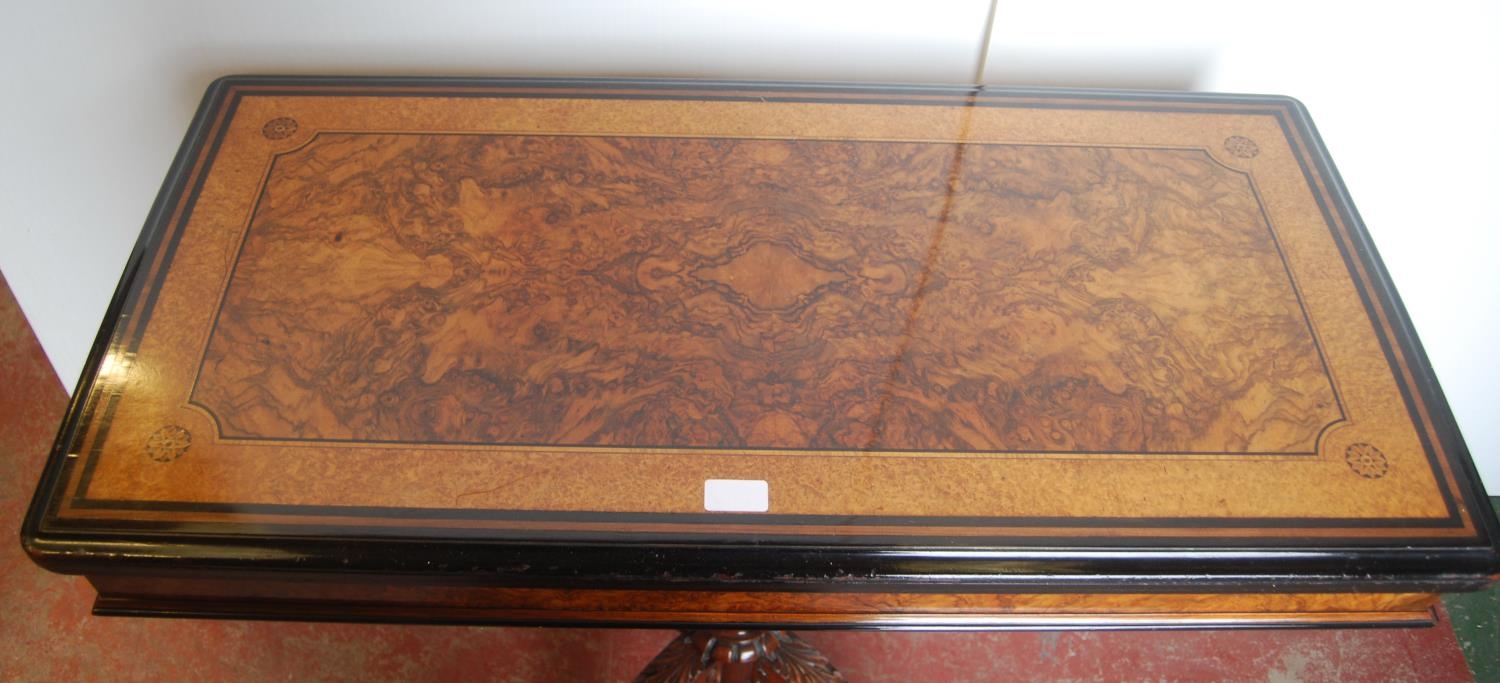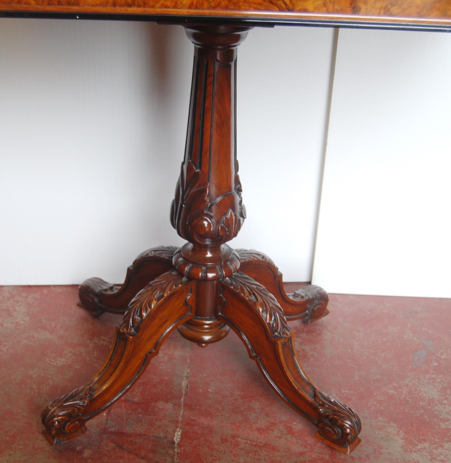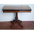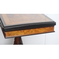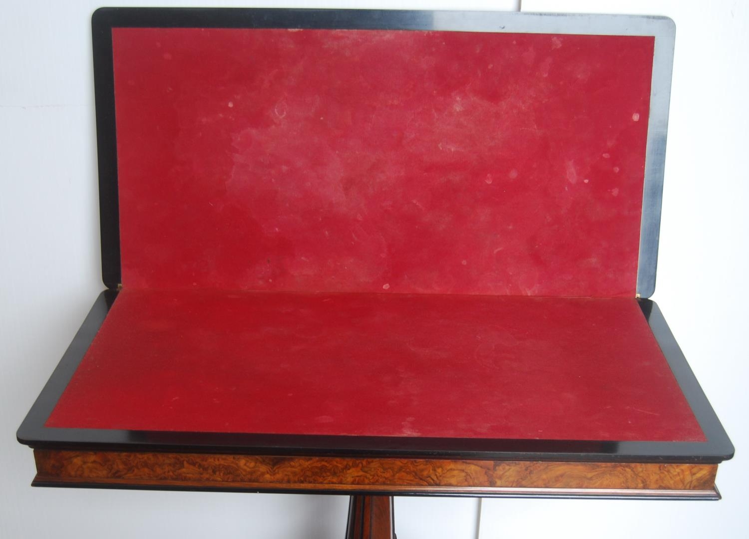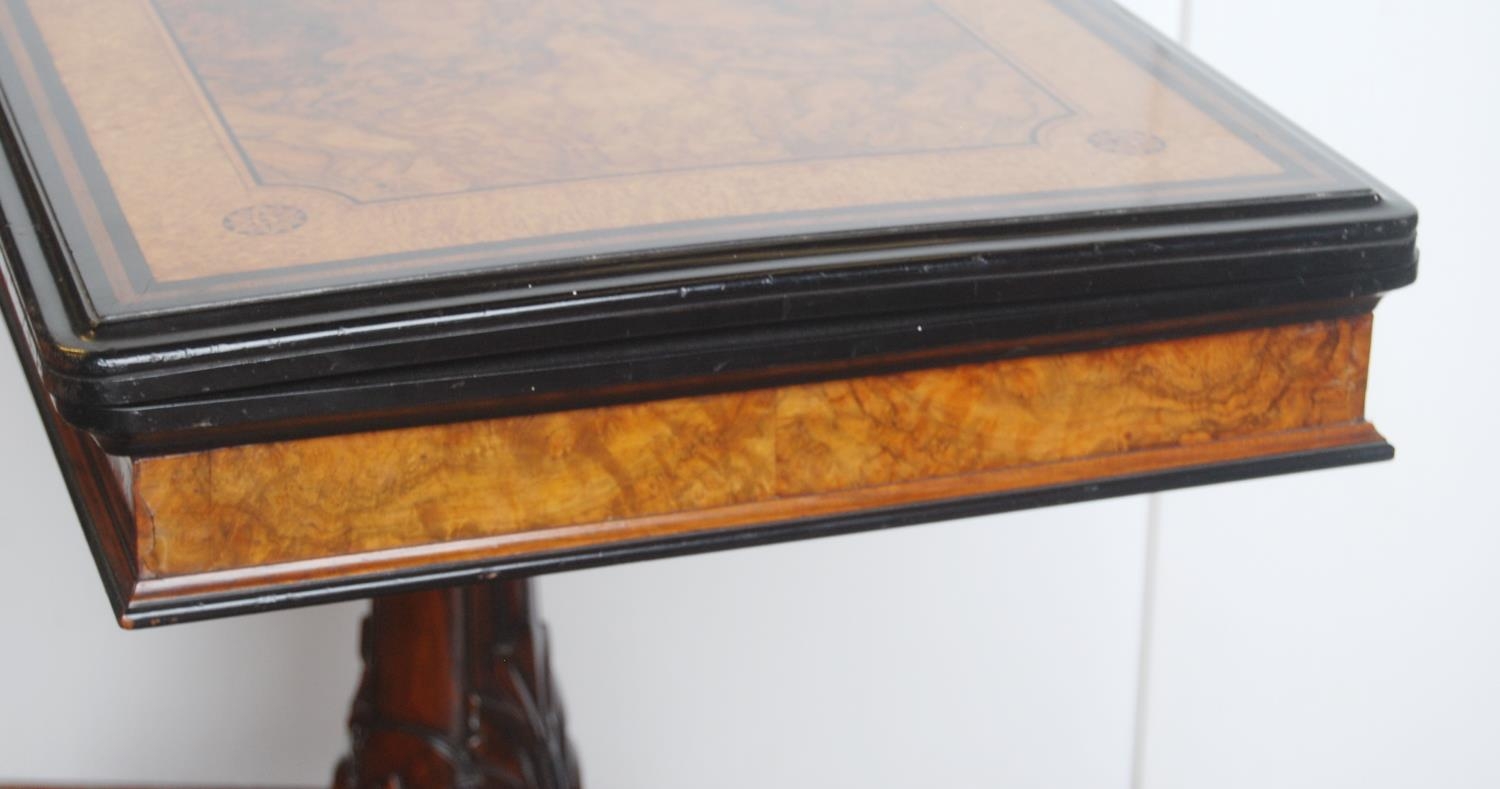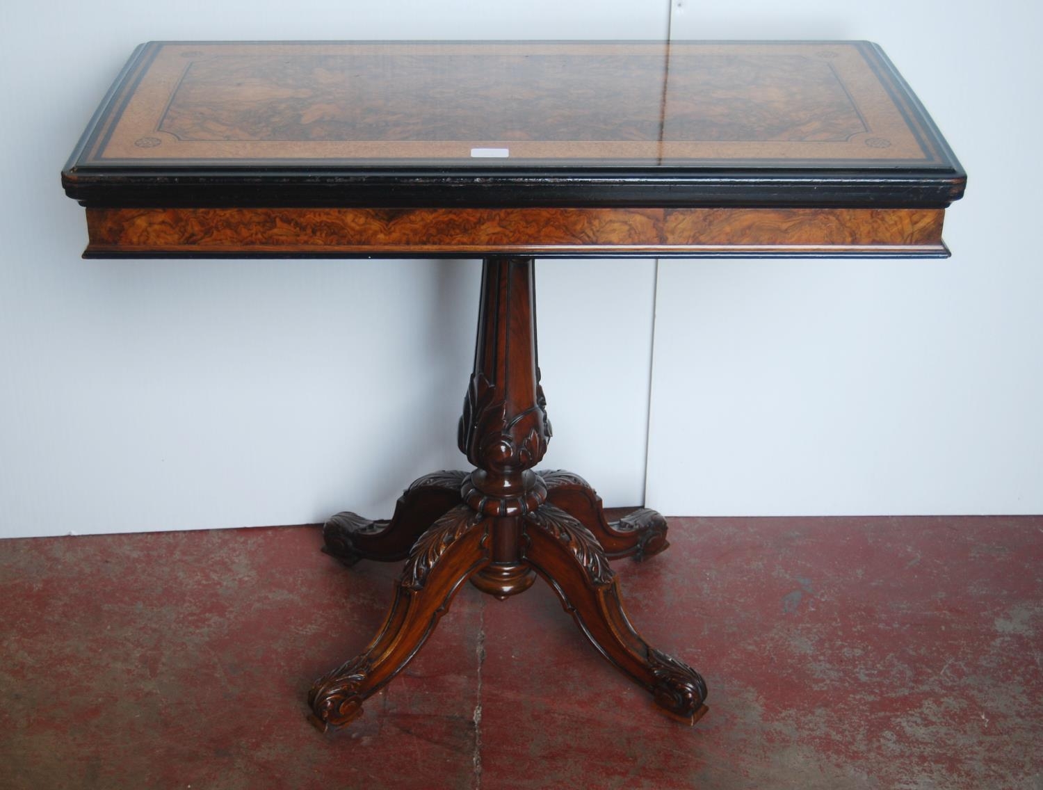 Victorian inlaid walnut and ebonised card table in the Aesthetic manner, the swivel fold-over top enclosing a later red baize-lined interior, on a tapered column and quadripartite supports, the supports carved with acanthus leaves, on castors, 75cm high, 92cm wide and 90cm long.