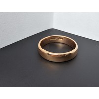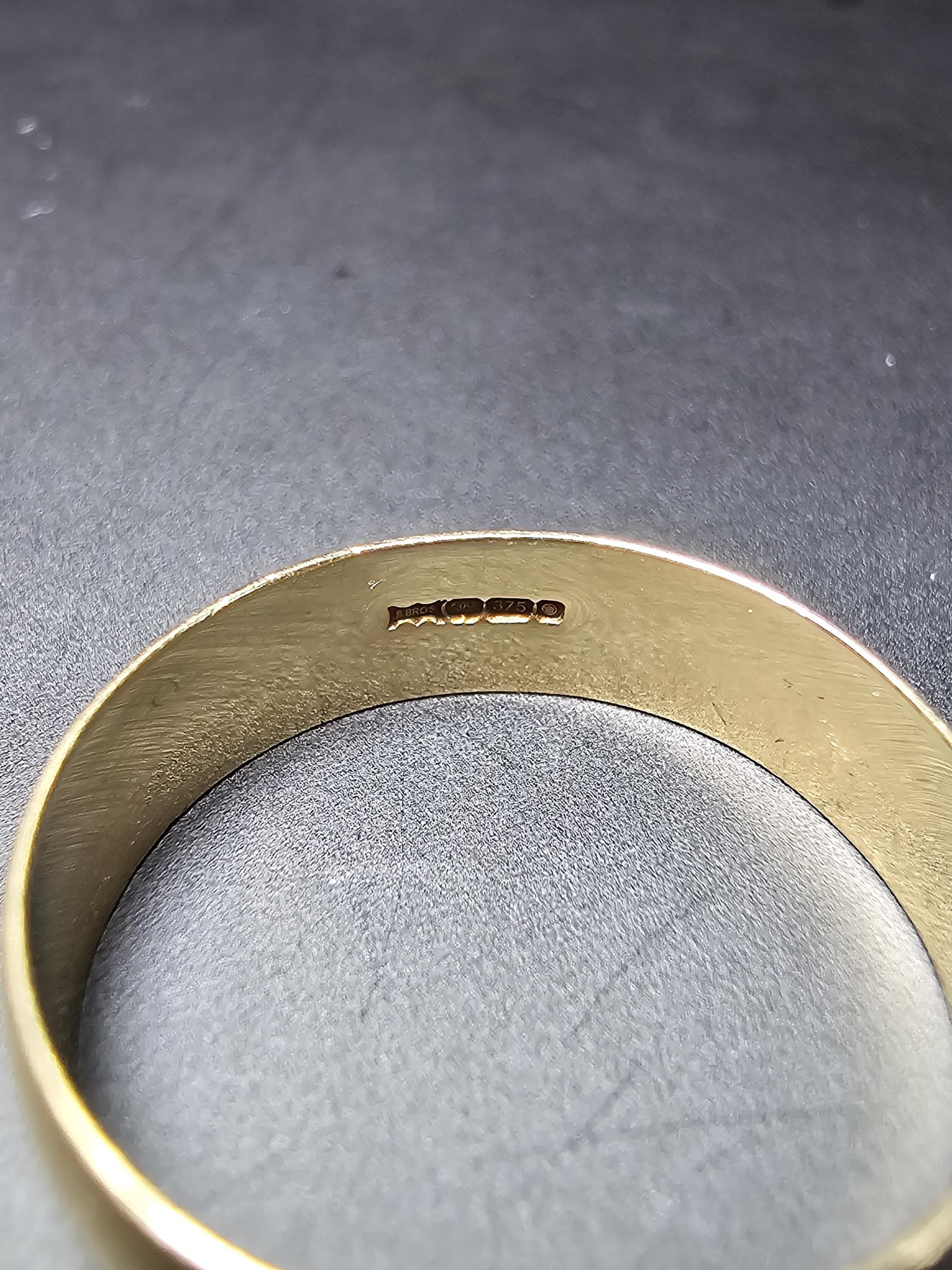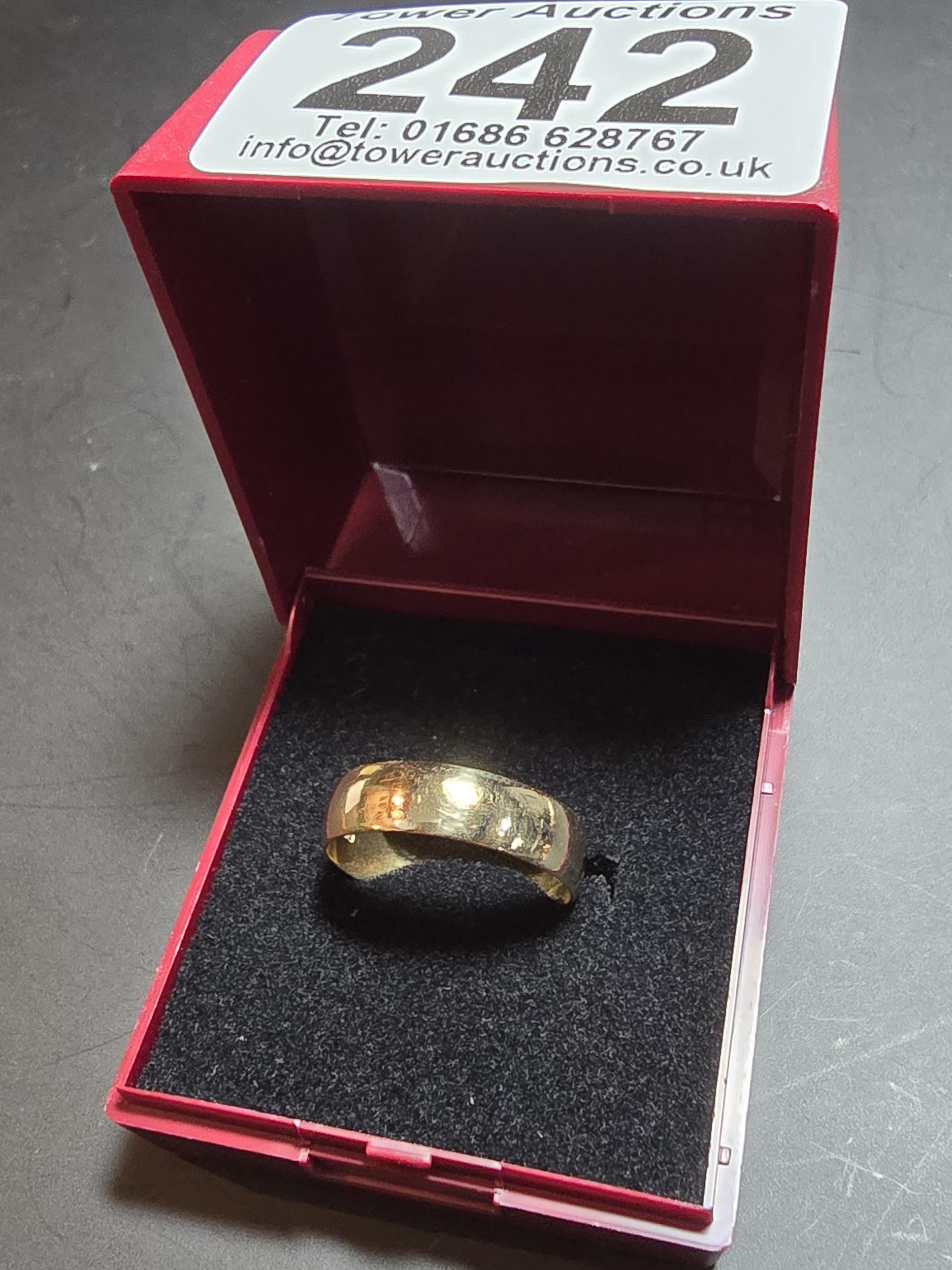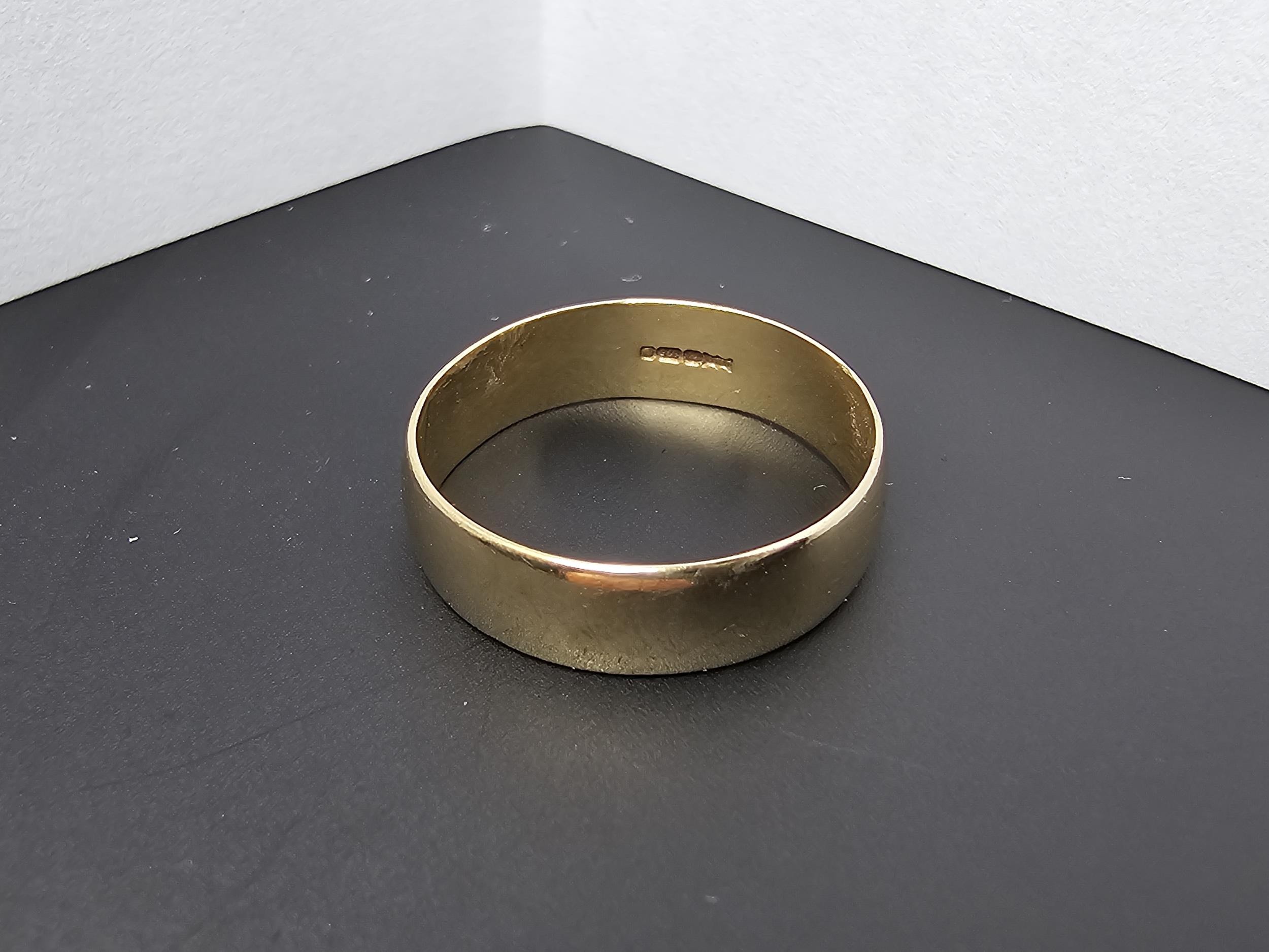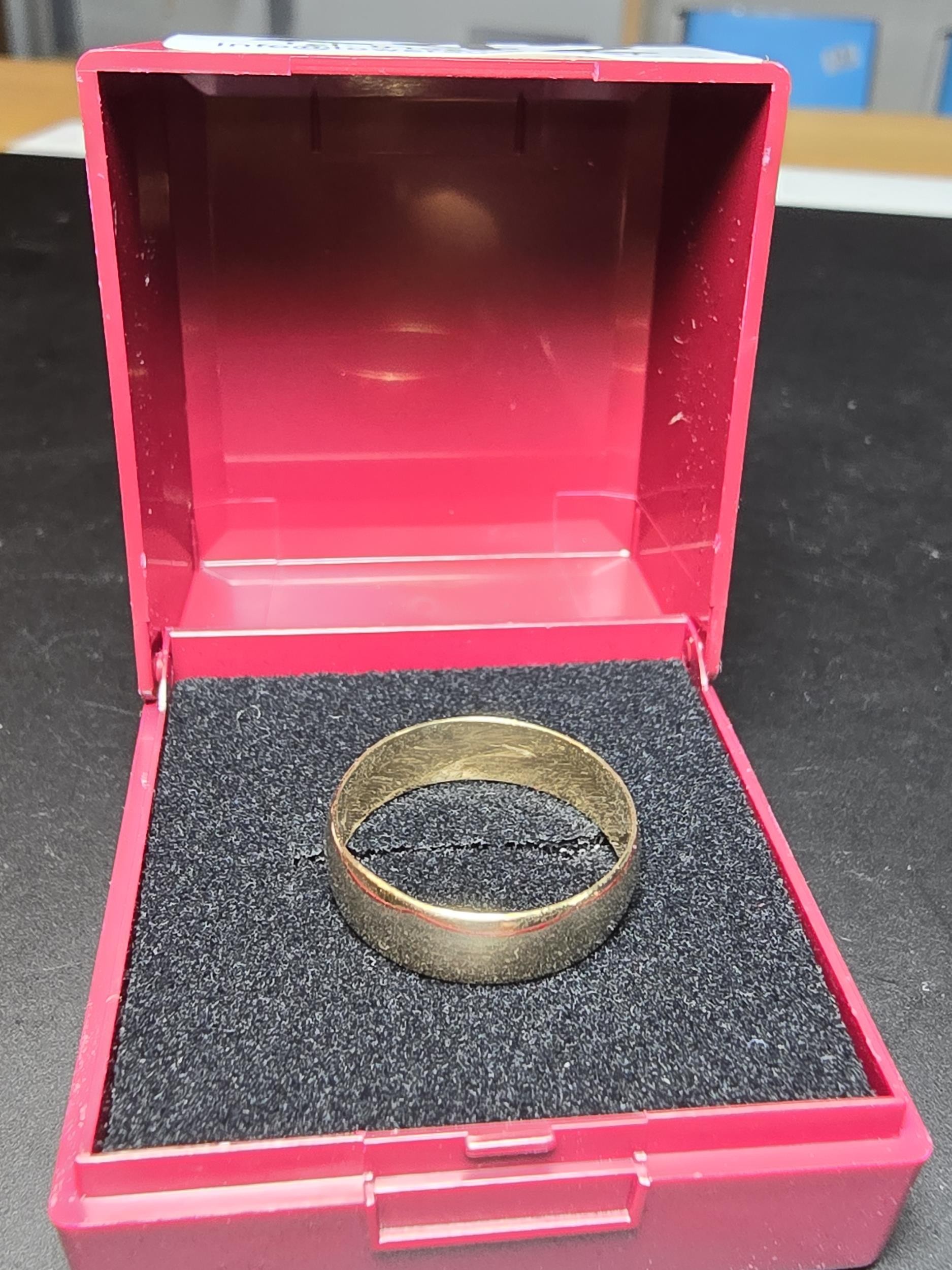Clean hallmarked 9ct. yellow gold plain wedding band ring. In good looked after condition. Complete with presentation box. Size O 1/2, weight 2.15g.