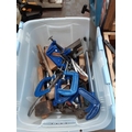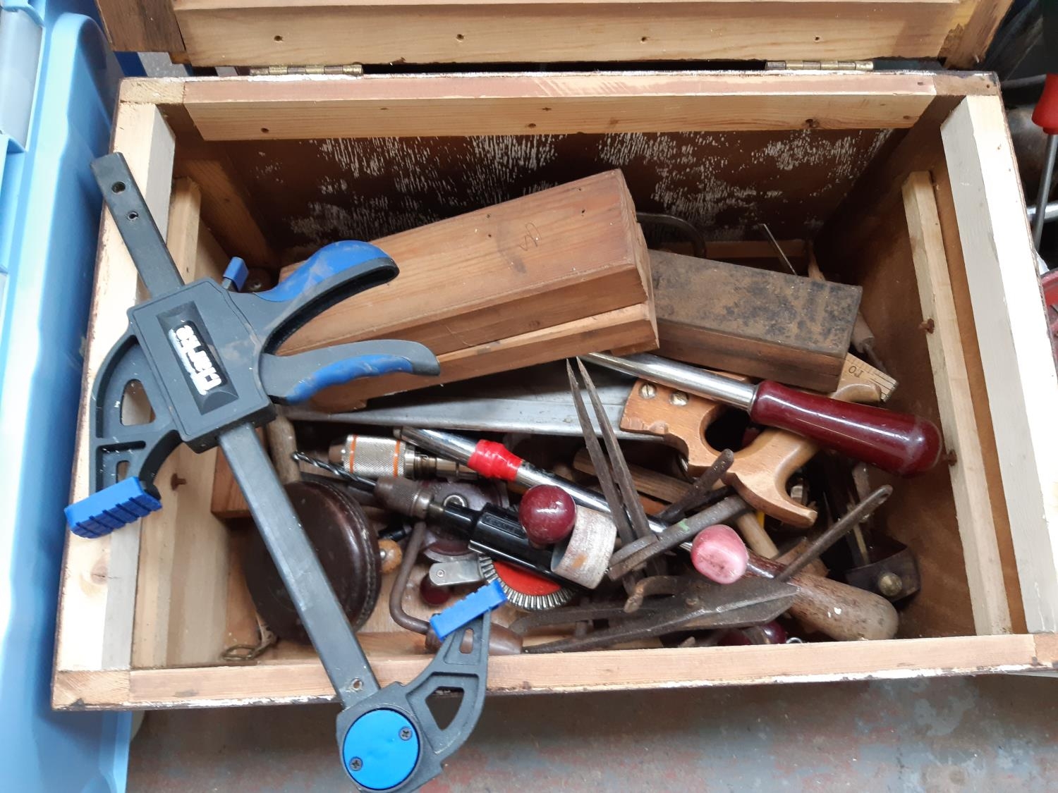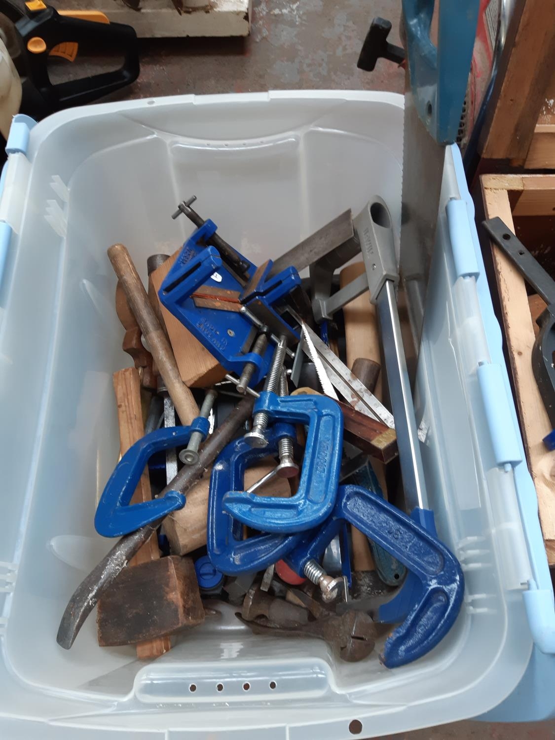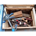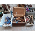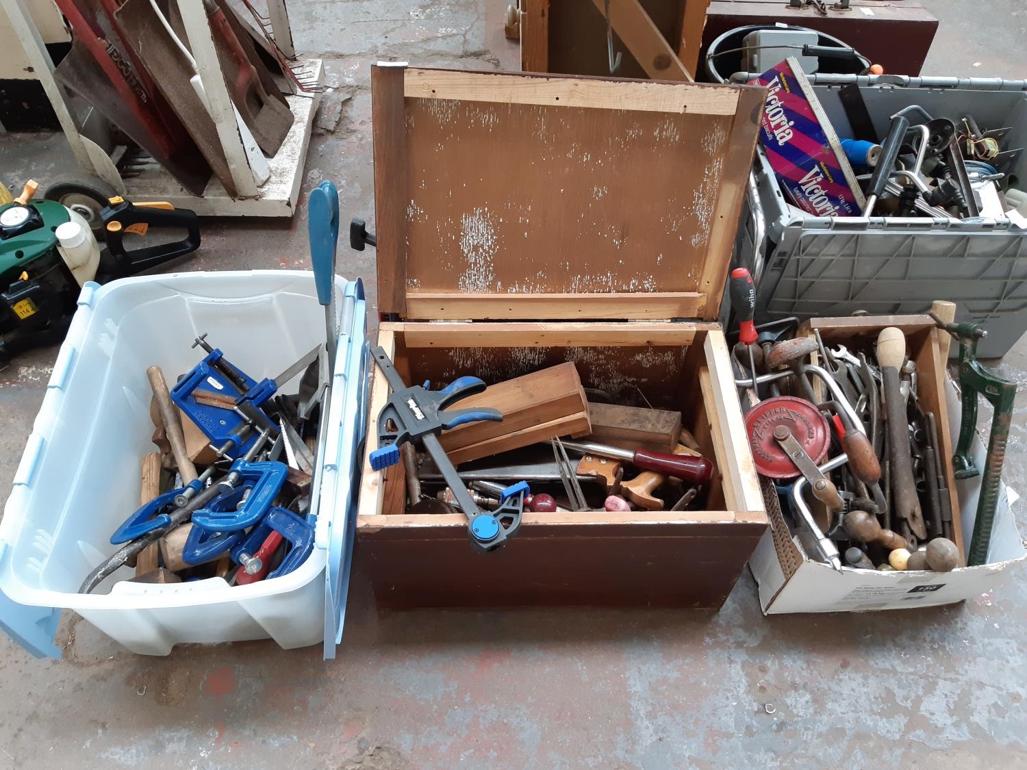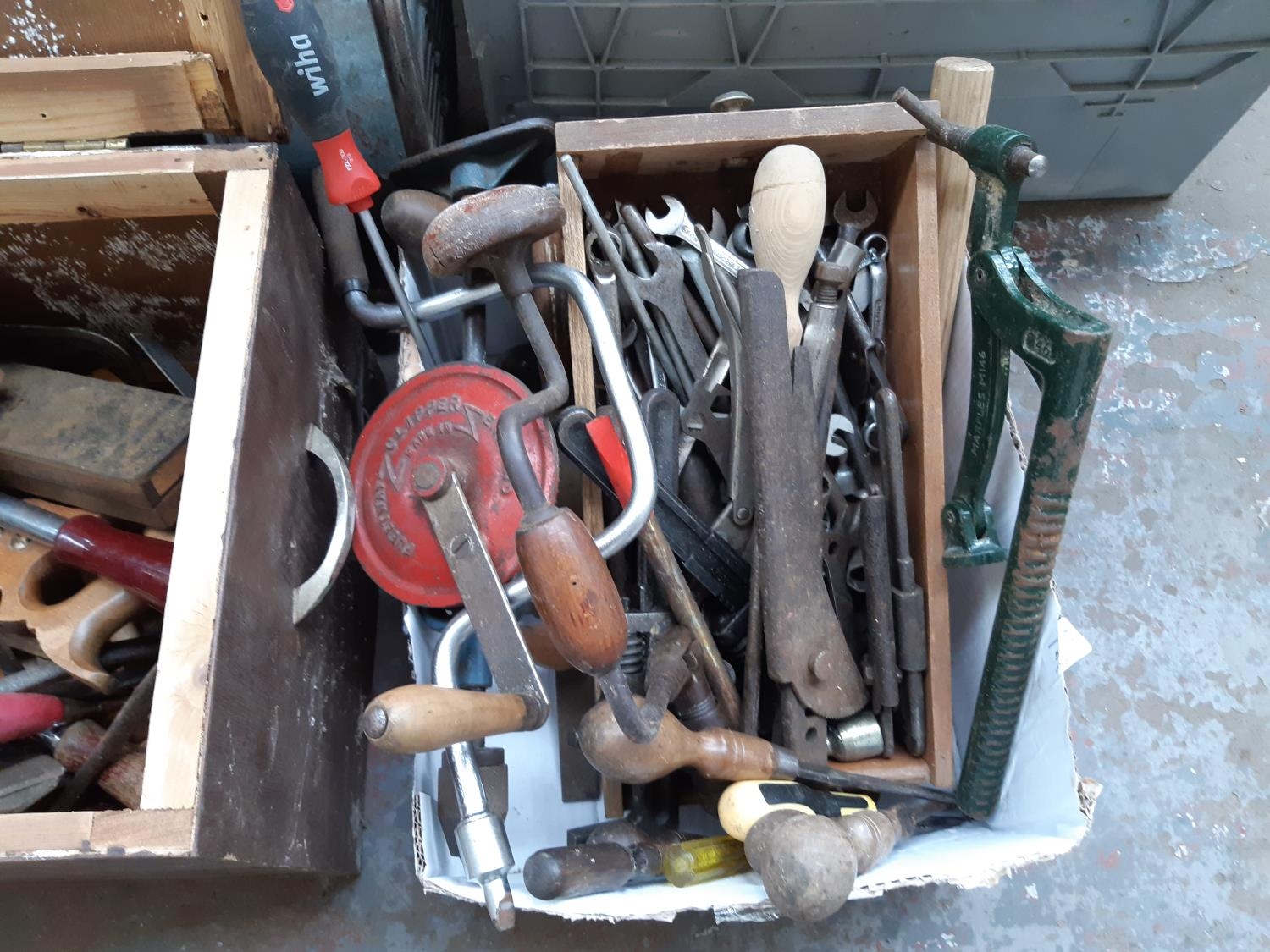 THREE BOXES OF GOOD QUALITY HAND TOOLS TO INCLUDE CLIPPER HAND DRILL, STANLEY RATCHET SCREWDRIVER, HOCKLEY LEATHER TAPE MEASURE, DRILL BRACES, DRAPER G-CLAMPS, TENON SAWS, SCREWDRIVERS, SPANNERS ETC.