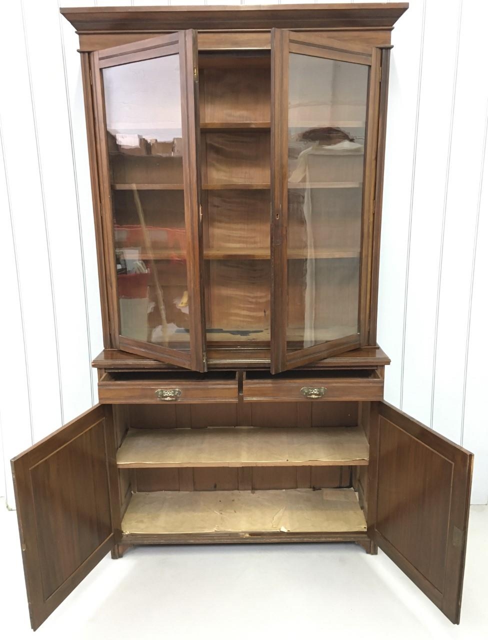 A tall, Edwardian Library Bookcase. Three-shelved, glazed cupboard over two drawers, over twin cupboard. Brass handles. No key present.