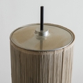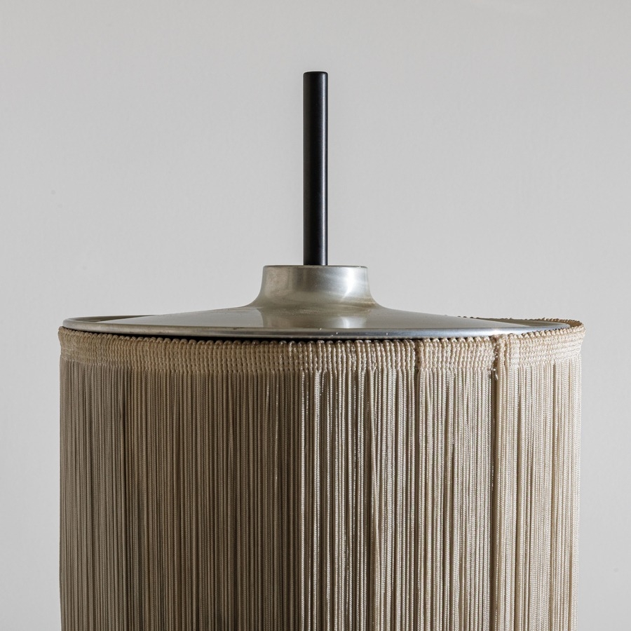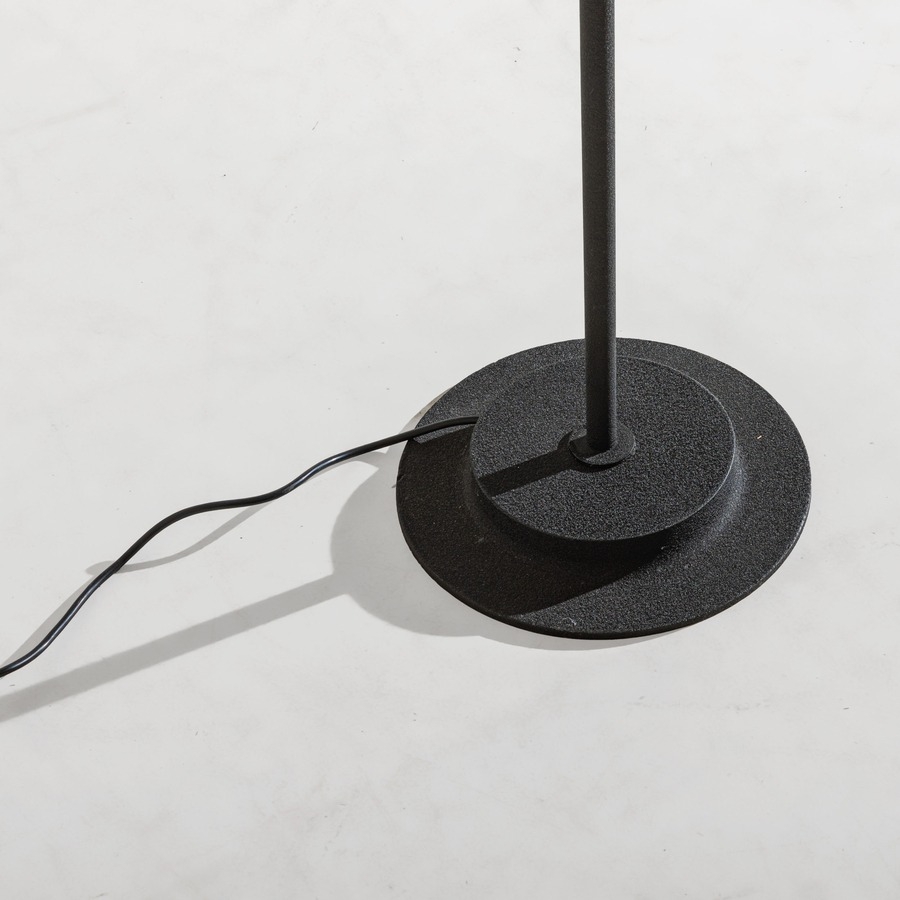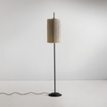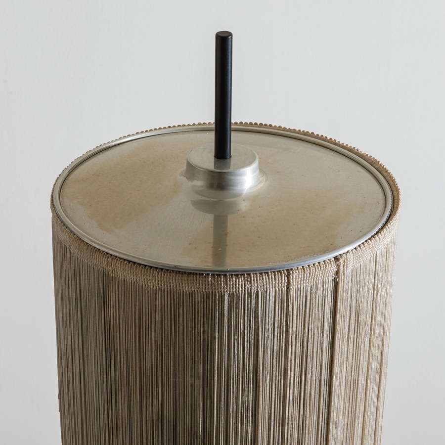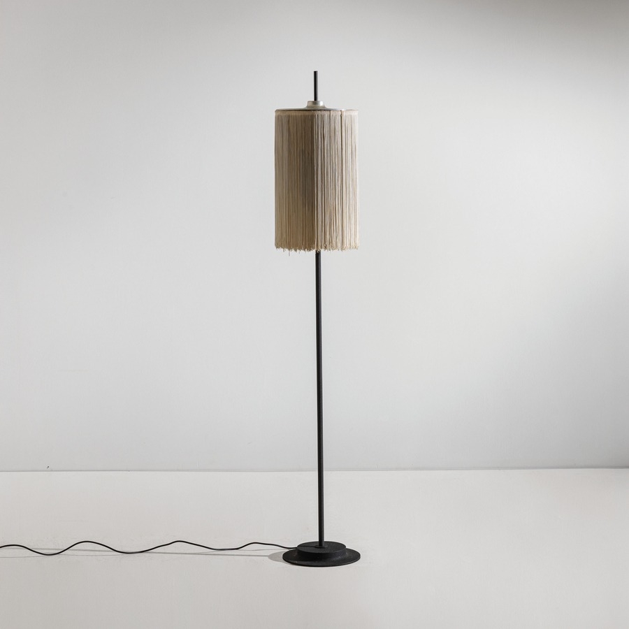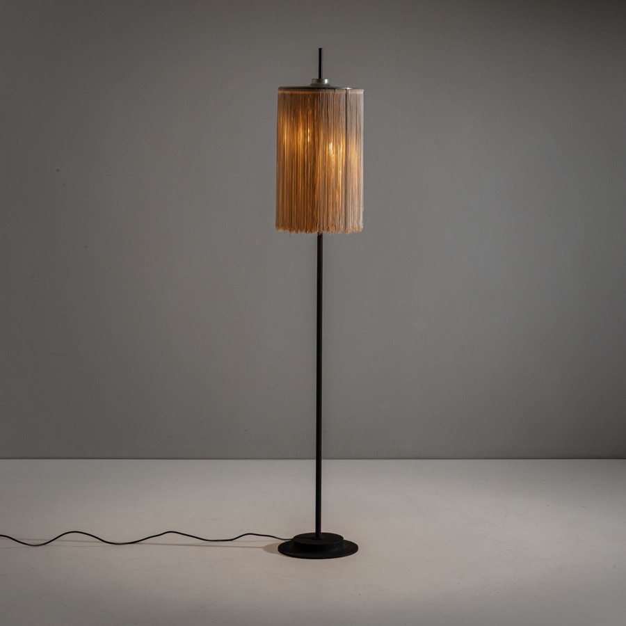 Lampada da terra mod. 1076/N. Metallo goffrato, alluminio lucidato, frangia sintetica. Produzione Arteluce anni '60. Decalcomania del produttore.