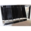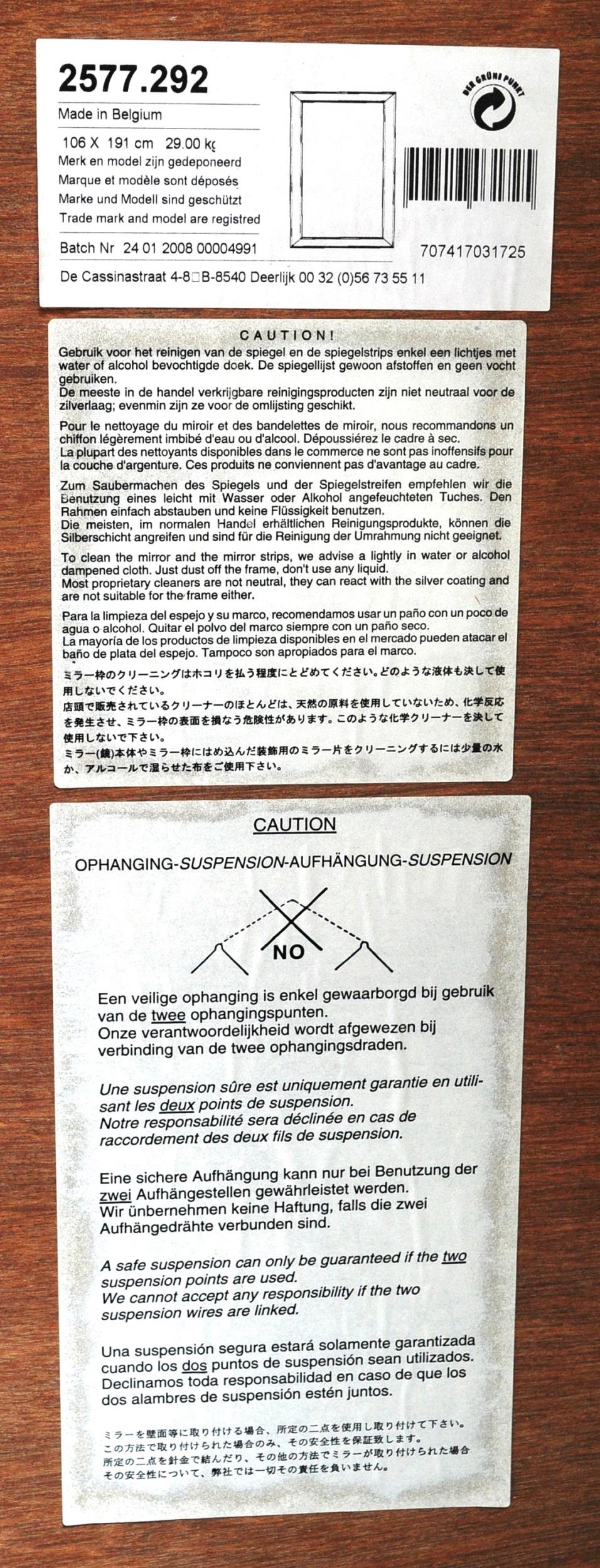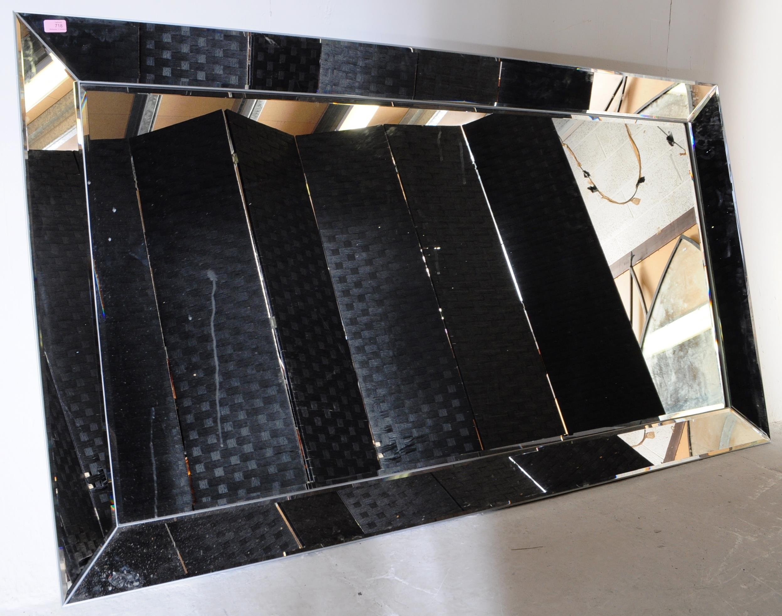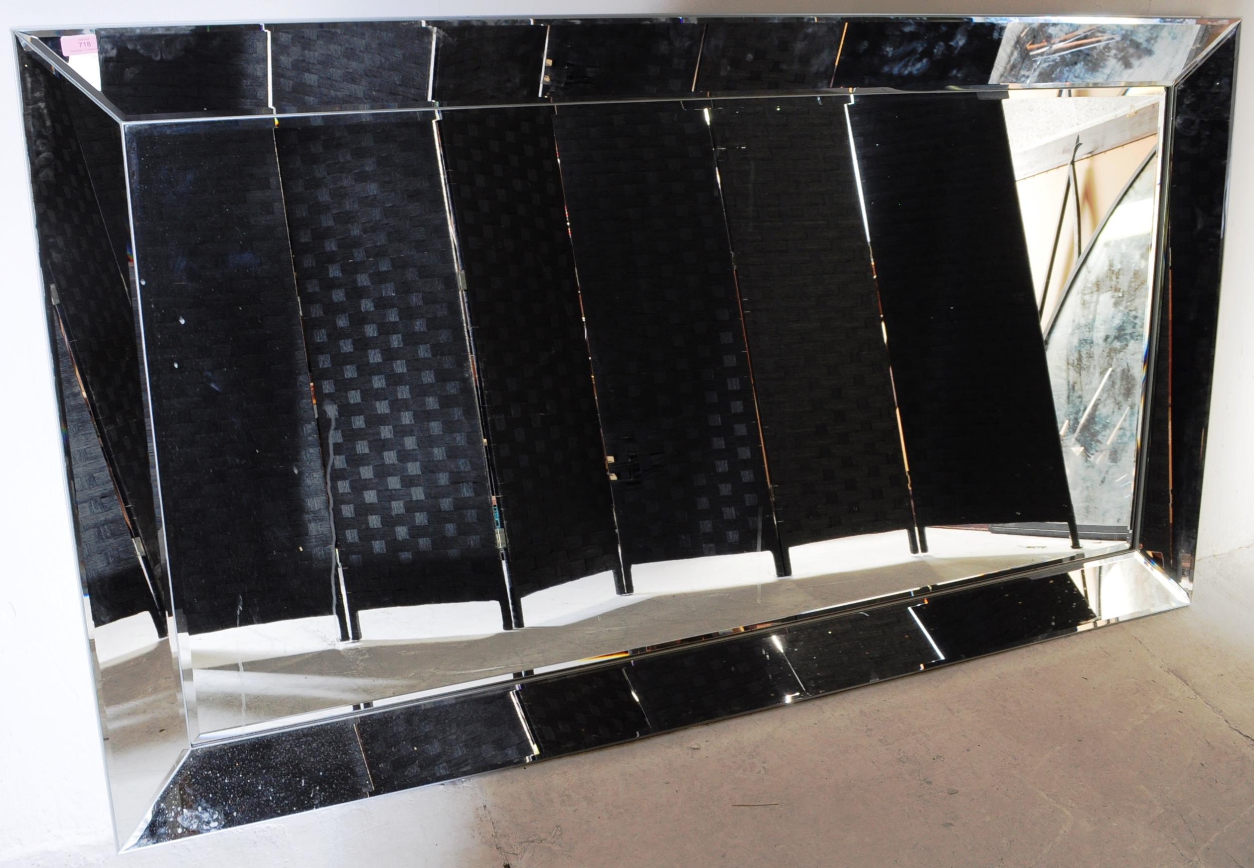 A large contemporary designer wall hanging mirror having large bevel edge to glass. Central mirrored panel, framed. Made in Belgium. Complete with wall hanging fittings to reverse. Measures approx. 167cm x 191cm.