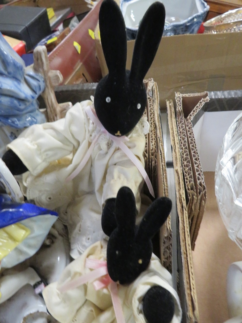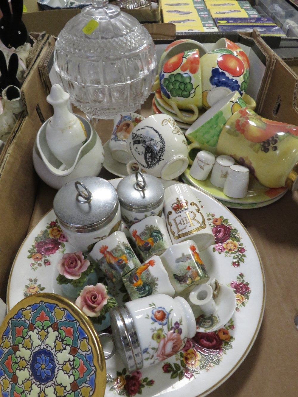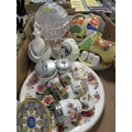 Two trays of assorted ceramics and glass to include figurine...