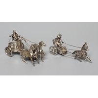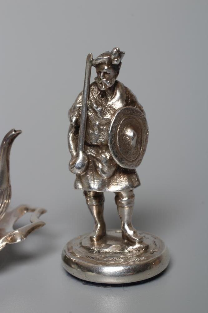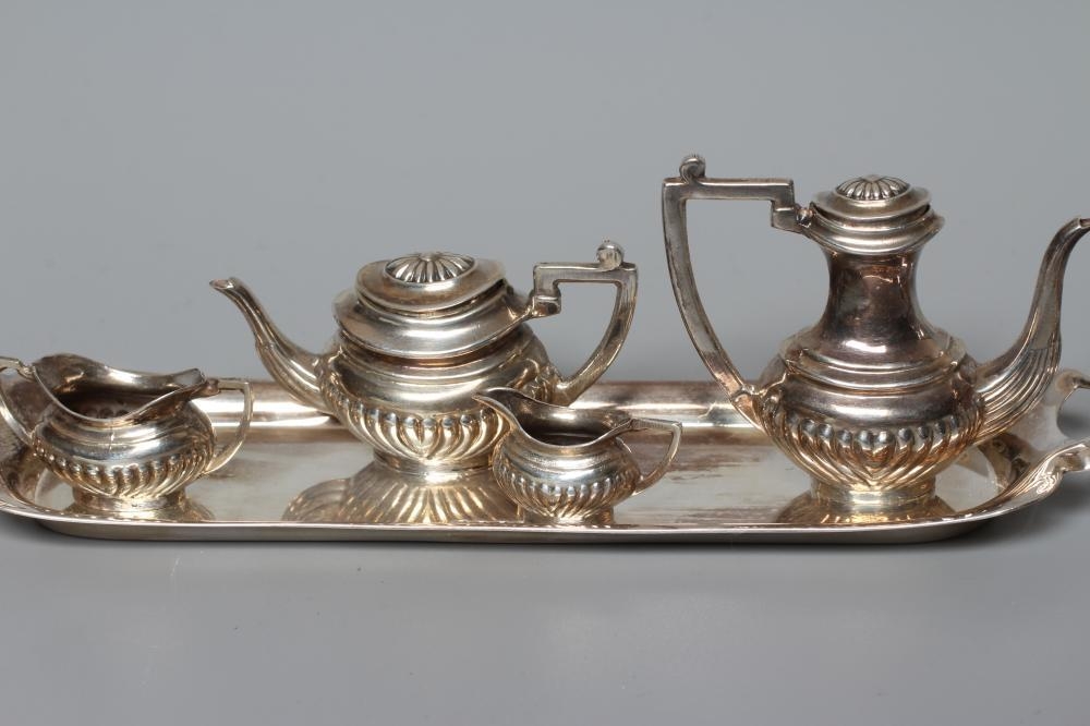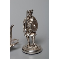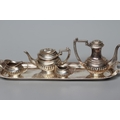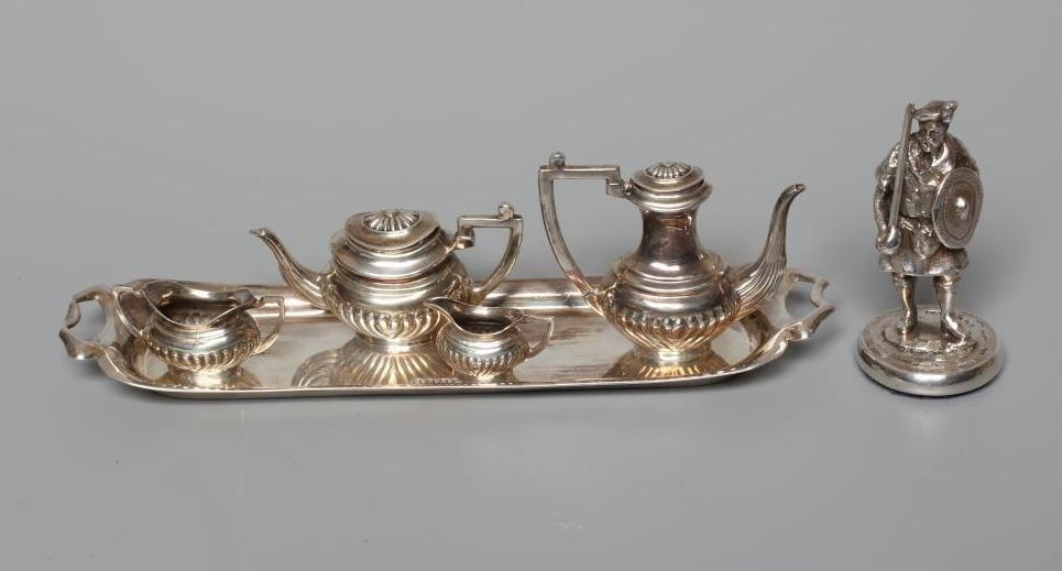 AN ELIZABETH II SILVER MINIATURE FOUR PIECE TEA AND COFFEE SERVICE by Alan M Weisrose, London 1977, of semi fluted oblong baluster form, with matching tray, 5 3/4" long, 2ozs total, together with an Edwardian Scottish silver figure by John Maitland Talbot, Edinburgh 1904, modelled as a Celtic warrior, 2" high, loaded, and a silver model garden bench, stamped 925, probably French, 2 1/4" long (7)
