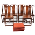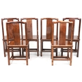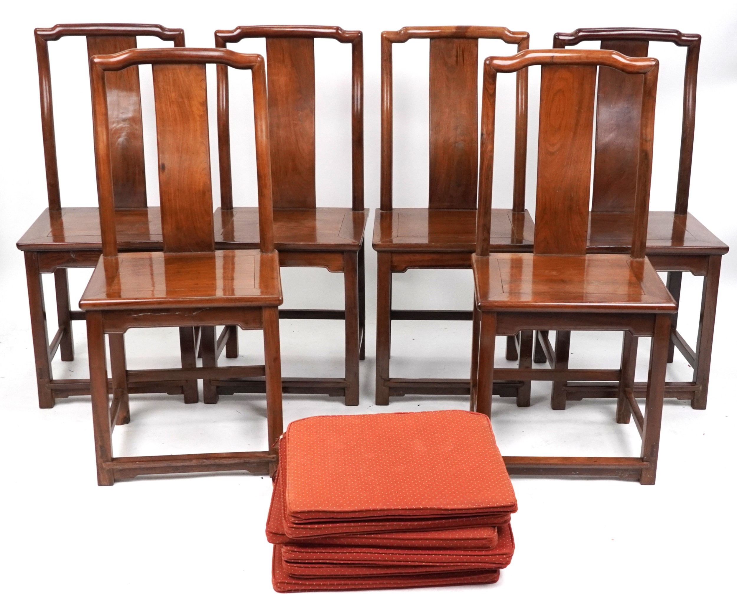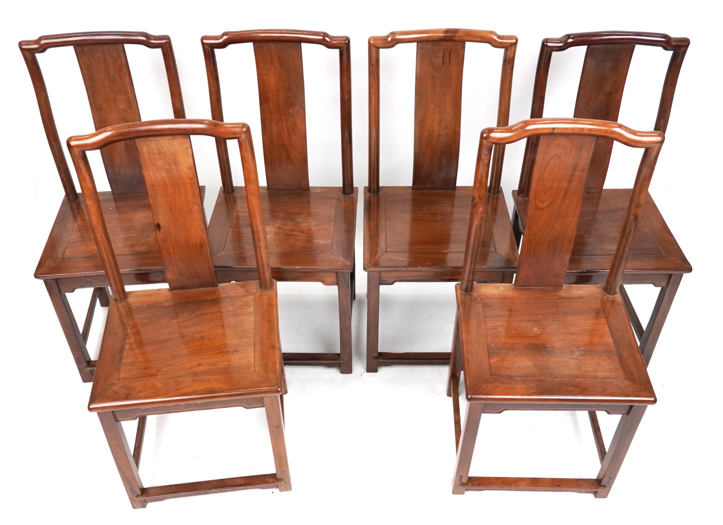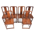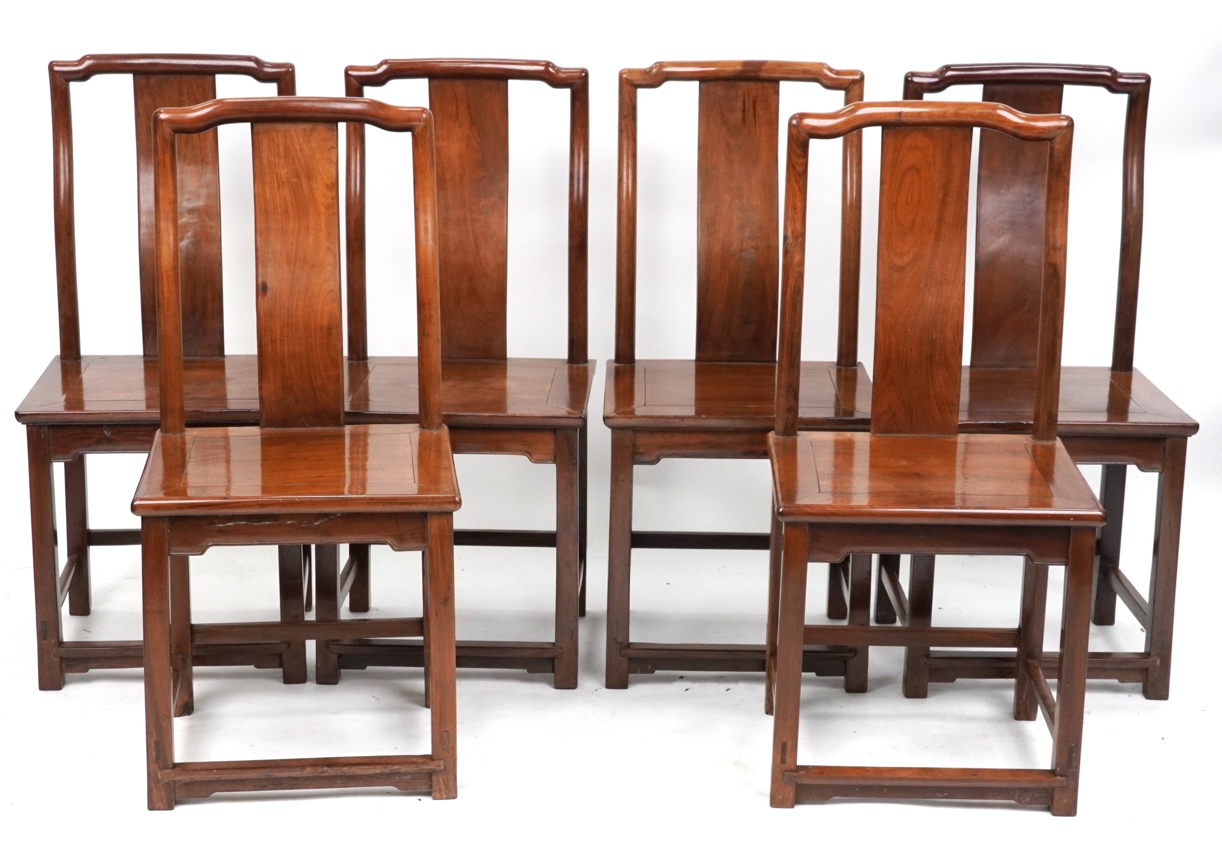 A set of six Chinese hardwood dining chairs, early 20th century, the splat backs above solid seats, raised on block legs, 106cm H x 48cm W x 43cm D.
