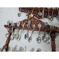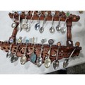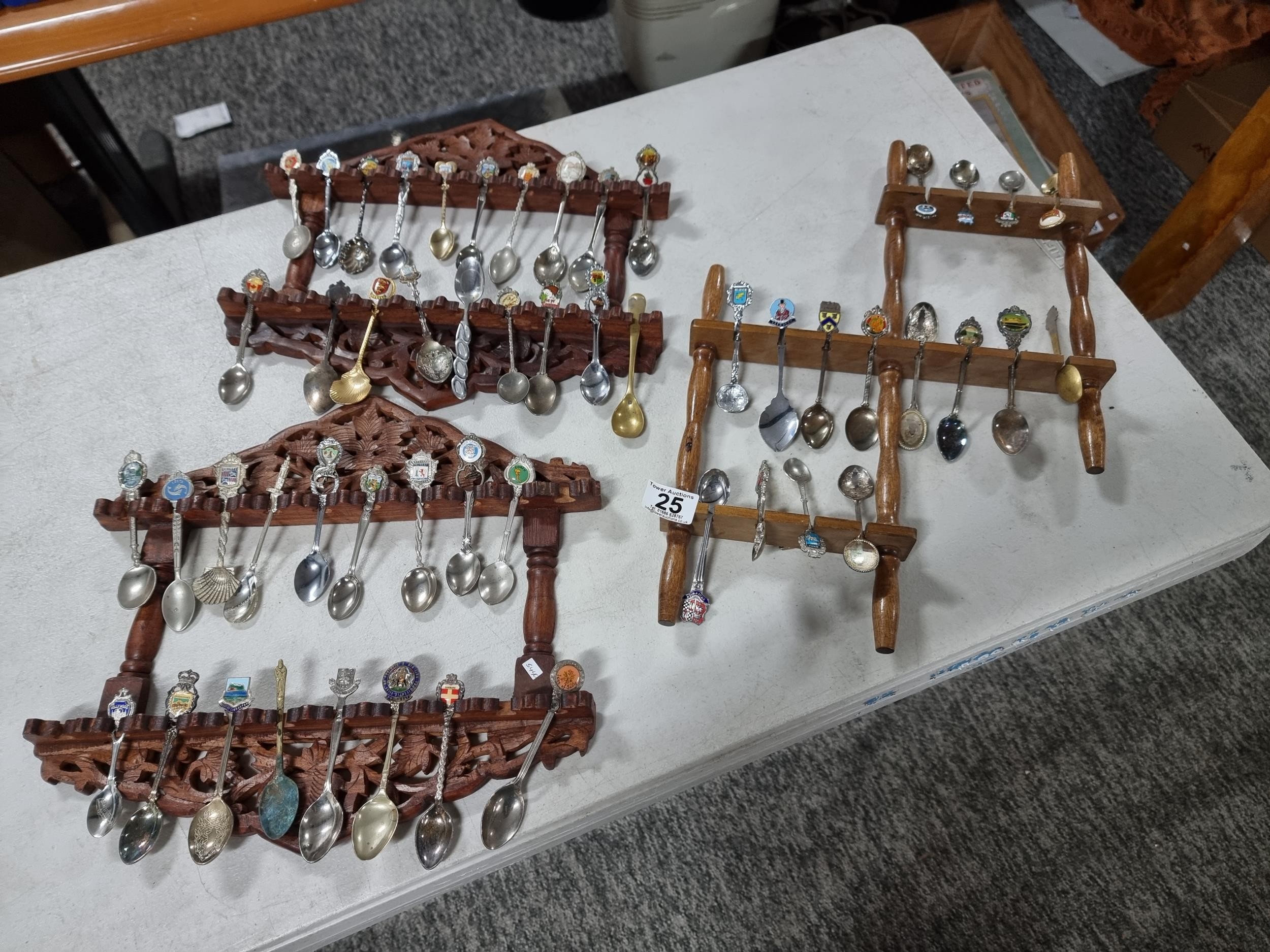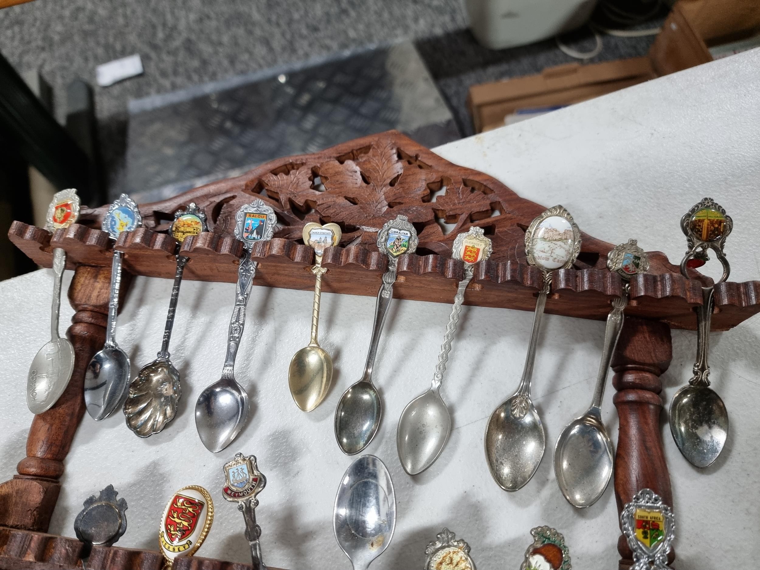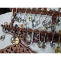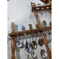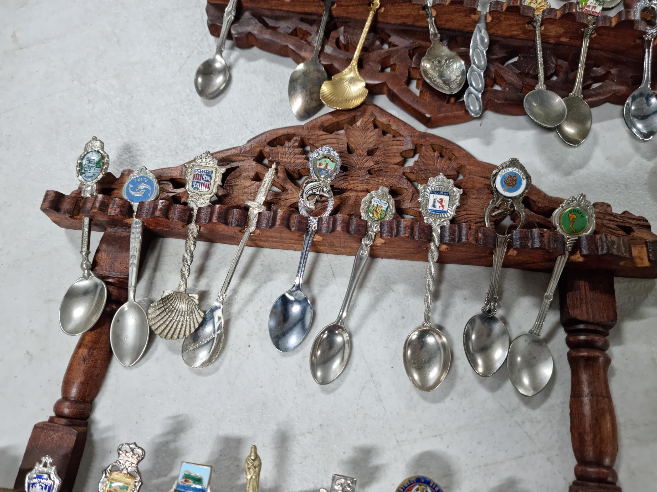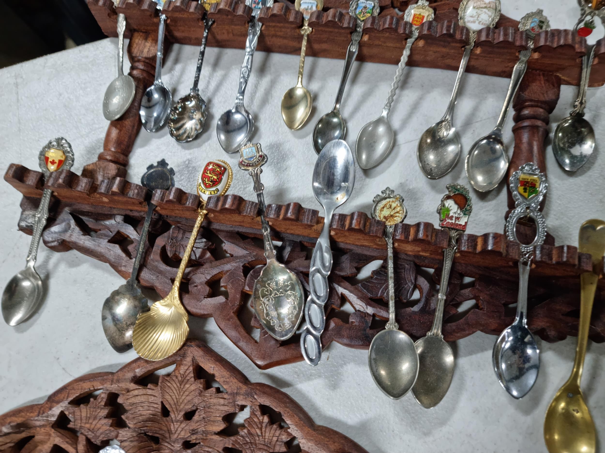 3x wooden display racks full of collectable teaspoons inc 2 carved racks containing a large quantity of teaspoons many with county coats of arms to the tops please see pictures for more details