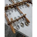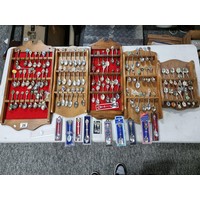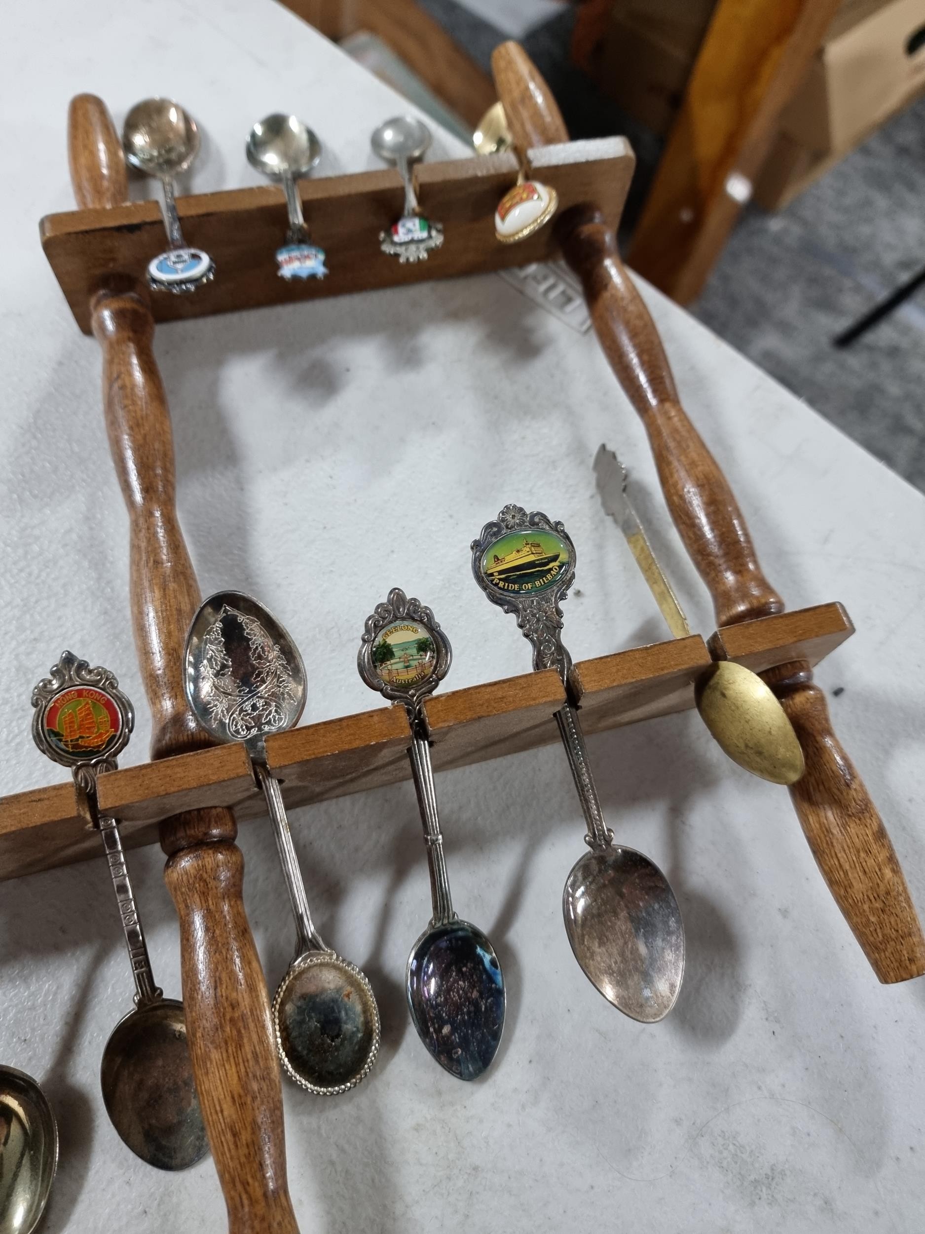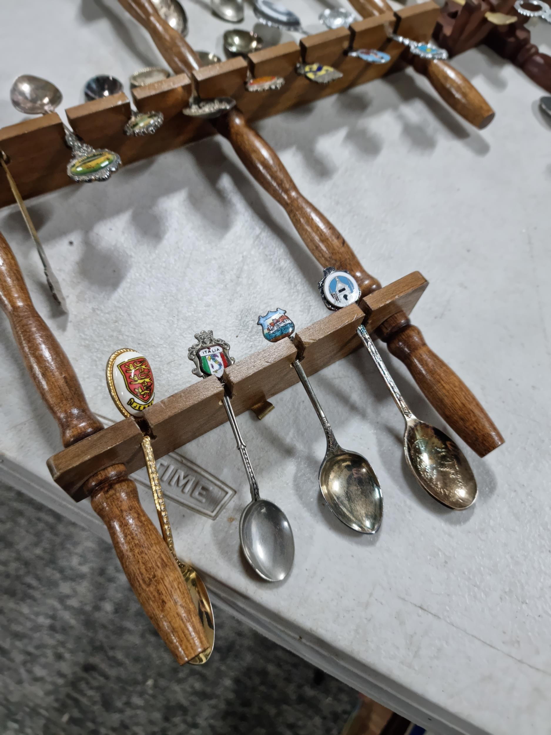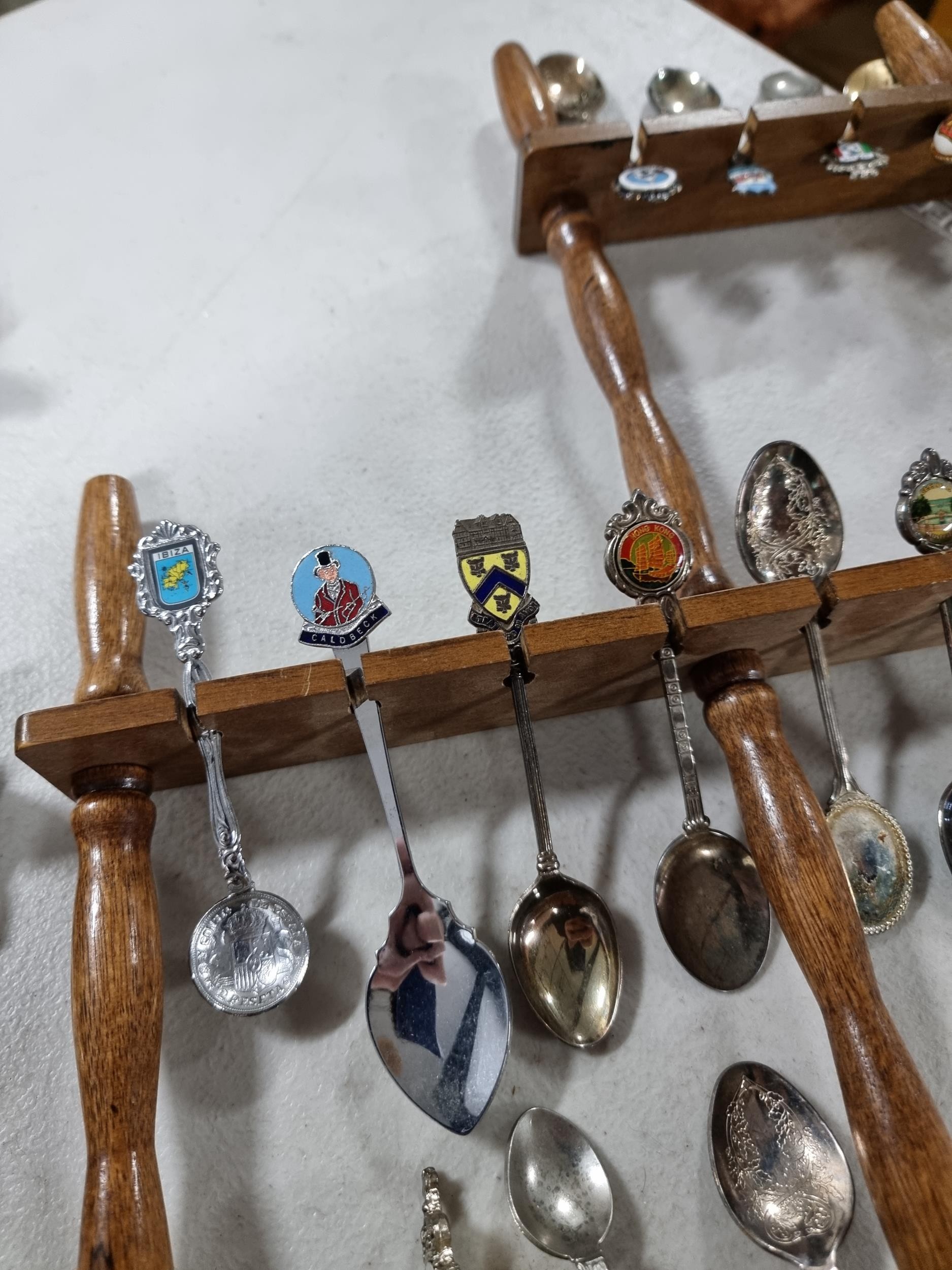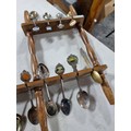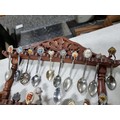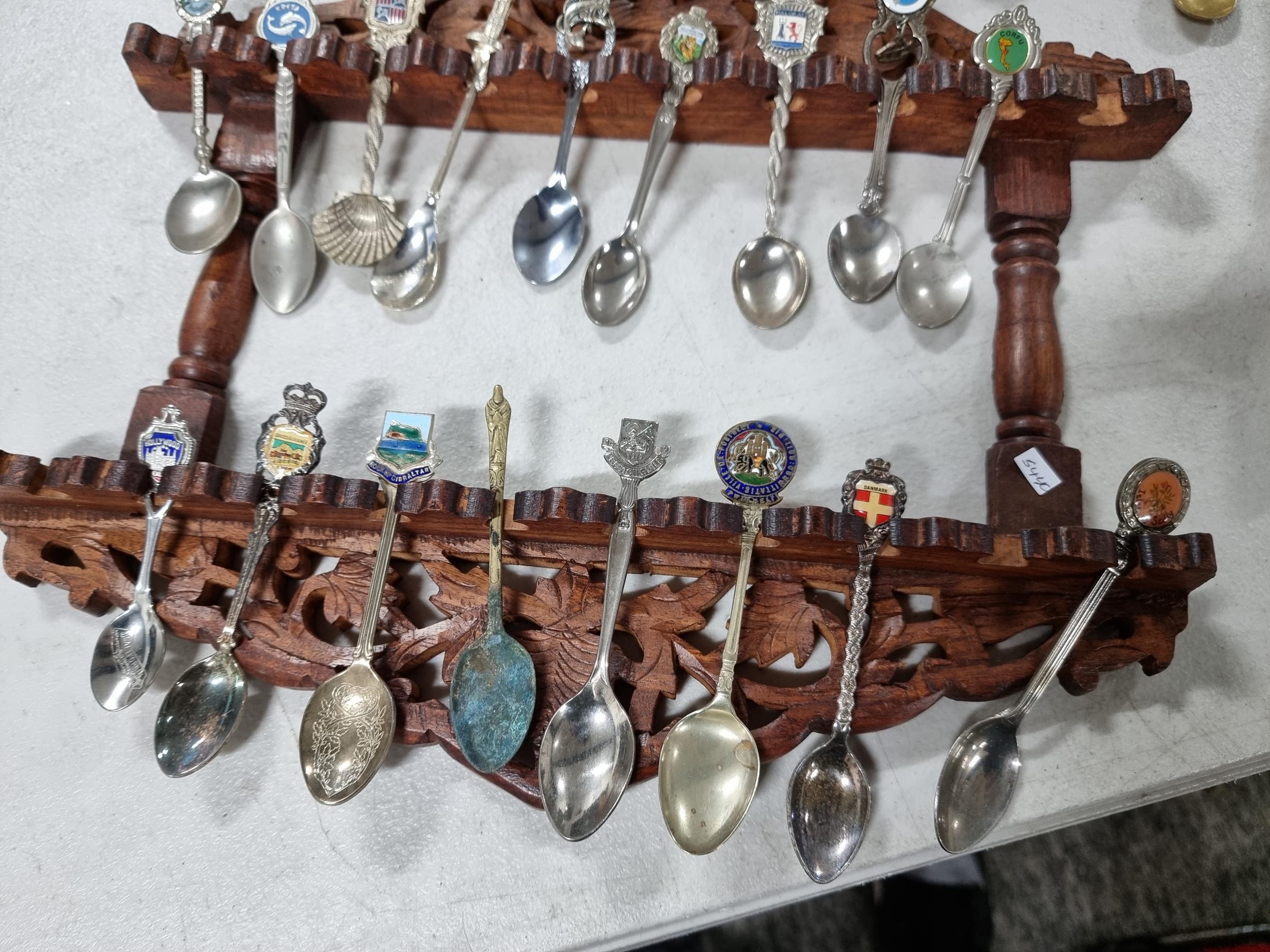 3x wooden display racks full of collectable teaspoons inc 2 carved racks containing a large quantity of teaspoons many with county coats of arms to the tops please see pictures for more details