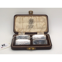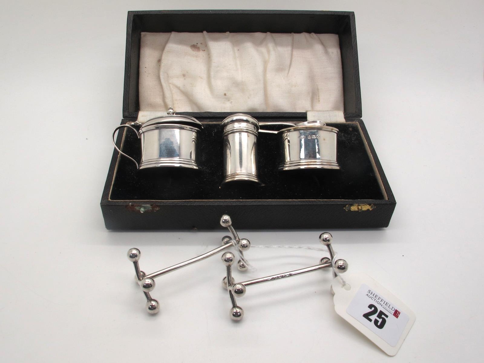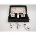 A Pair of Hallmarked Silver Knife Rests, possibly London 1829 (marks unclear); Together with A Hallmarked Silver Three Piece Cruet Set, (dents) with associated spoons, in a fitted case.