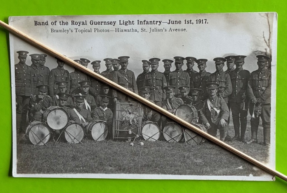 Real photographic postcard by Thomas Bramley Guernsey, Band of The Royal Guernsey Light Infantry, June 1st 1917. * Provenance - Ex Dave Pattimore collection. Collectors ink stamp verso.