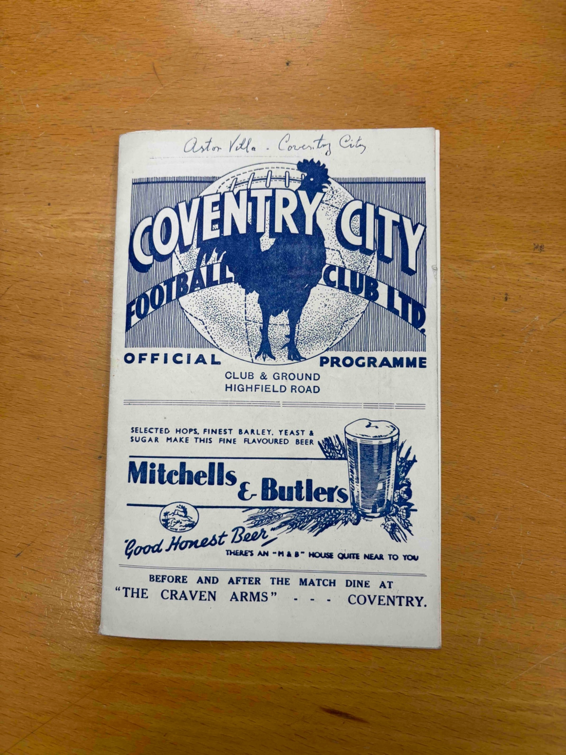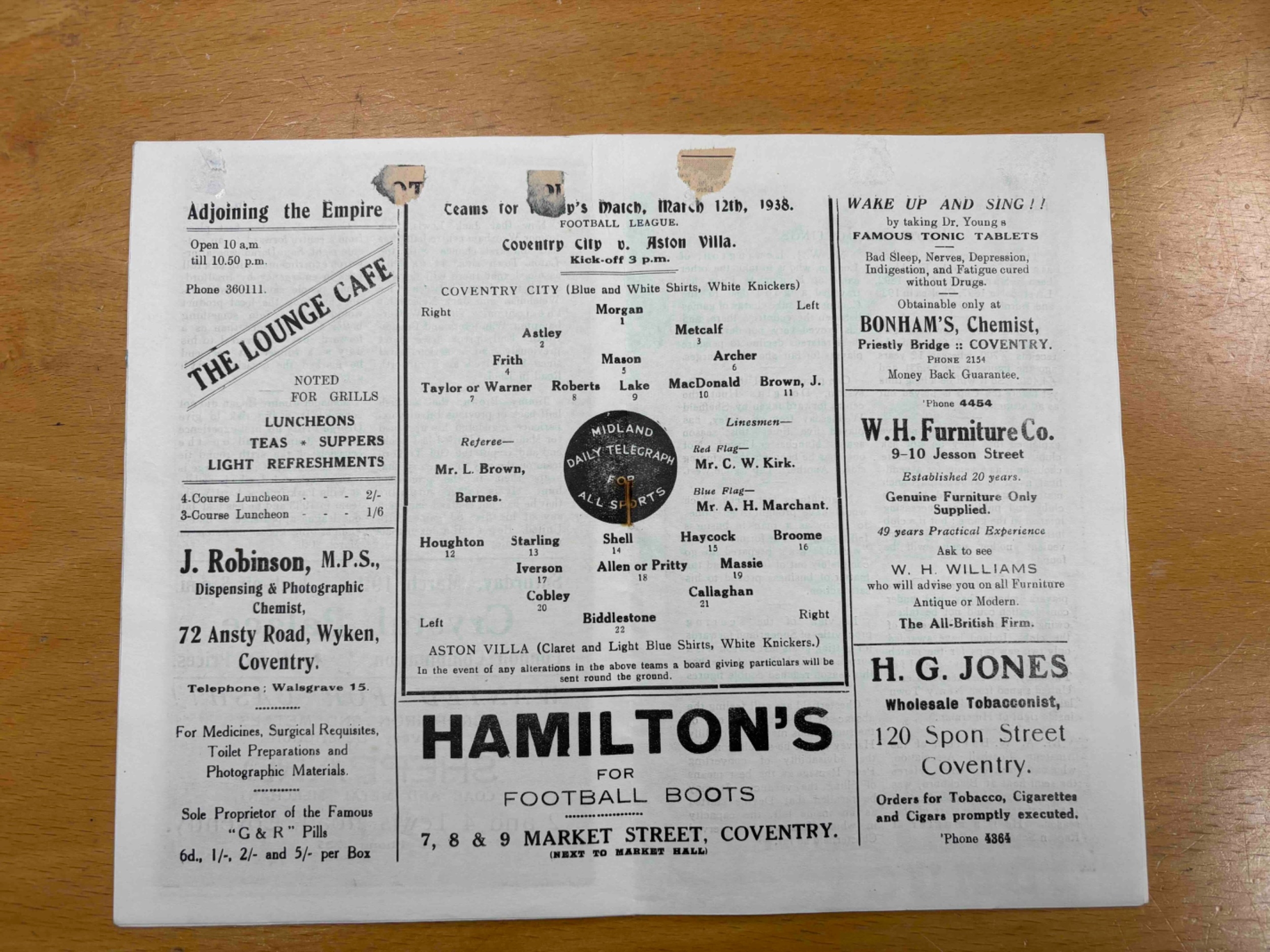 1937/38 Coventry City v Aston Villa, RS. Middle page loose, Aston villa v Coventry City written on the front. Plus newspaper report stapled inside, signs that a newspaper report was in the middle pages to. But regardless its still in very good condition.,