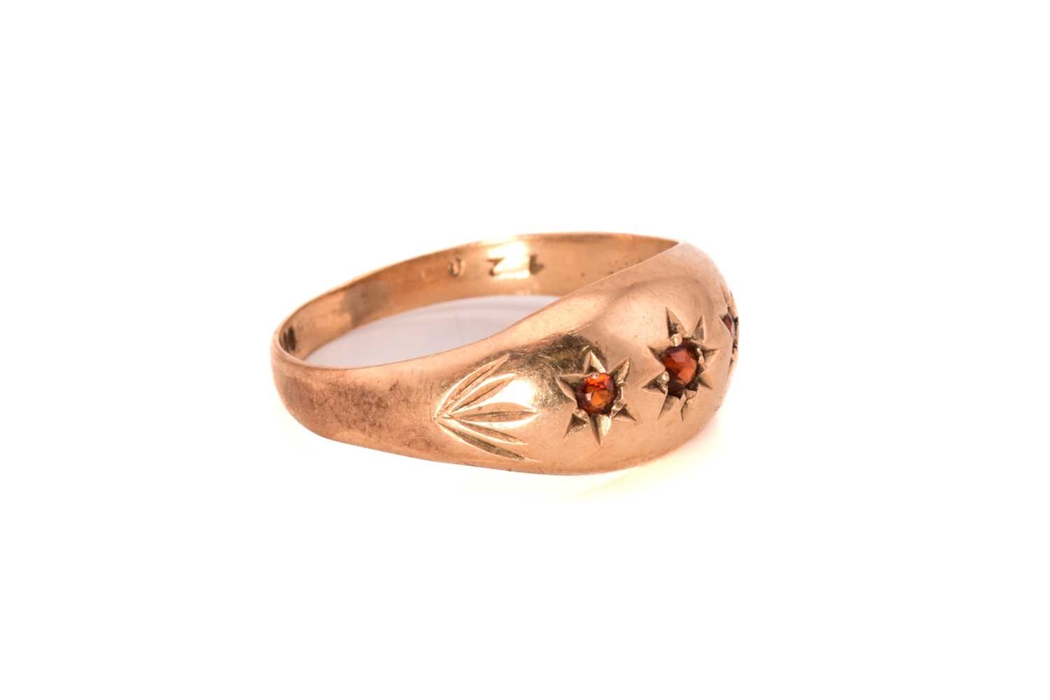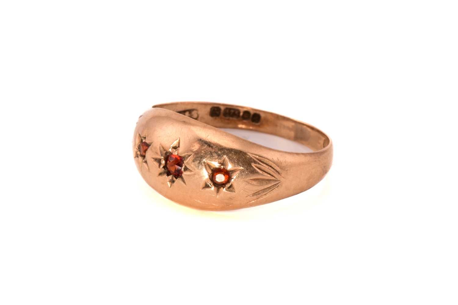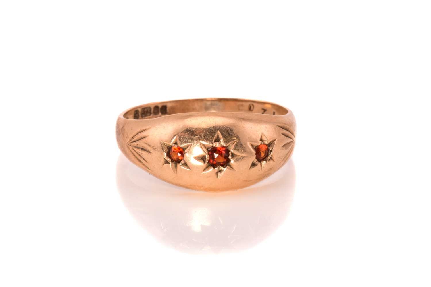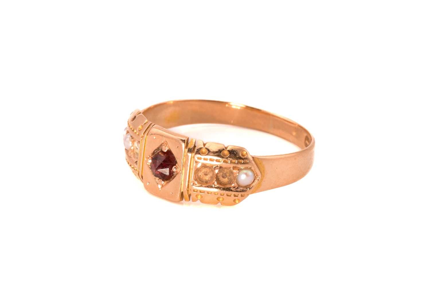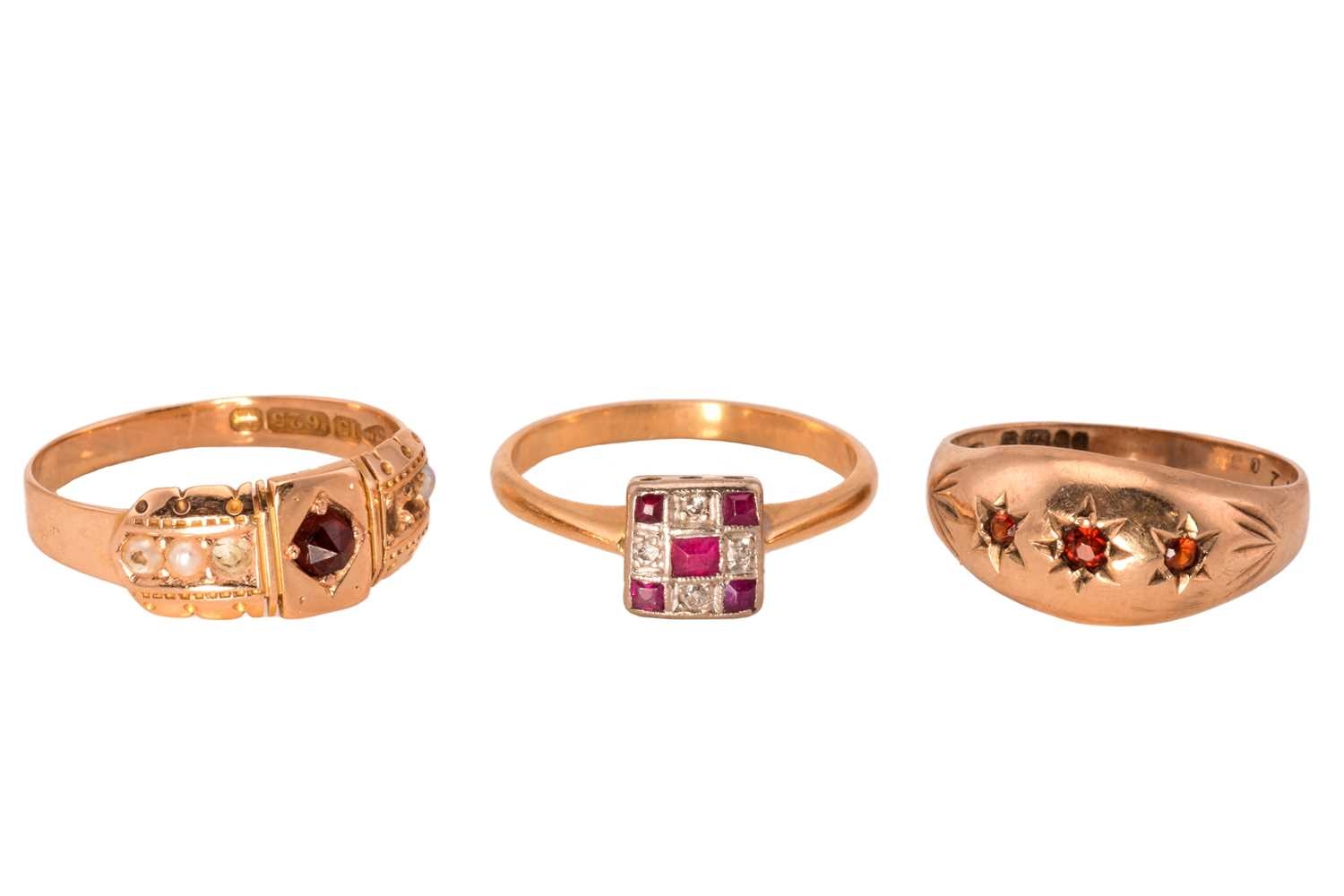 Three multi-gem rings; A Victorian seed pearl and garnet ring in 15ct gold (three pearls deficit), Chester 1882, size Q½; A three-stone garnet ring in 9ct gold, London 1975, size O; A panel chequerboard ring with diamonds and rubies, marked '18ct', size N; Total weight of items 7.3 grams (3).