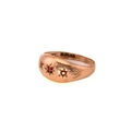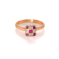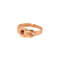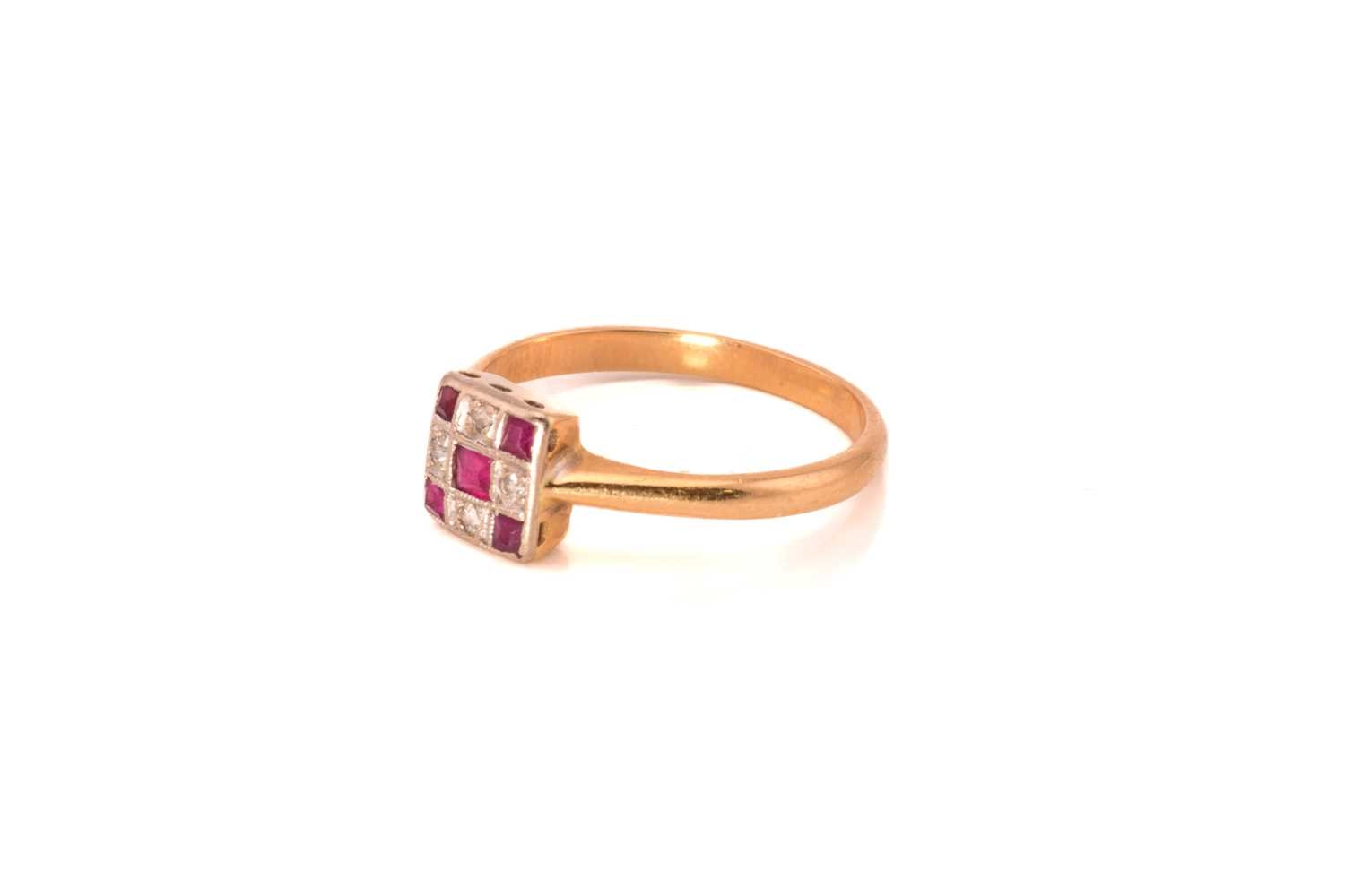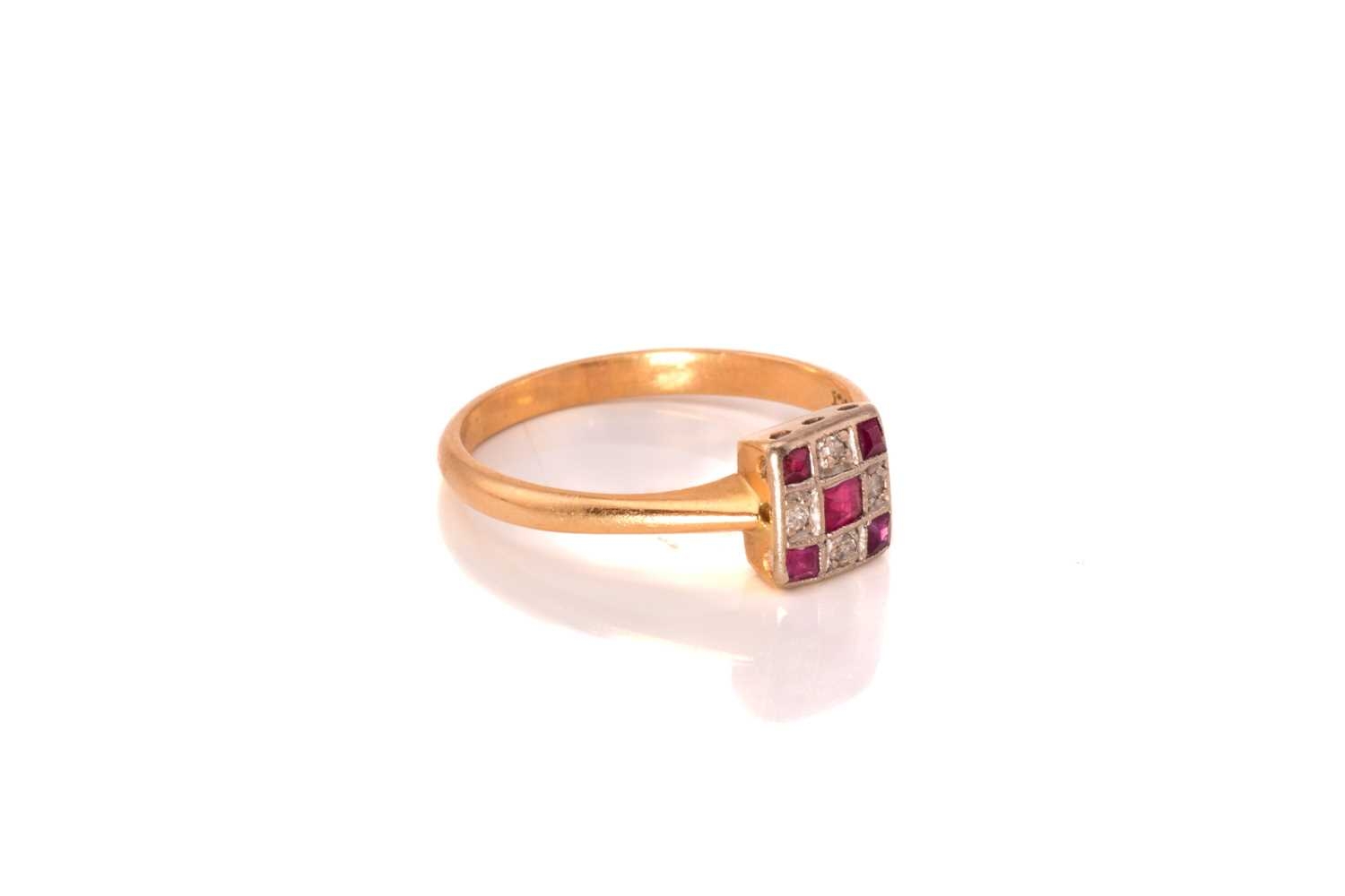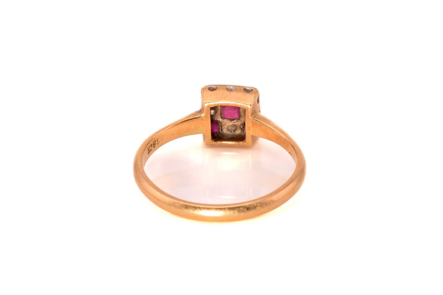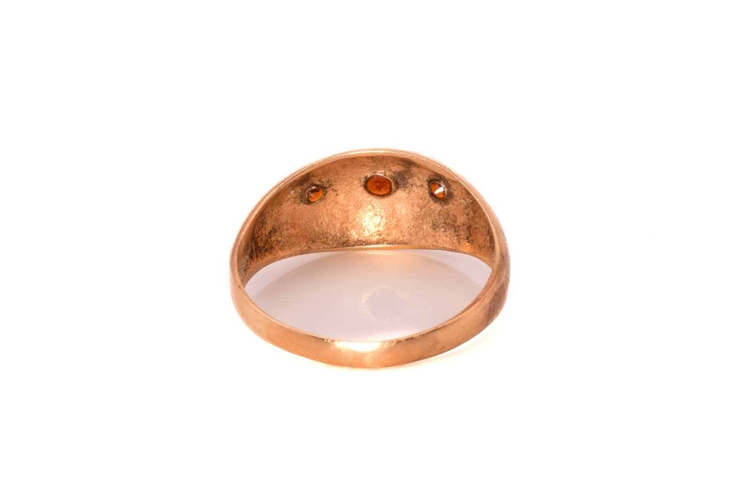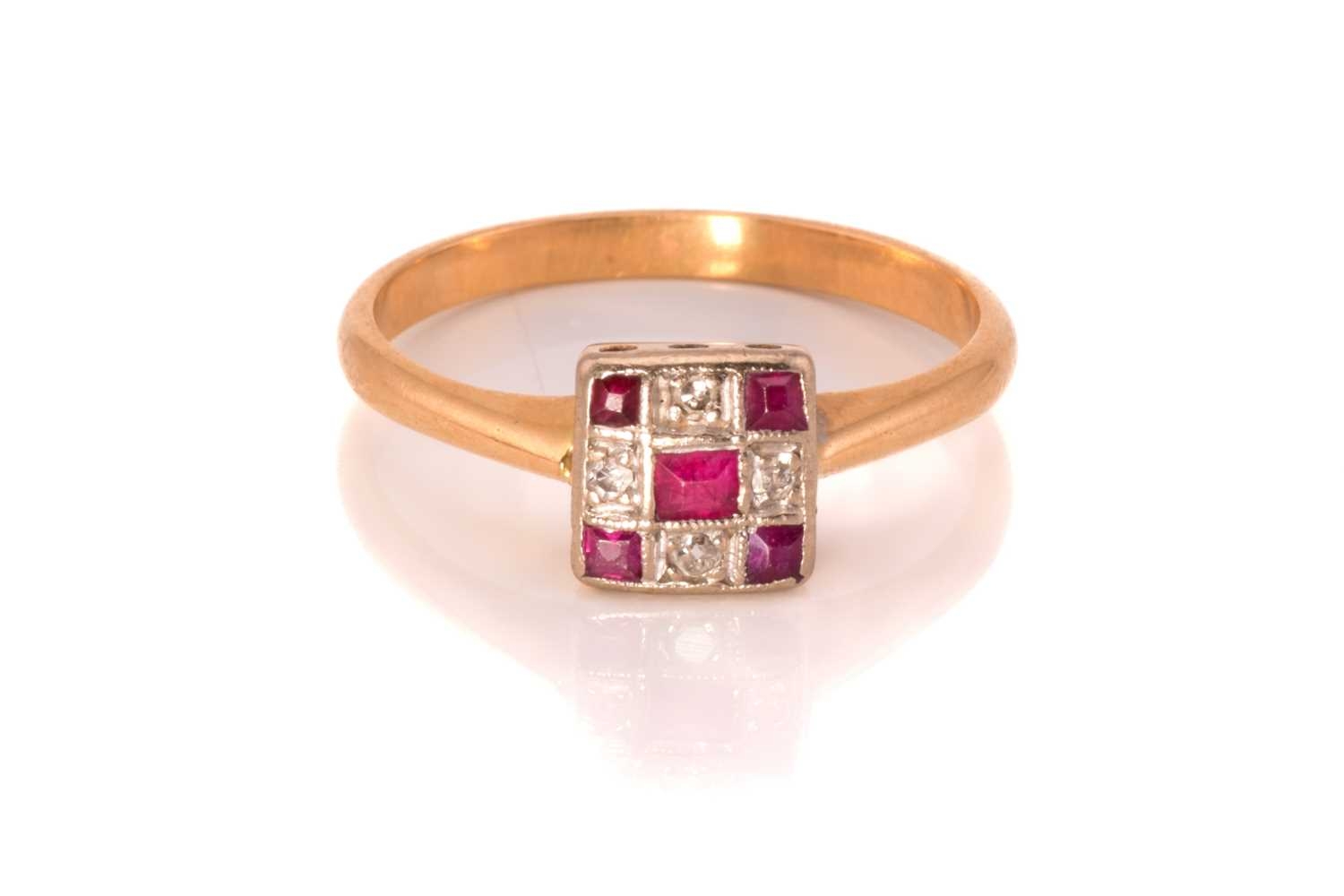 Three multi-gem rings; A Victorian seed pearl and garnet ring in 15ct gold (three pearls deficit), Chester 1882, size Q½; A three-stone garnet ring in 9ct gold, London 1975, size O; A panel chequerboard ring with diamonds and rubies, marked '18ct', size N; Total weight of items 7.3 grams (3).