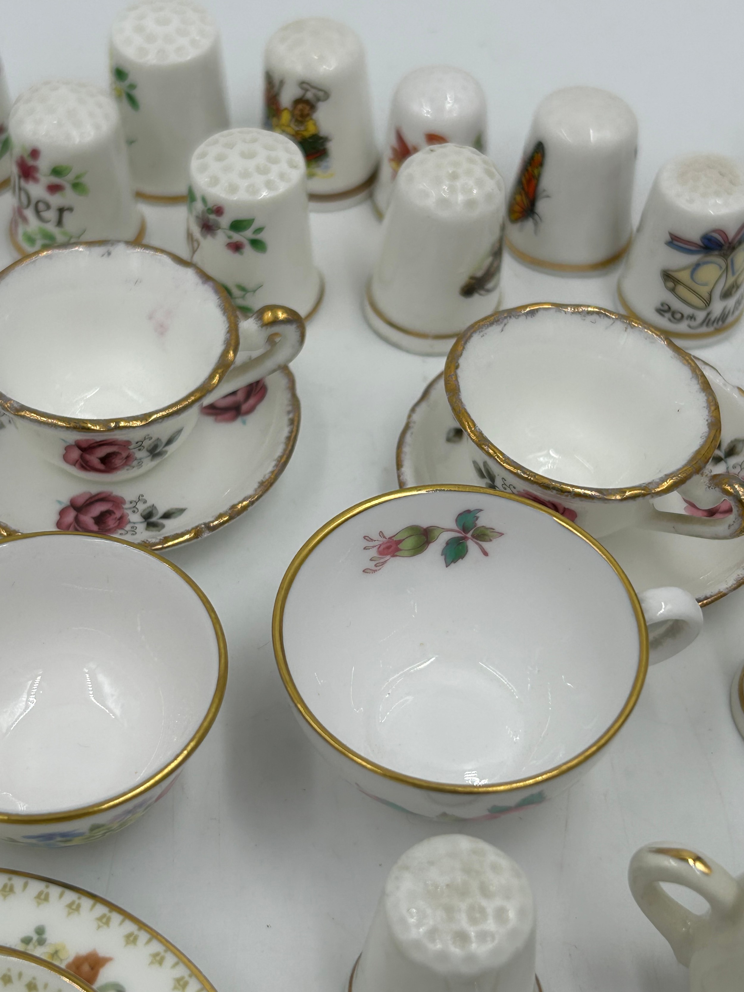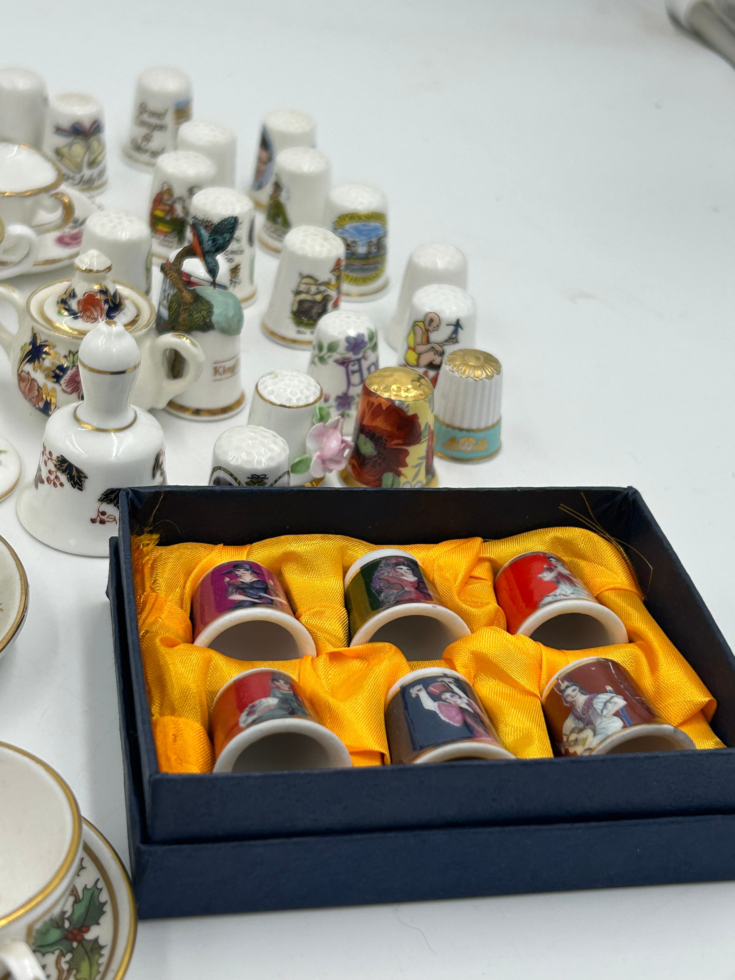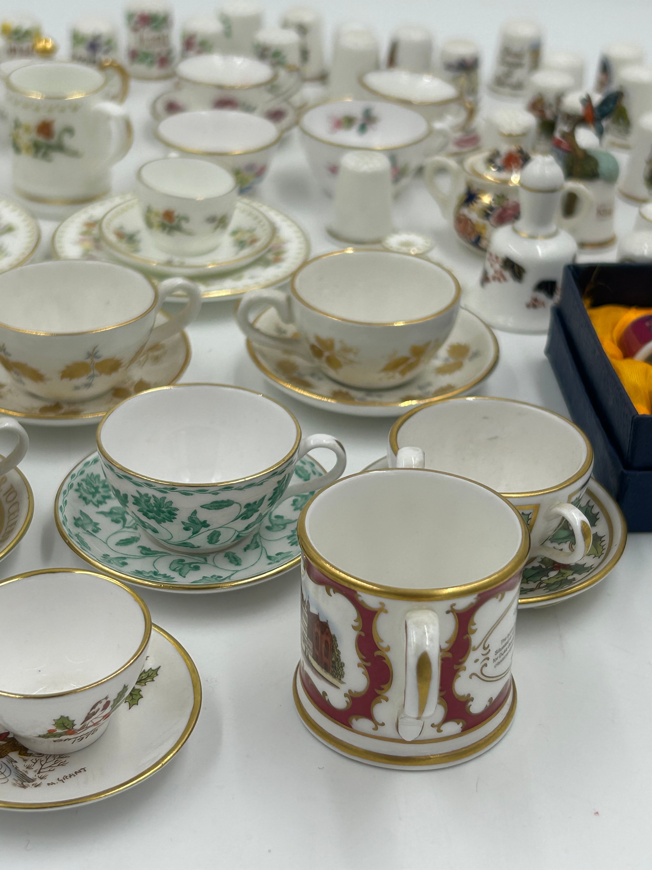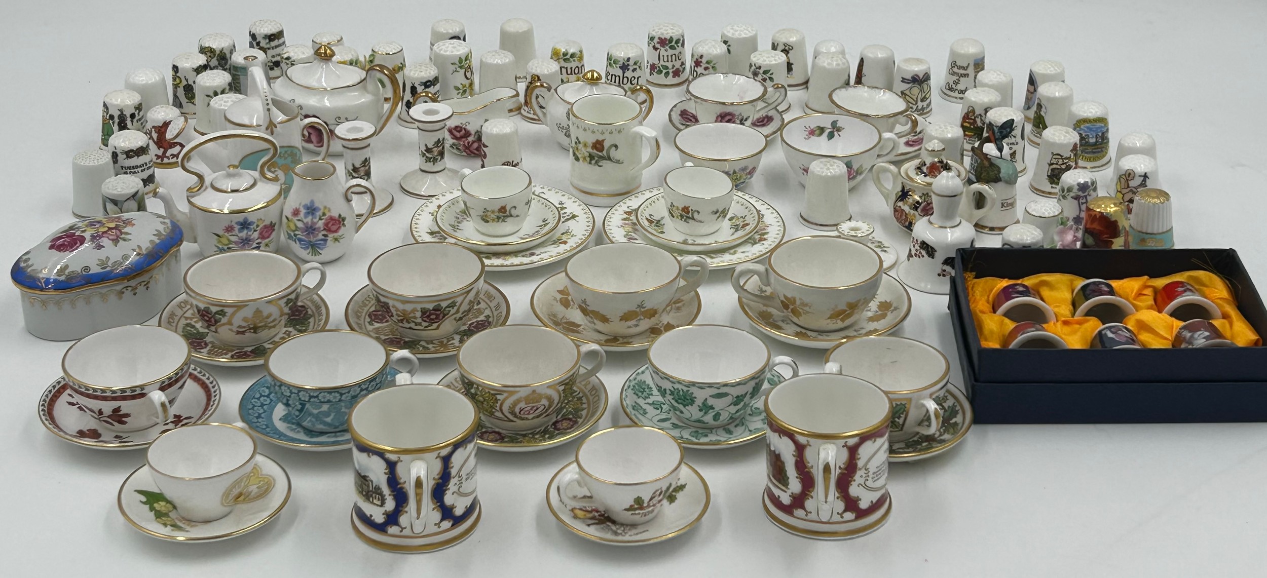 Various porcelain miniatures to include mainly Spode, 2 x Royal Doulton twin handled loving cups, Coalport bell, 2 x Caverswall cups and saucers, 2 cup , saucer and plate sets of Wedgwood, blue Wedgwood Jasperware and a quantity of thimbles.