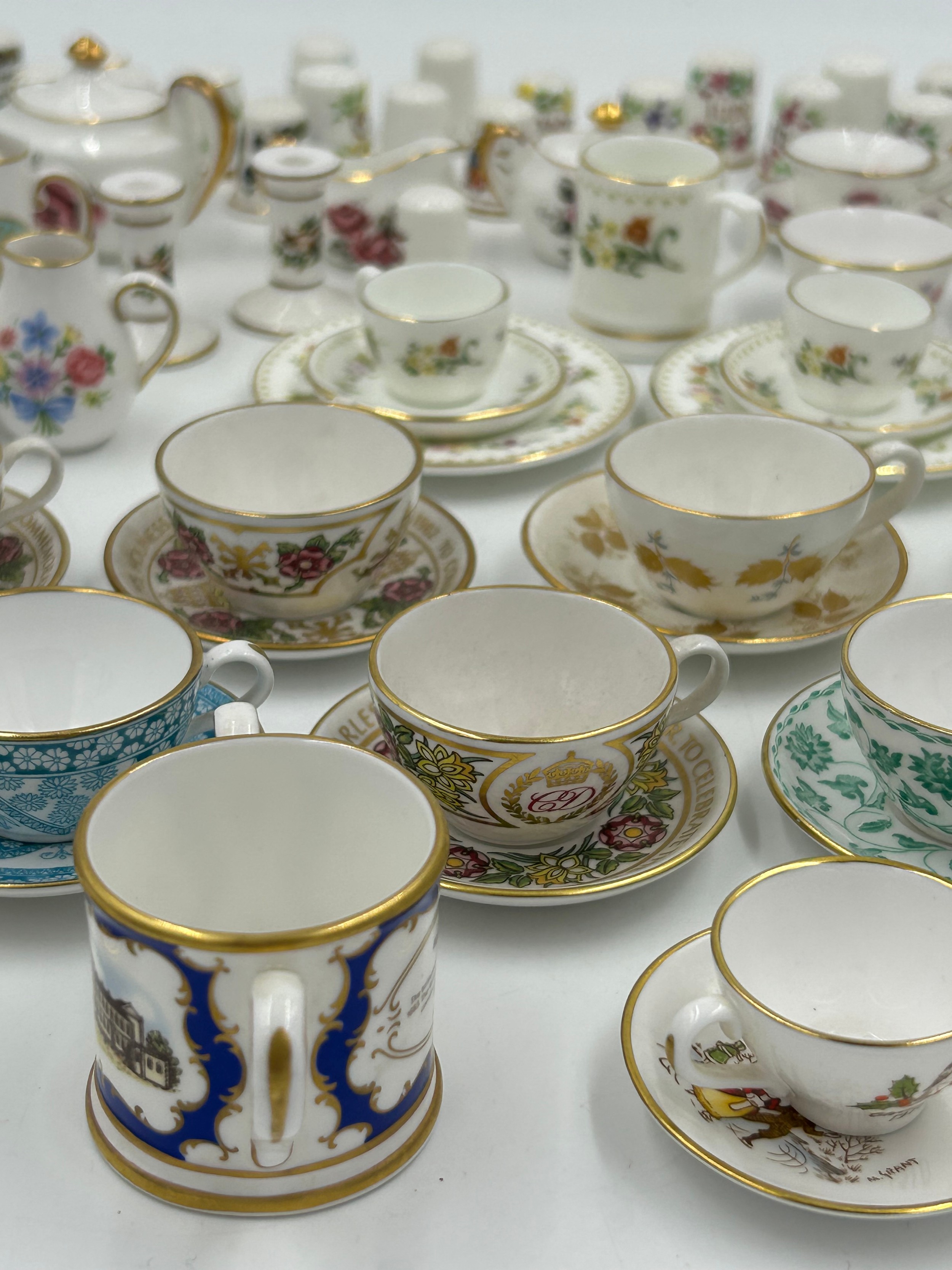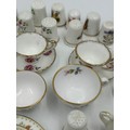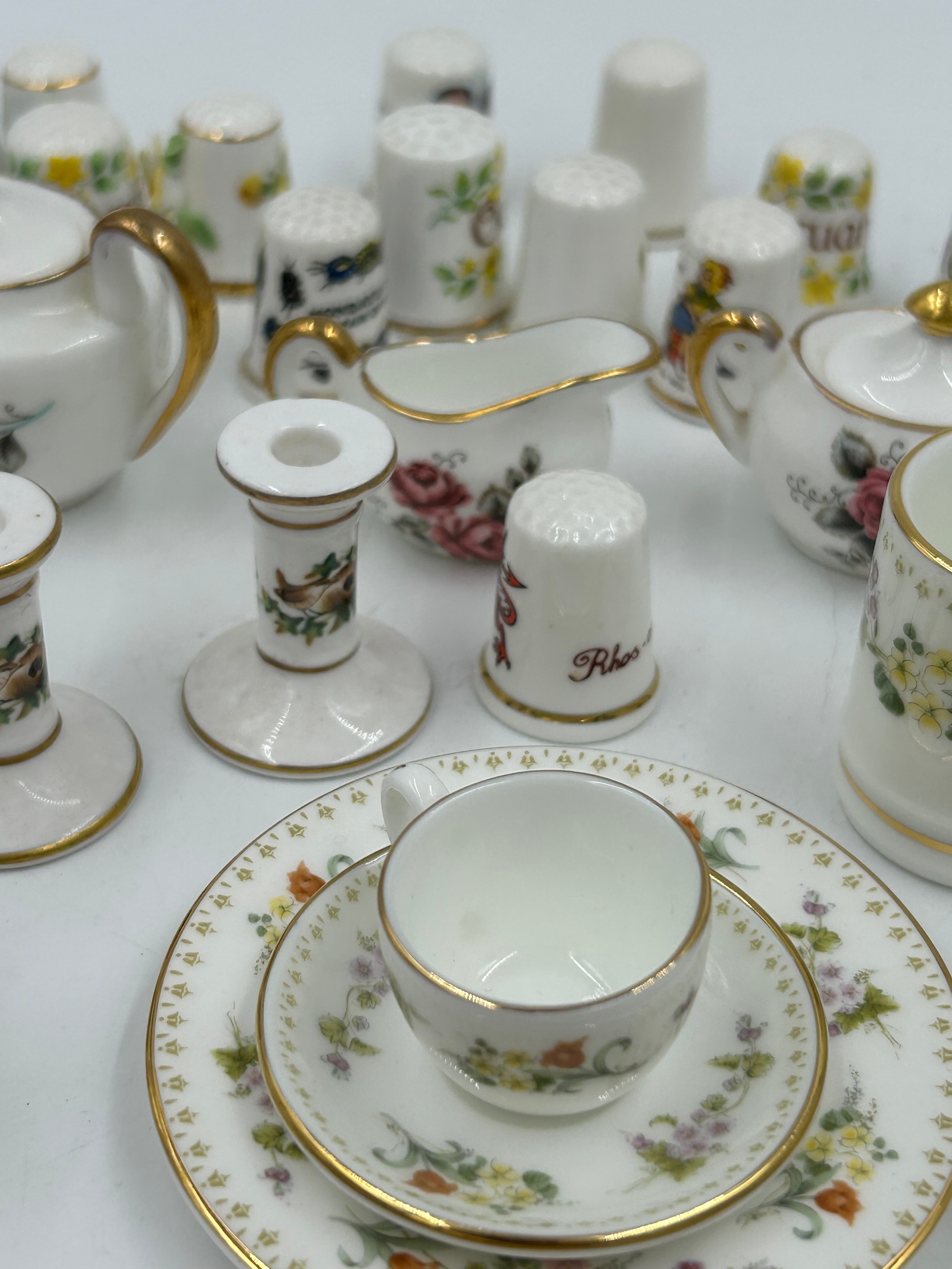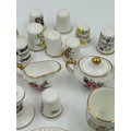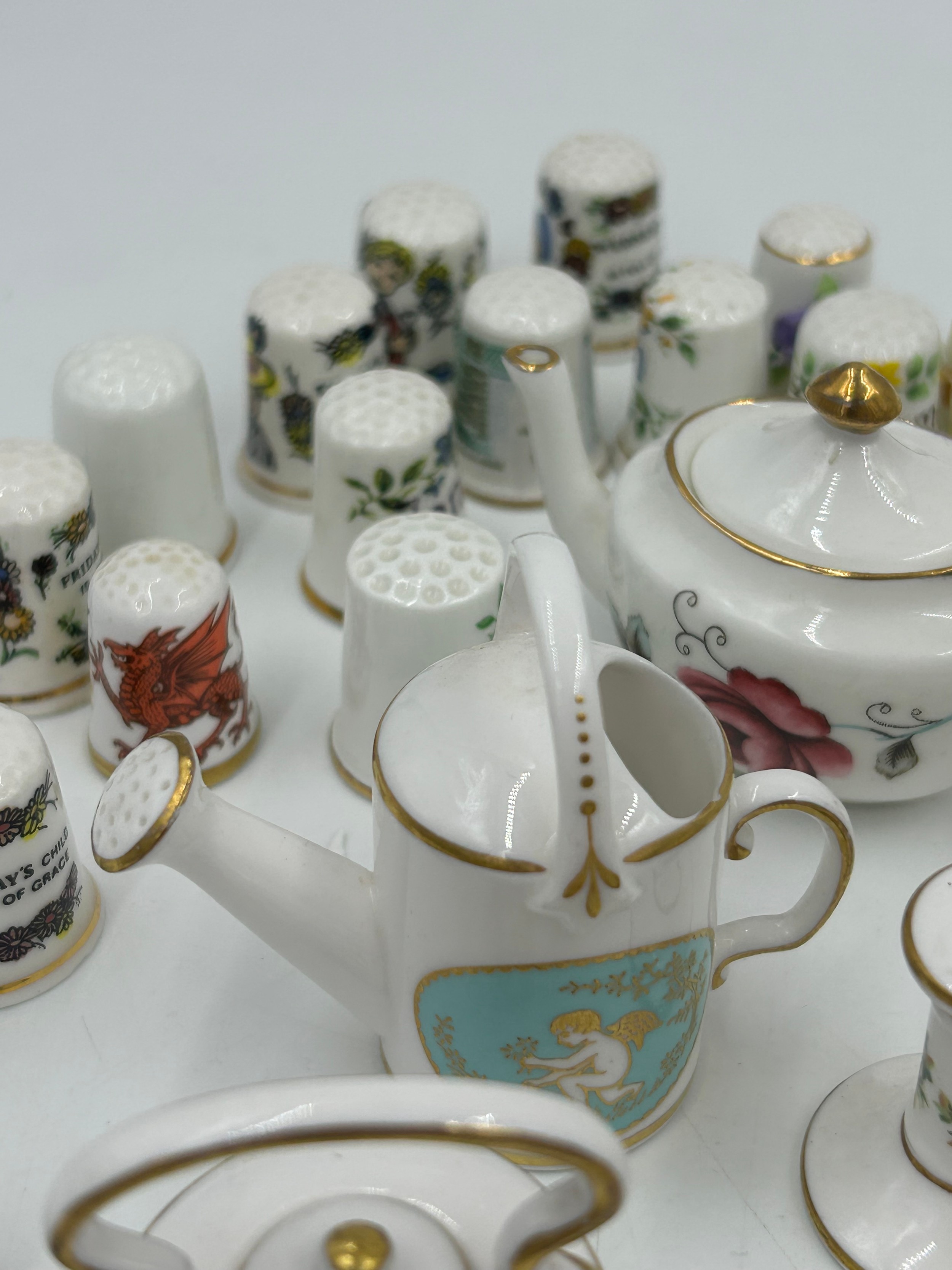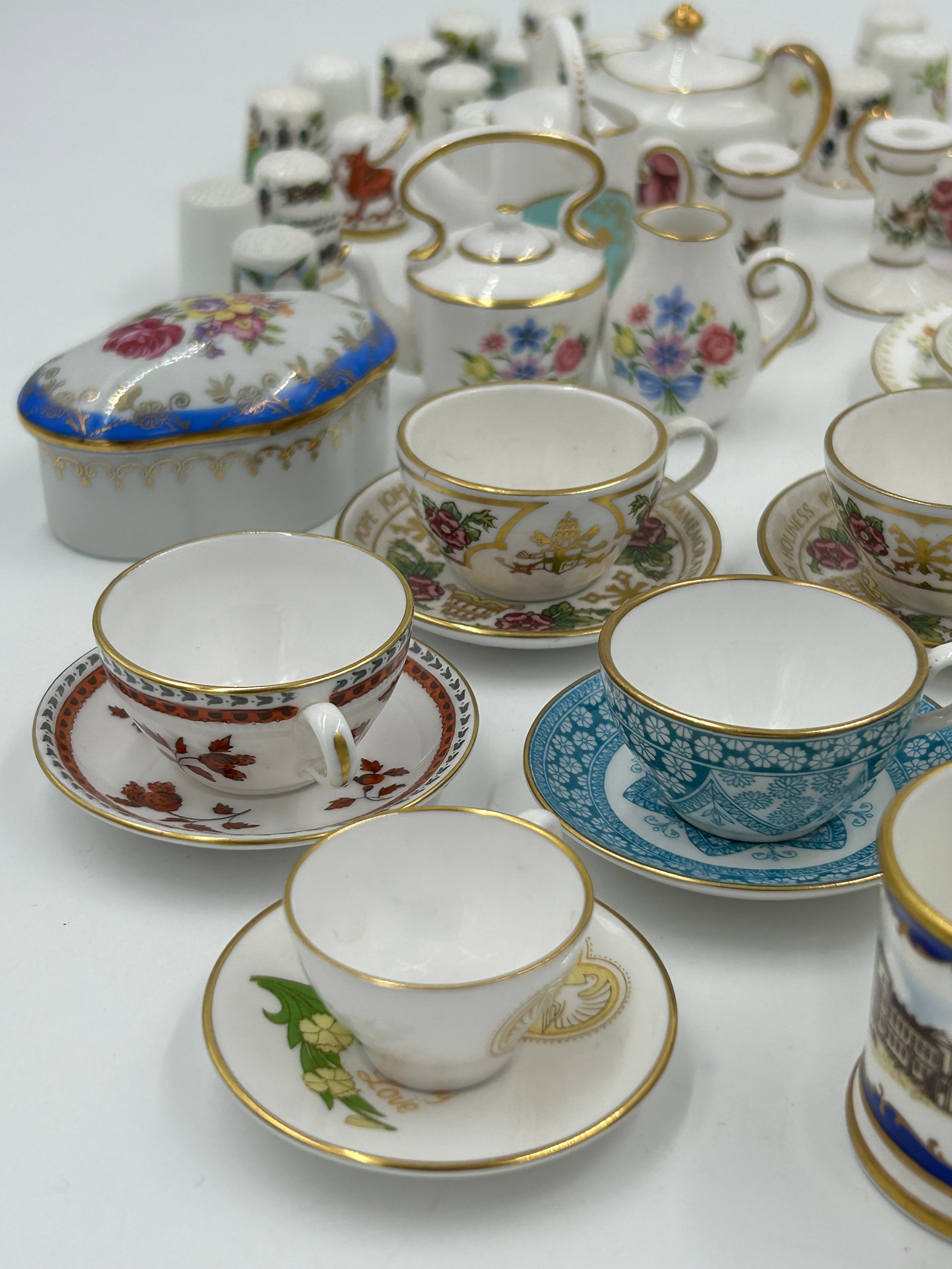 Various porcelain miniatures to include mainly Spode, 2 x Royal Doulton twin handled loving cups, Coalport bell, 2 x Caverswall cups and saucers, 2 cup , saucer and plate sets of Wedgwood, blue Wedgwood Jasperware and a quantity of thimbles.