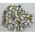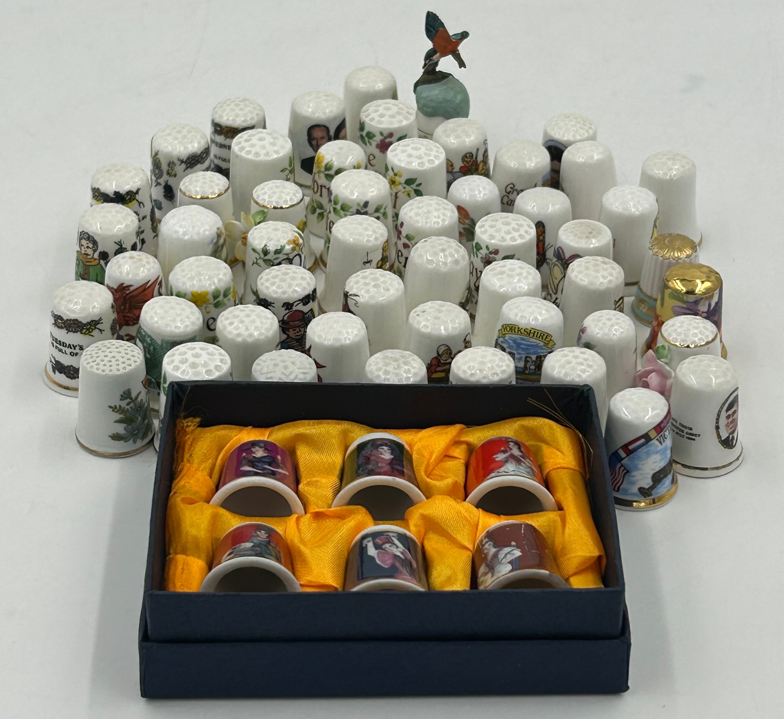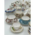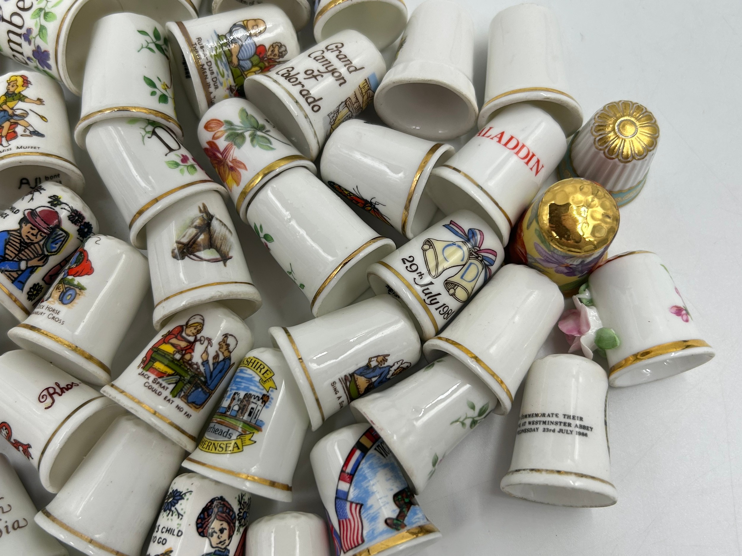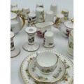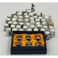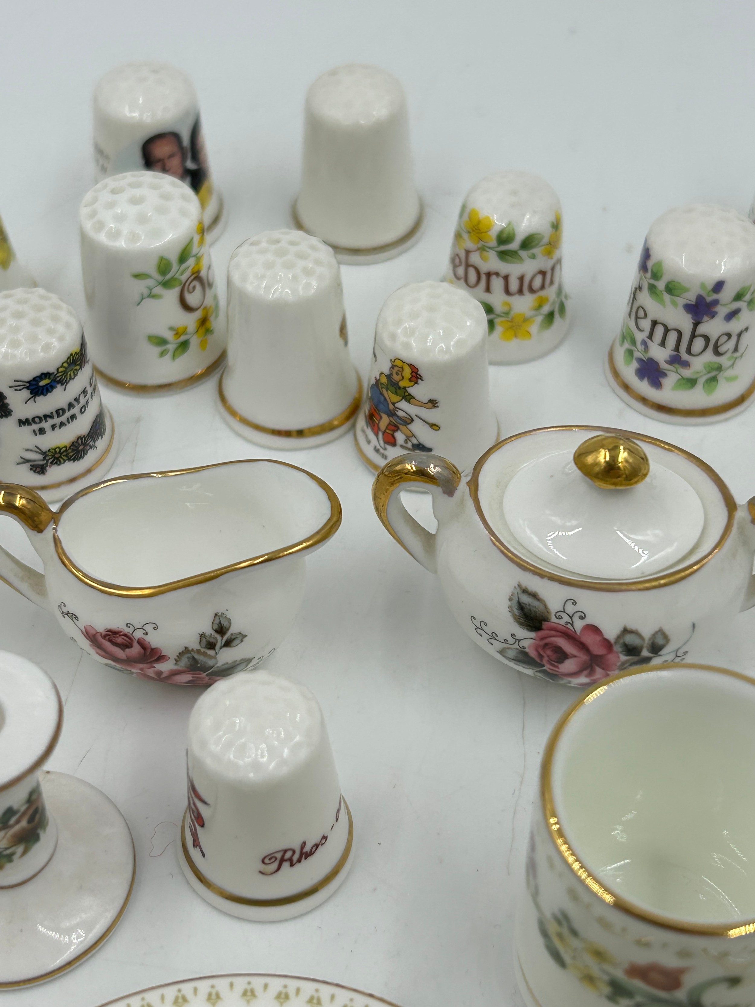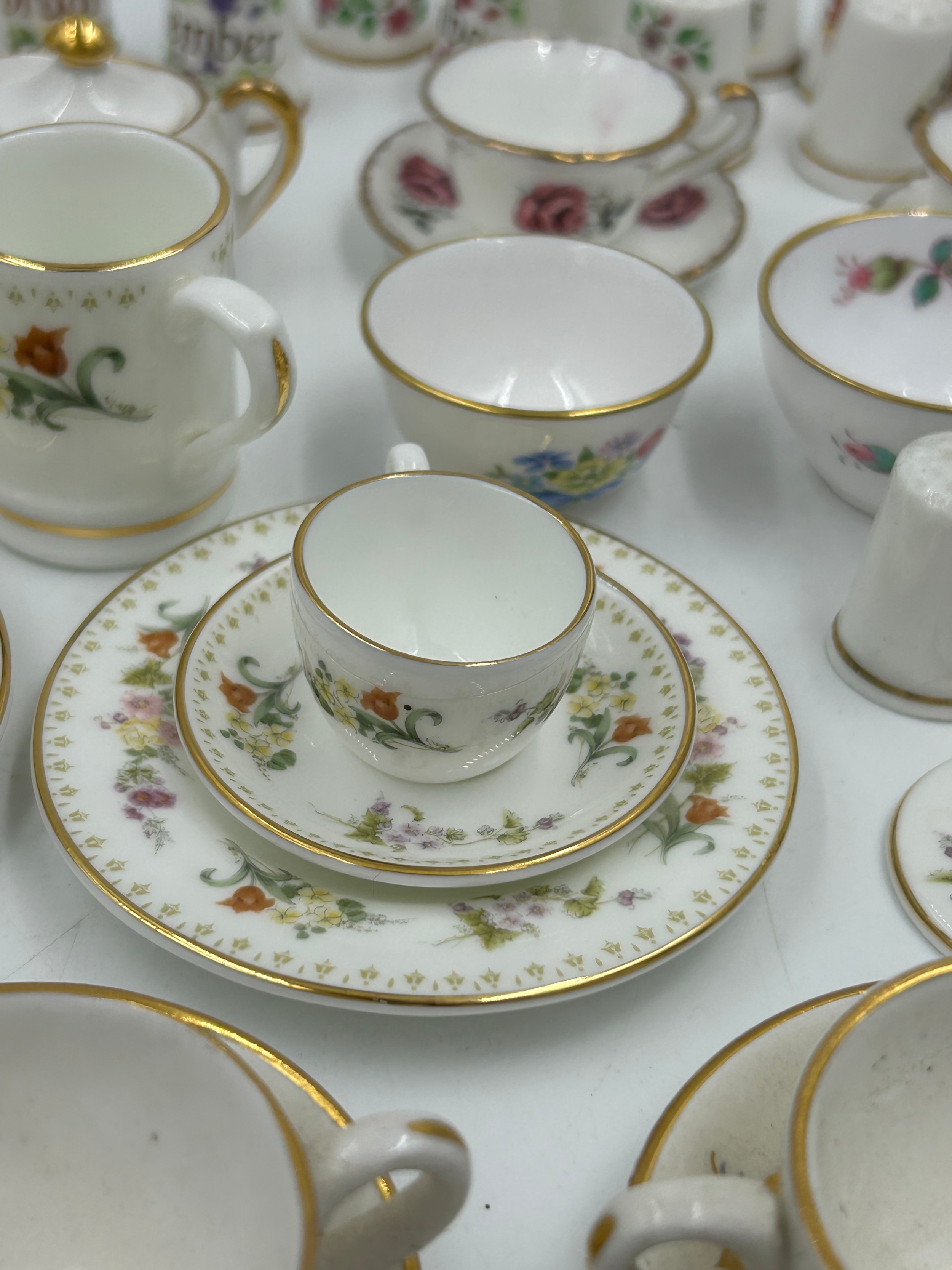 Various porcelain miniatures to include mainly Spode, 2 x Royal Doulton twin handled loving cups, Coalport bell, 2 x Caverswall cups and saucers, 2 cup , saucer and plate sets of Wedgwood, blue Wedgwood Jasperware and a quantity of thimbles.