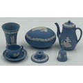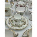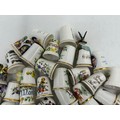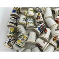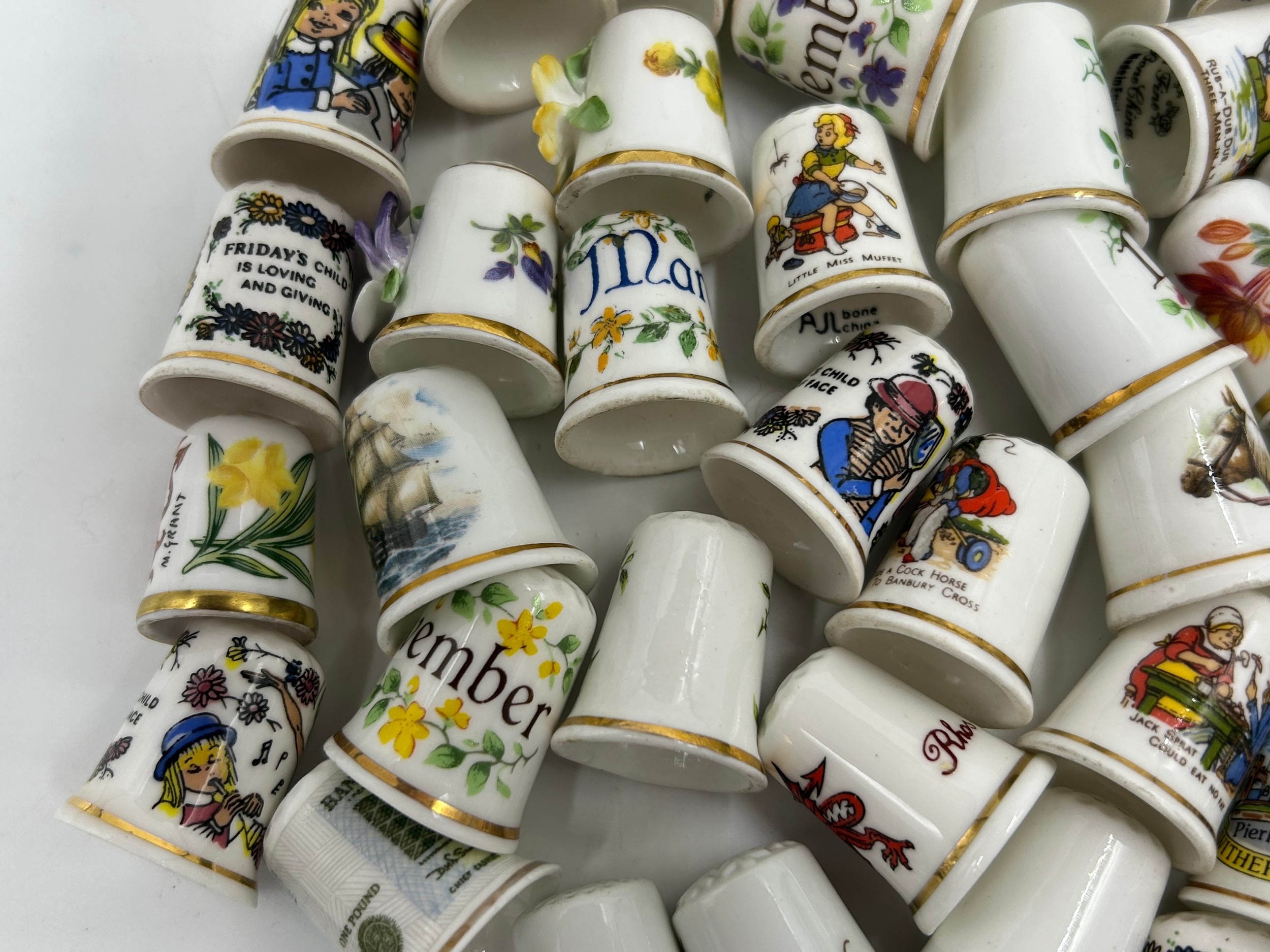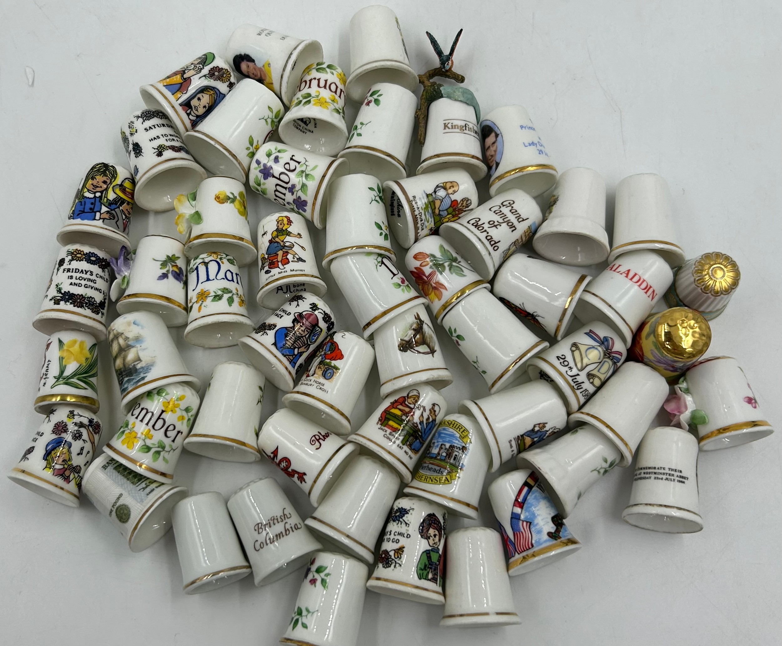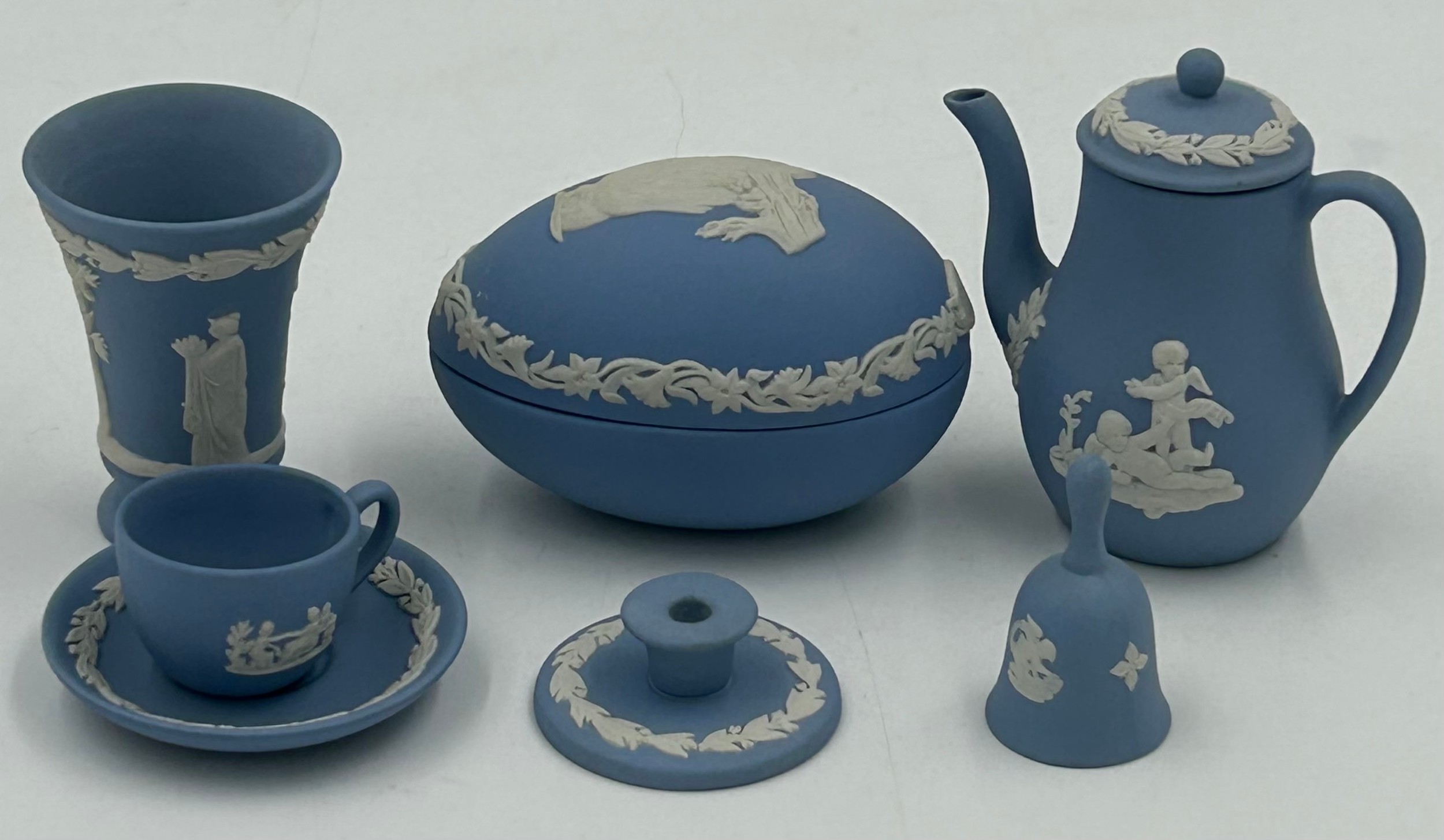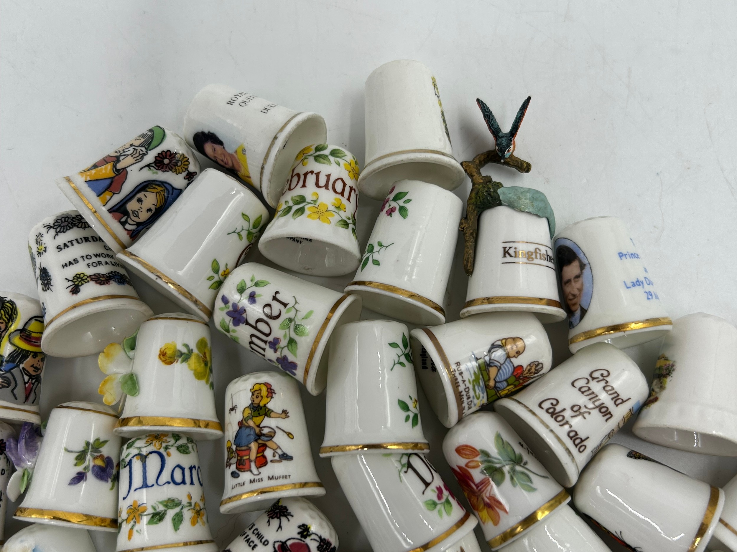 Various porcelain miniatures to include mainly Spode, 2 x Royal Doulton twin handled loving cups, Coalport bell, 2 x Caverswall cups and saucers, 2 cup , saucer and plate sets of Wedgwood, blue Wedgwood Jasperware and a quantity of thimbles.