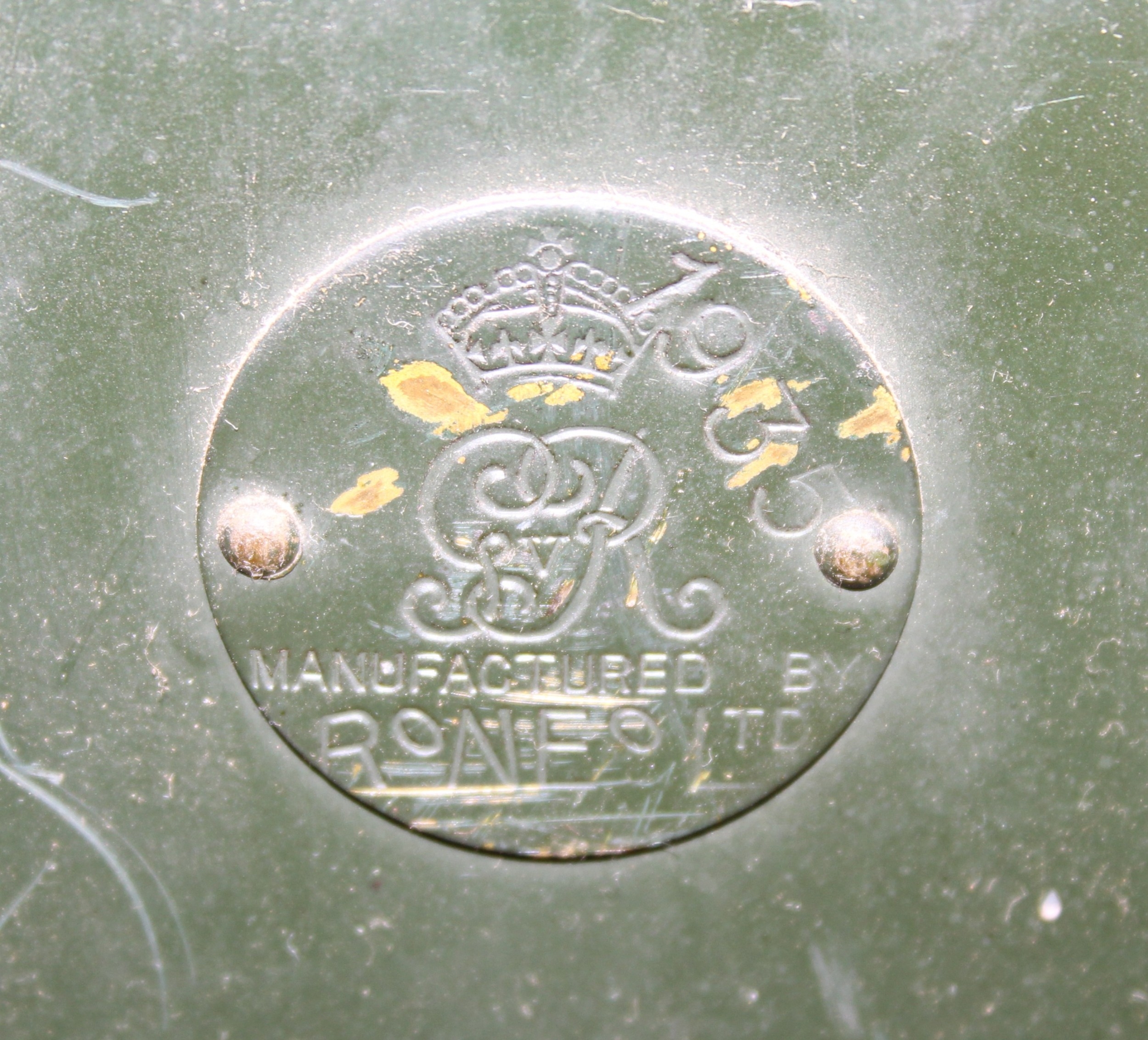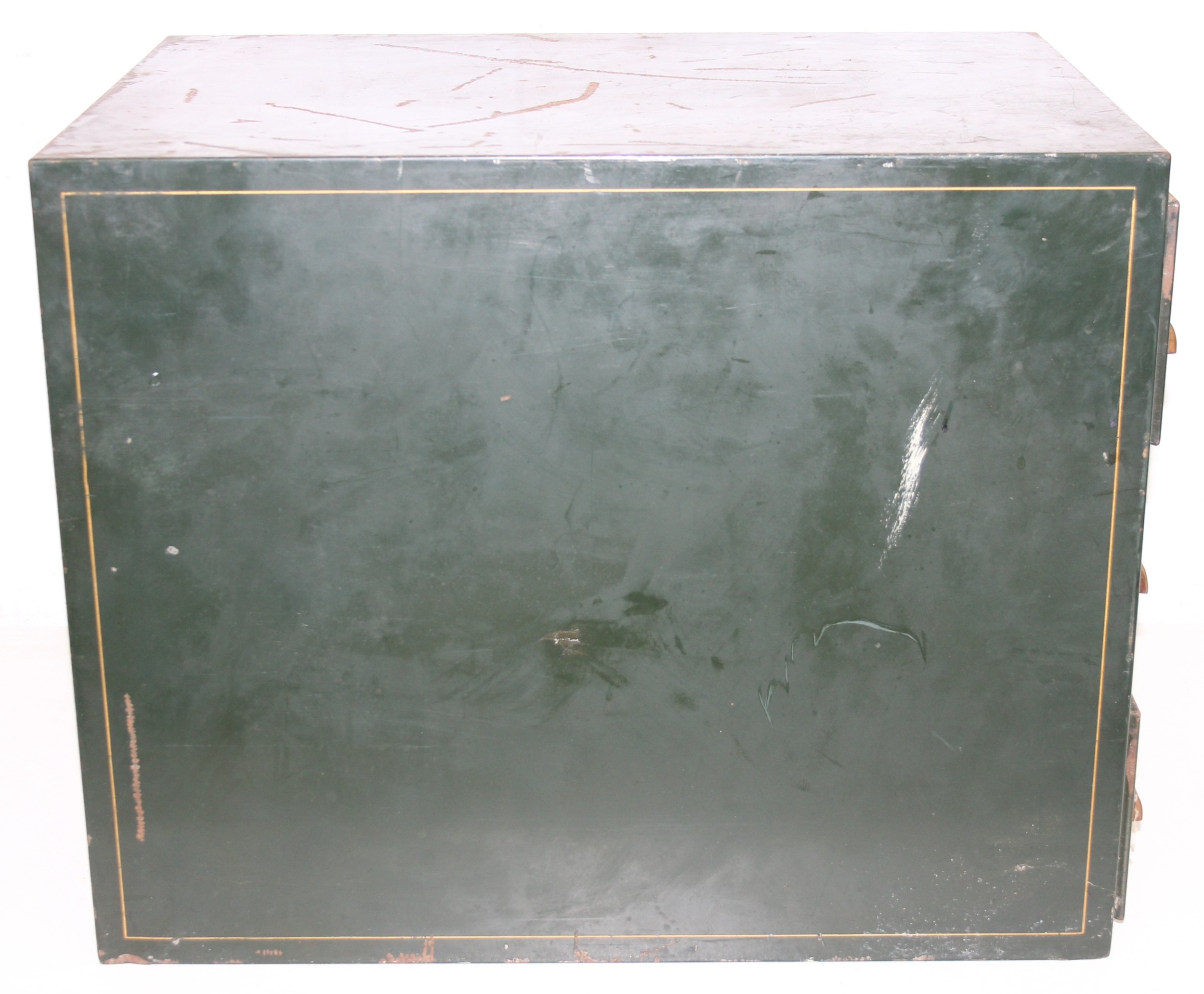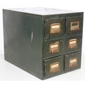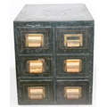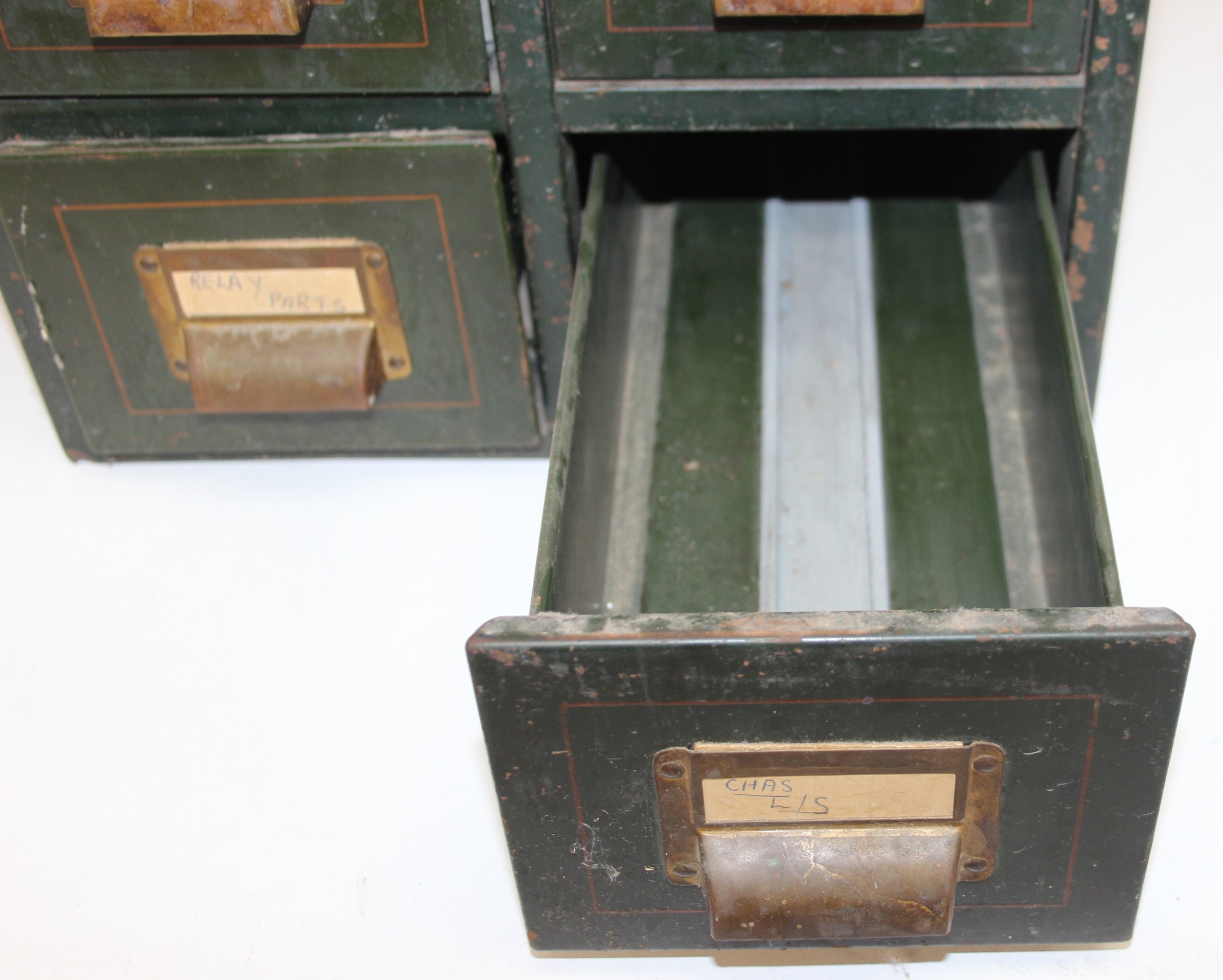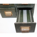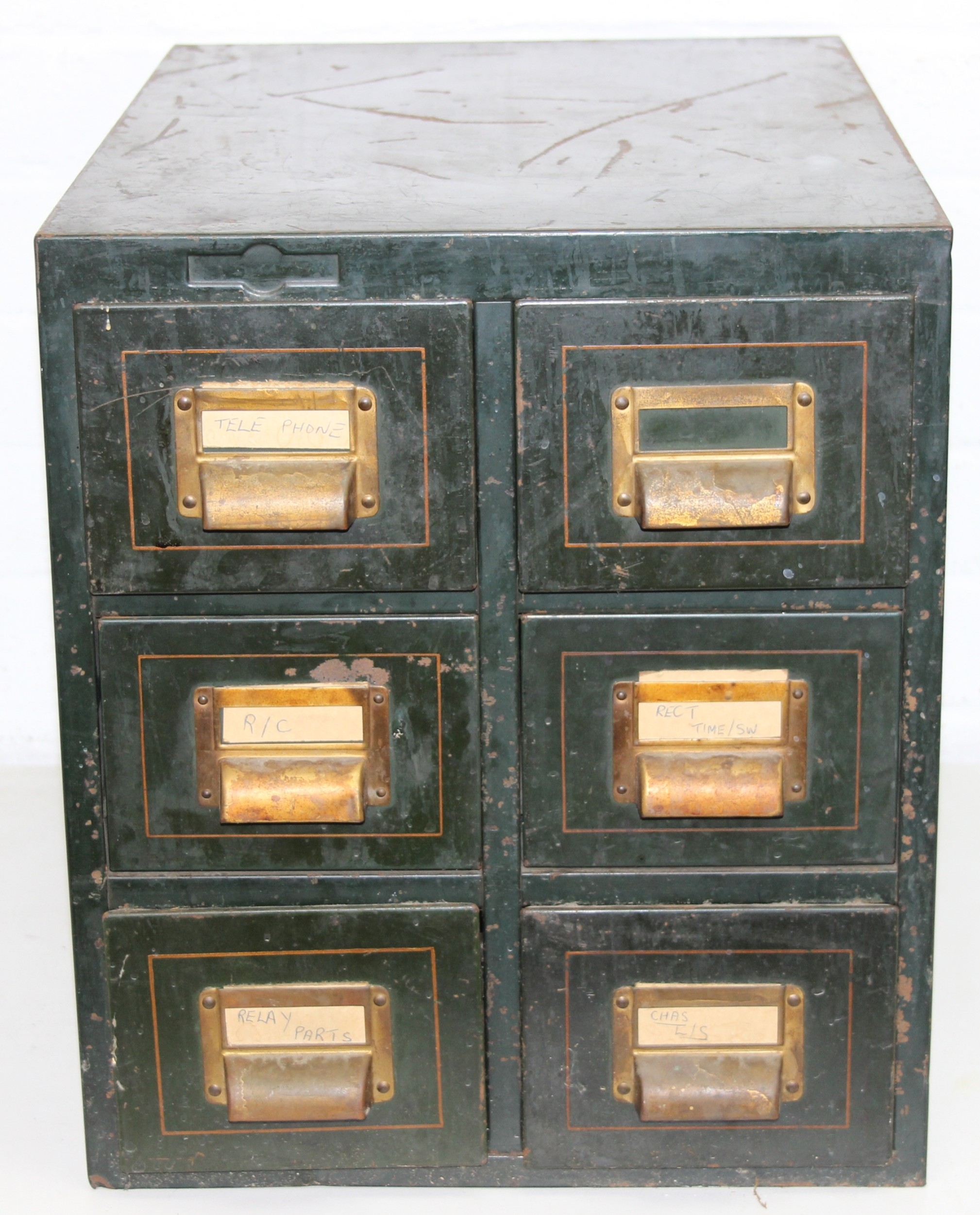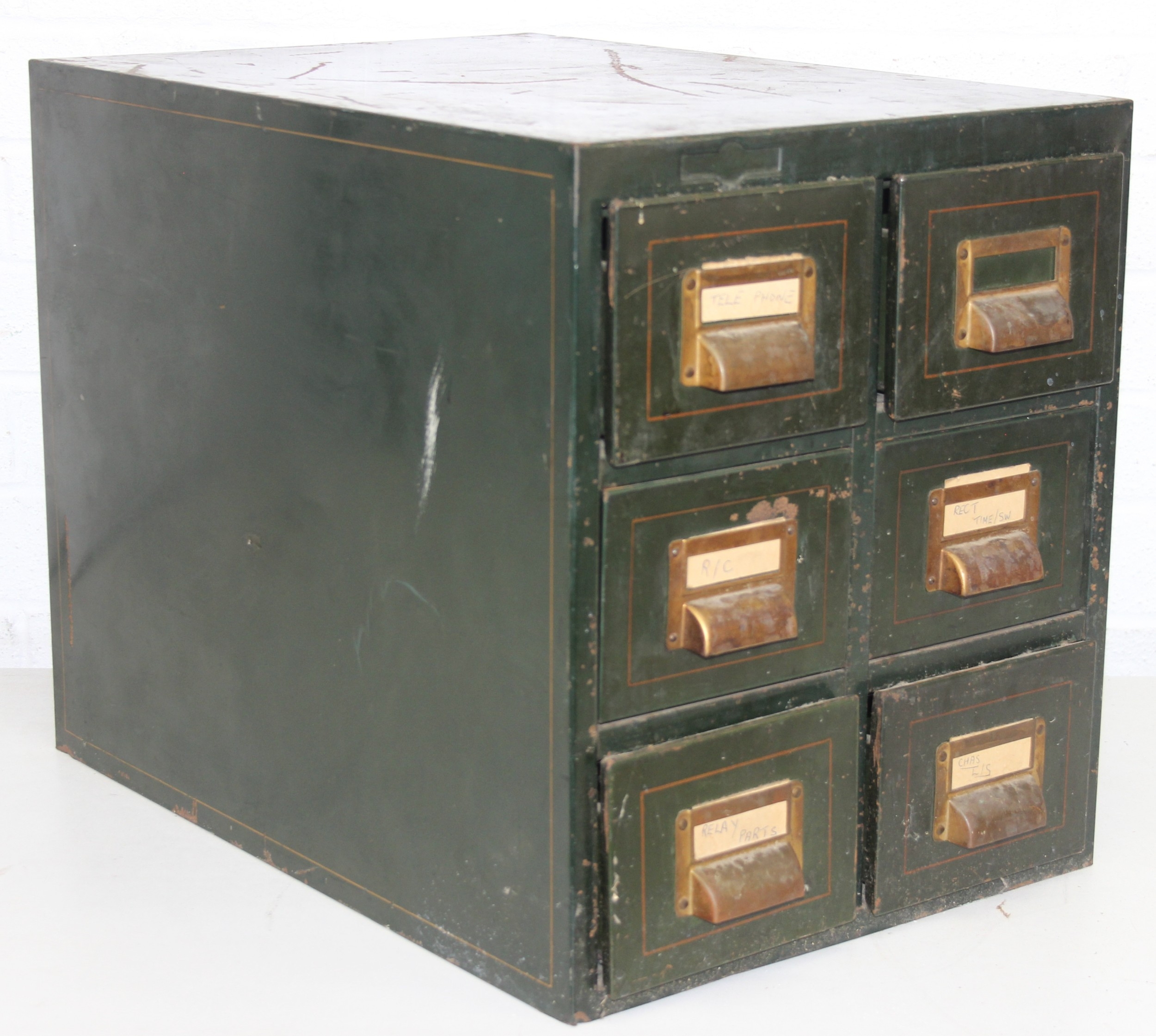 A 1930's Roneo six drawer set of filing drawers, green painted with pin striping and brass cup handles, marked to reverse and dated 1935, 52cm x 36cm x 41cm