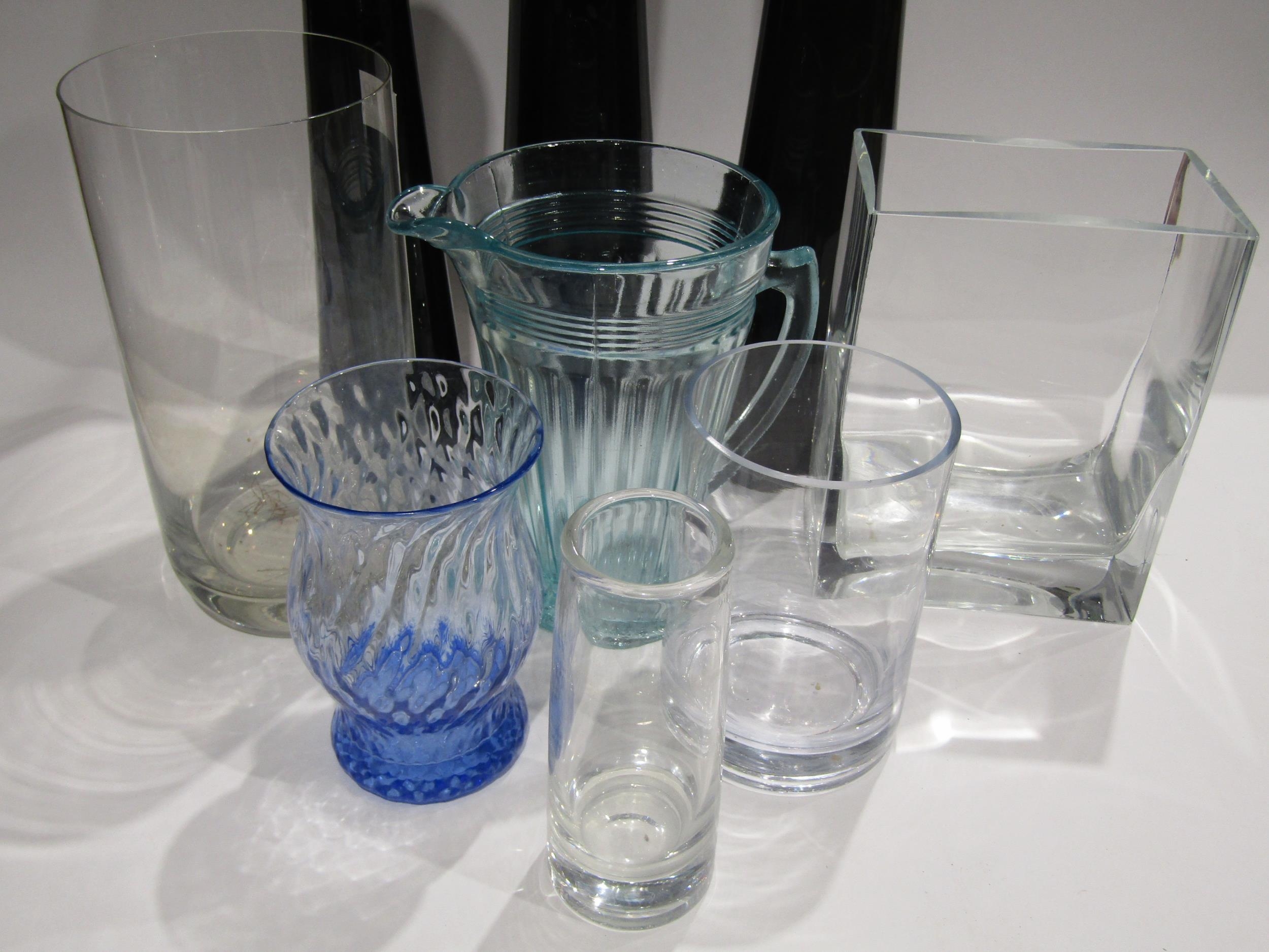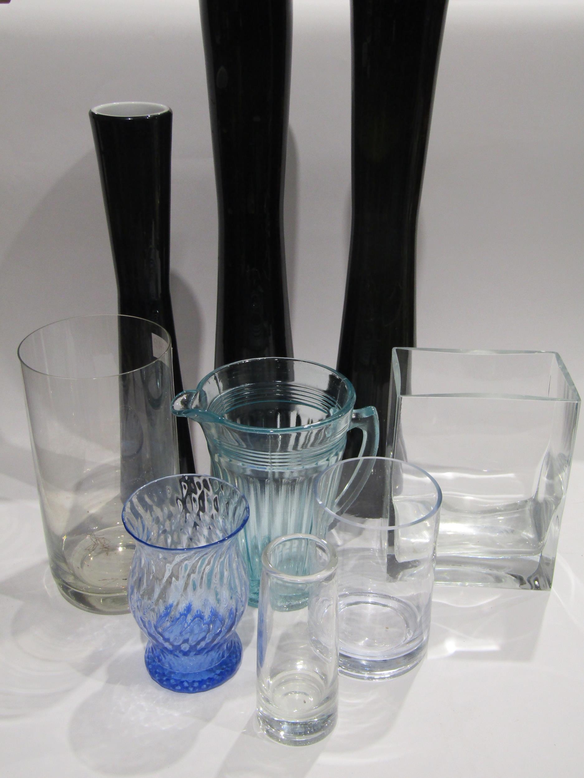 A mixed lots of glassware to include three mid century black slender vases, tallest 50cm