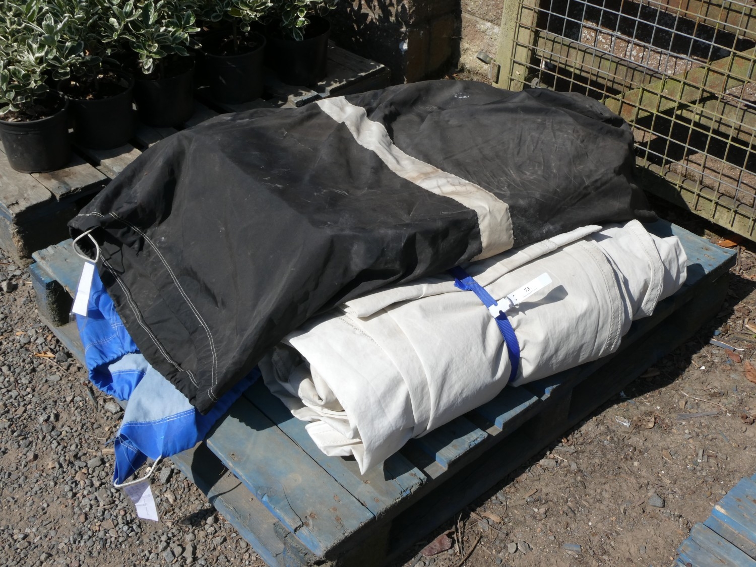 Three sails 8.5m x 3.7m, 10.5m x 5.2m (NRS partially removed, stained in centre) and one other