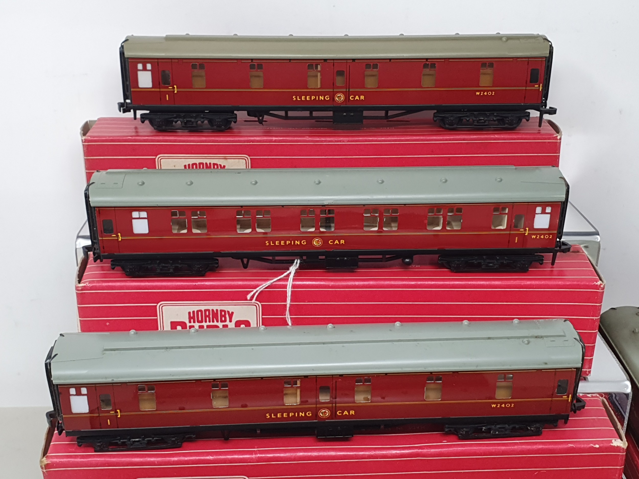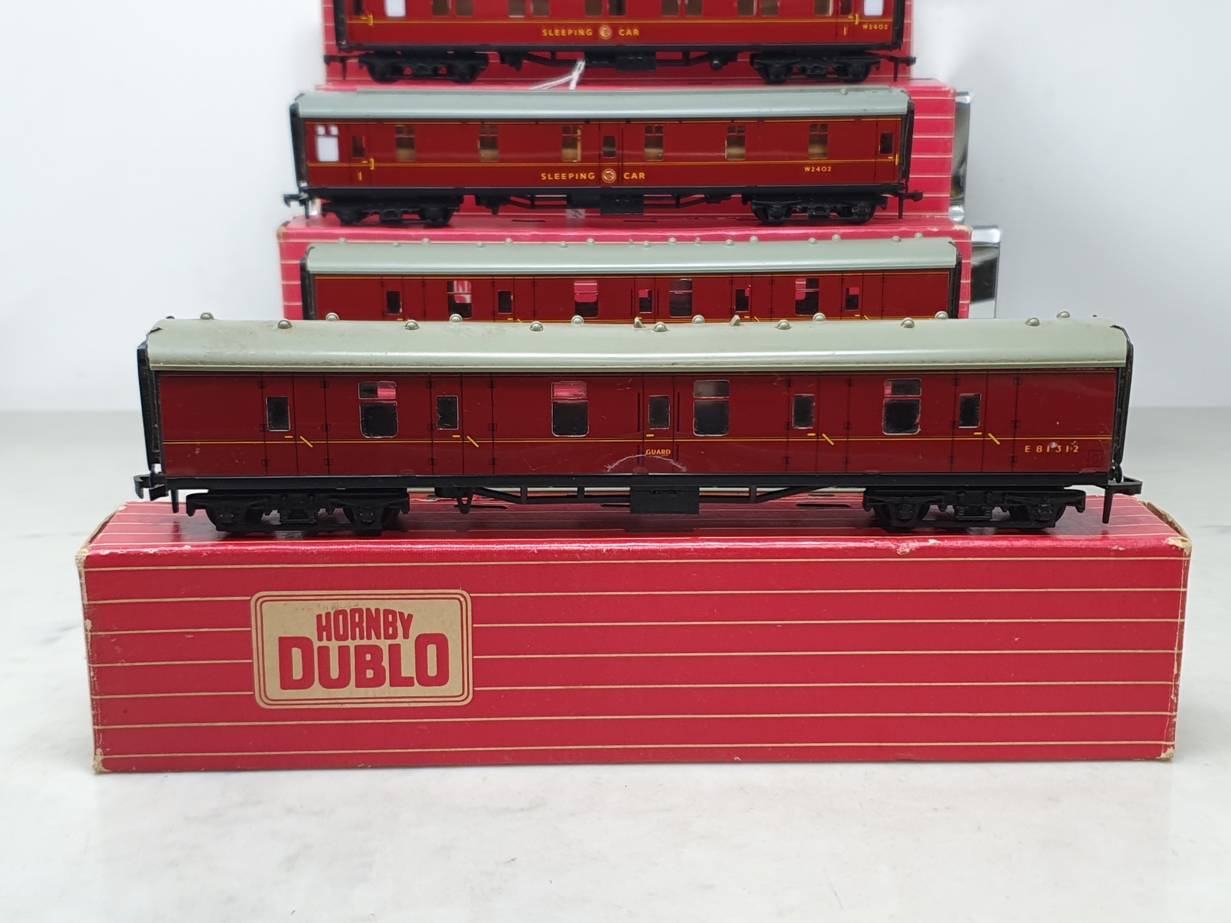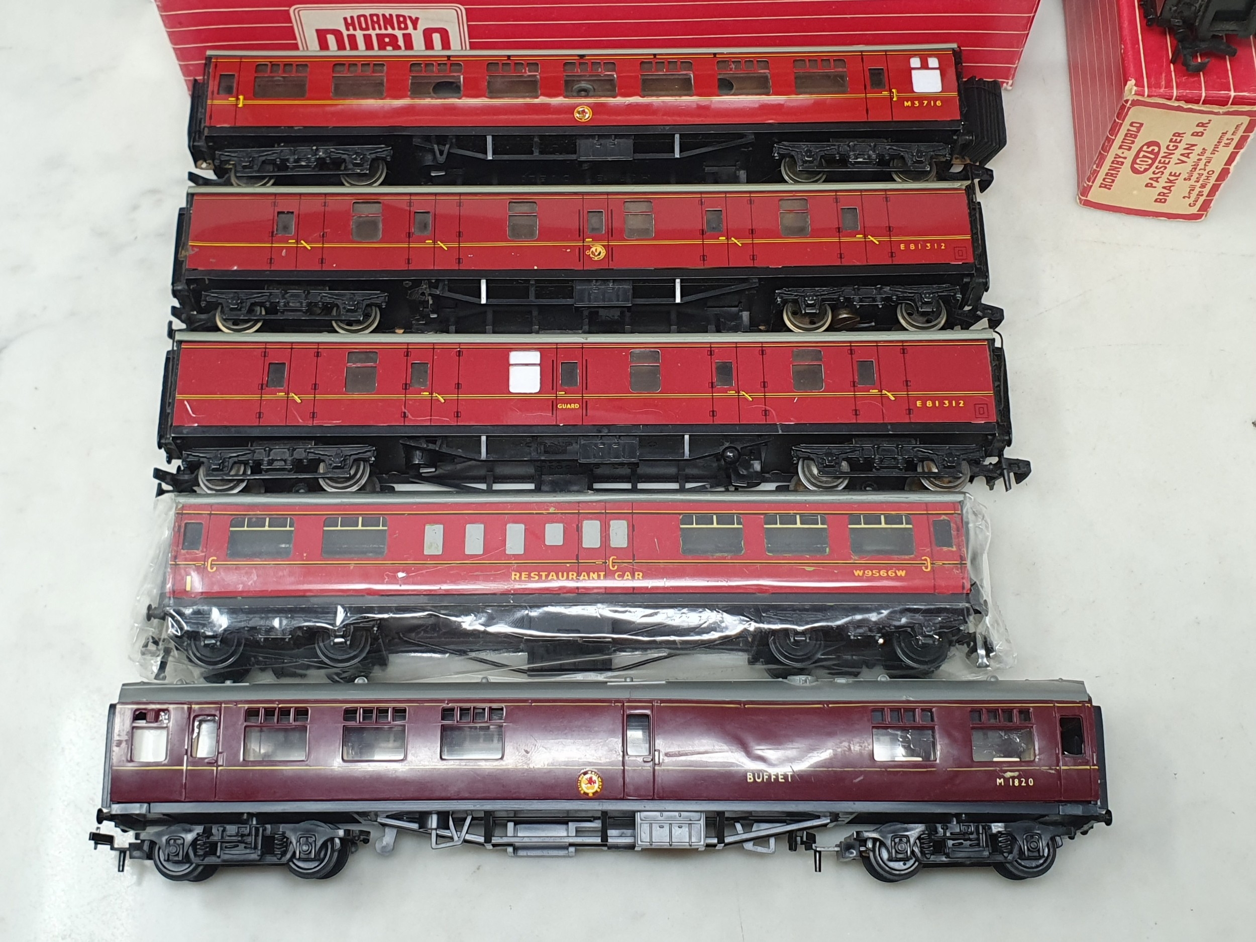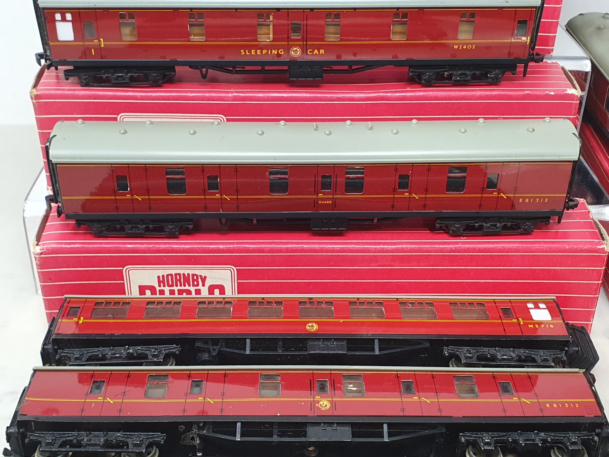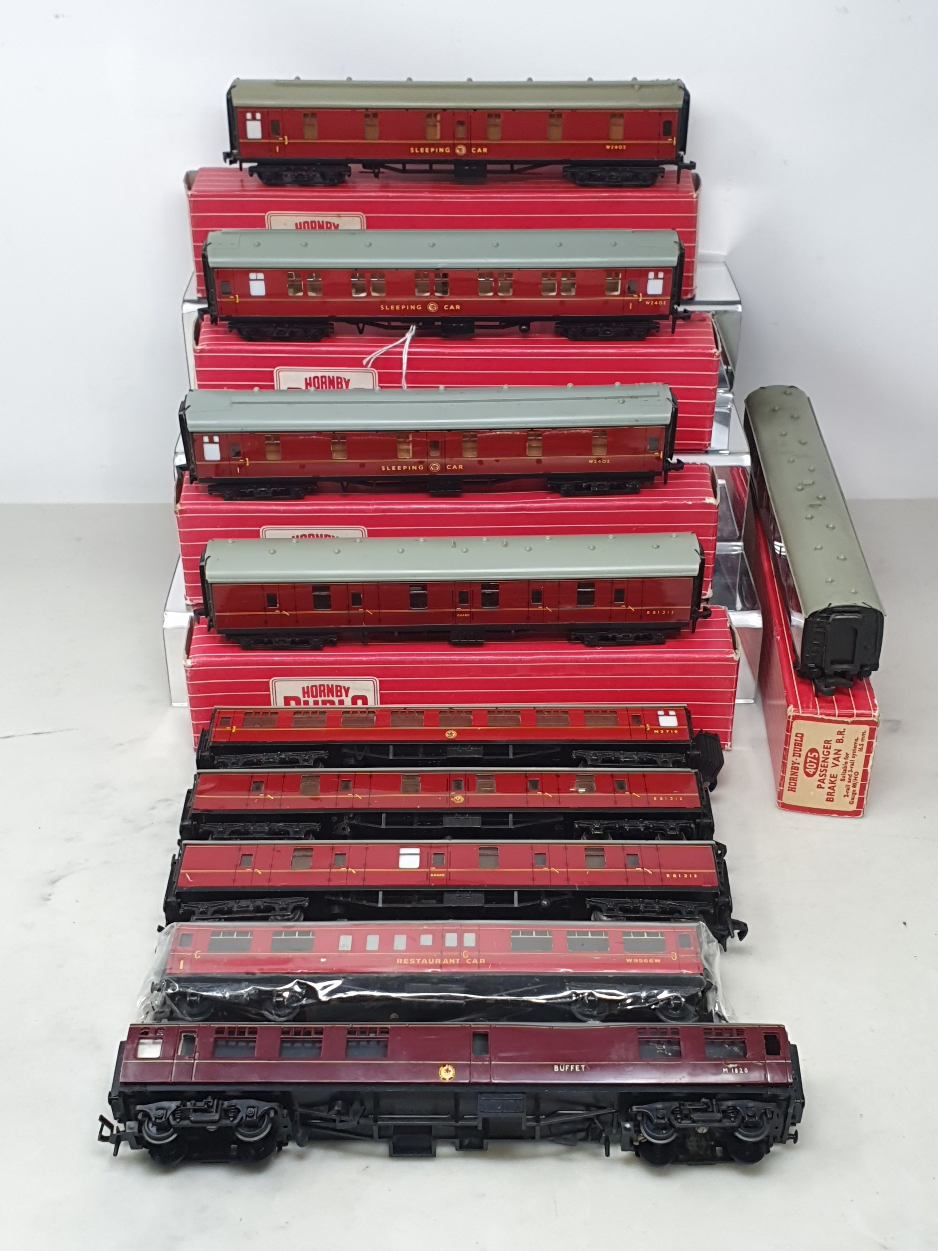 Five boxed Hornby Dublo BR Coaches comprising 2x 4075 Passenger Brakes and 3x 4078 Composite Sleeping Cars, together with four unboxed Hornby Dublo BR Coaches and an unboxed Trix Buffer Car, all VG-Ex