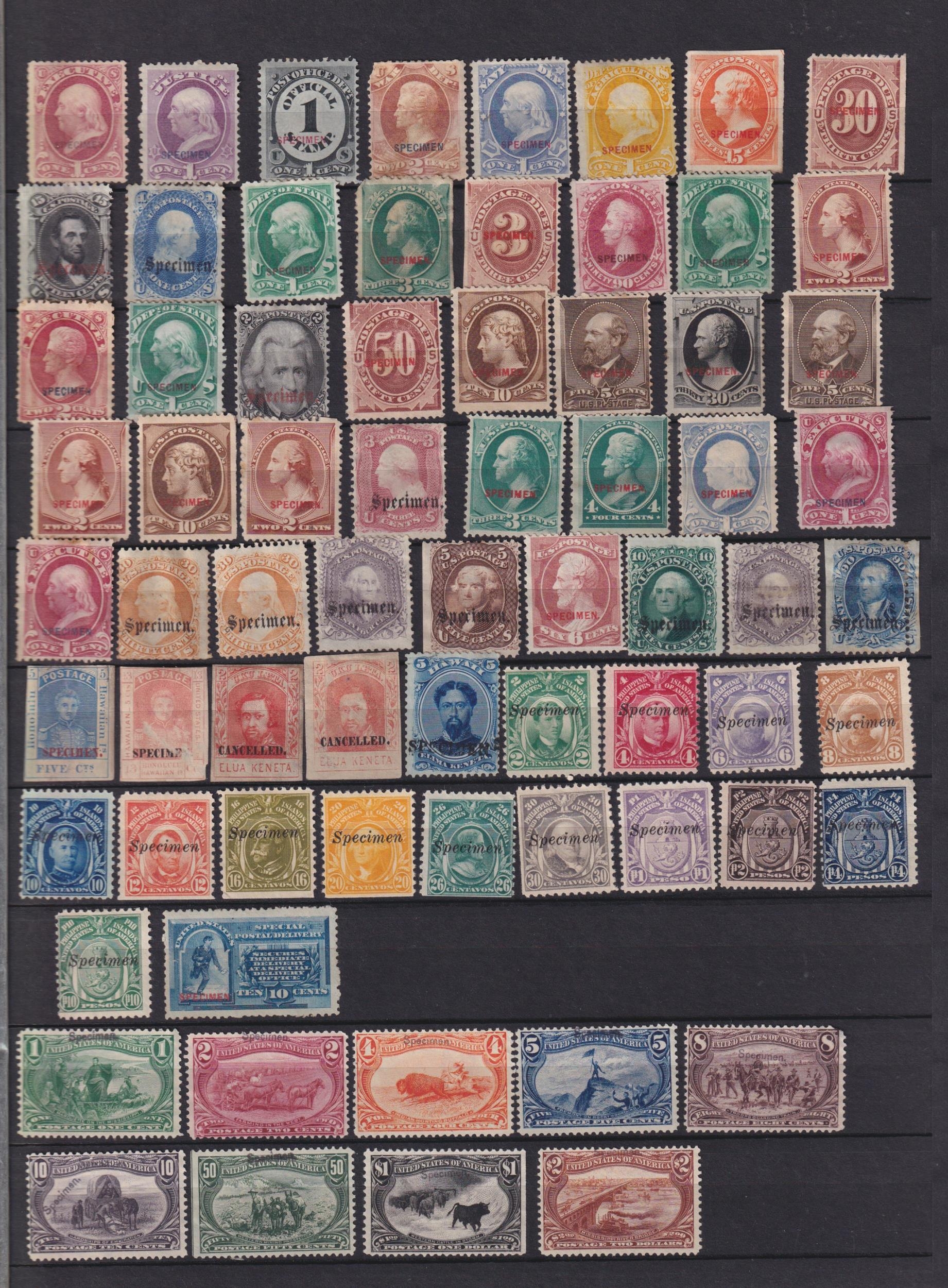 Accumulation of 50 mint (unused) early issues o/pt Specimen, incl Lincoln 15c, Washington 10c and 24c, Franklin 30c and 1898 Omaha set of 9 to$2. Also Philippines 1906 set of 14 to 10p. Mixed condition but attractive items, listed by Scott, these scarce and seldom seen items have an impressive catalogue value (the 1898 Trans-Mississippi set alone catalogues over $3000).