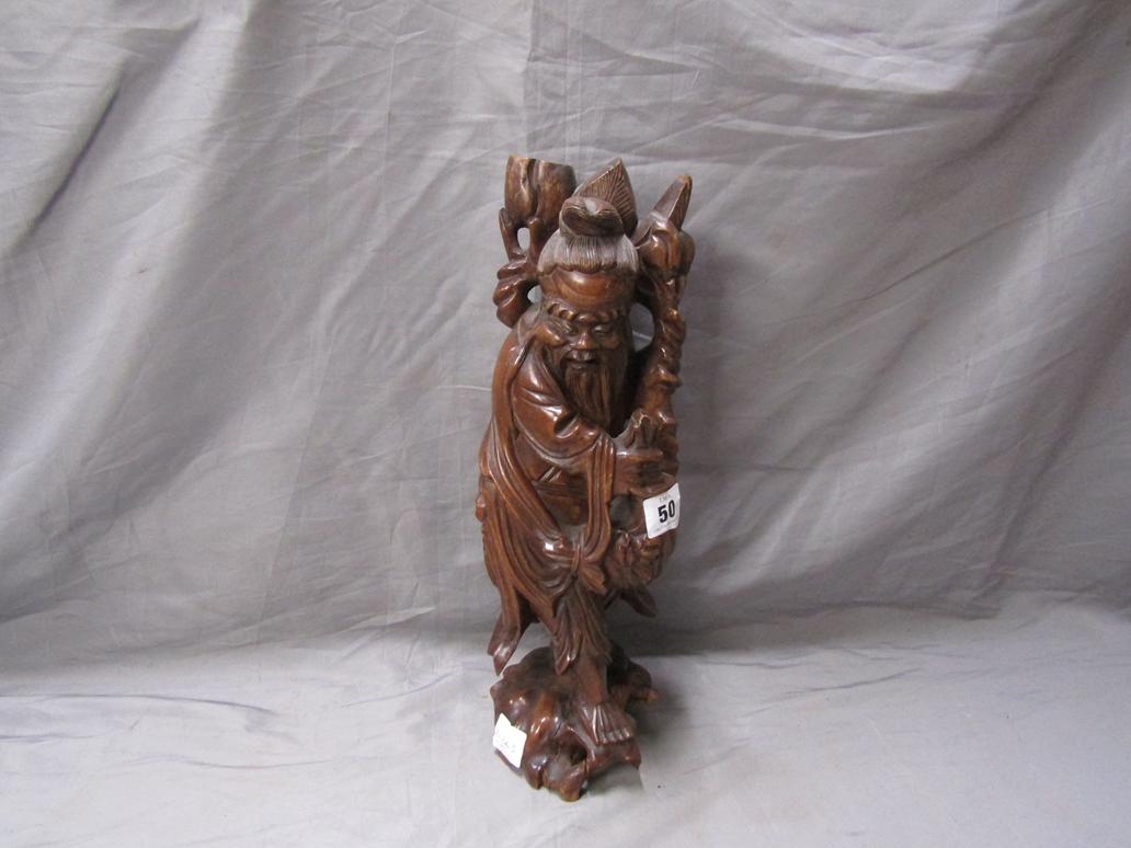 CARVED WOODEN FIGURE OF A CHINESE MAN WITH A FISH