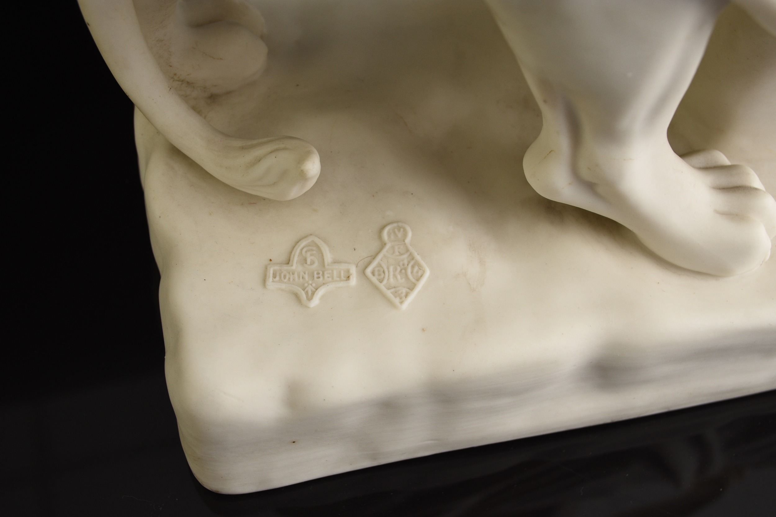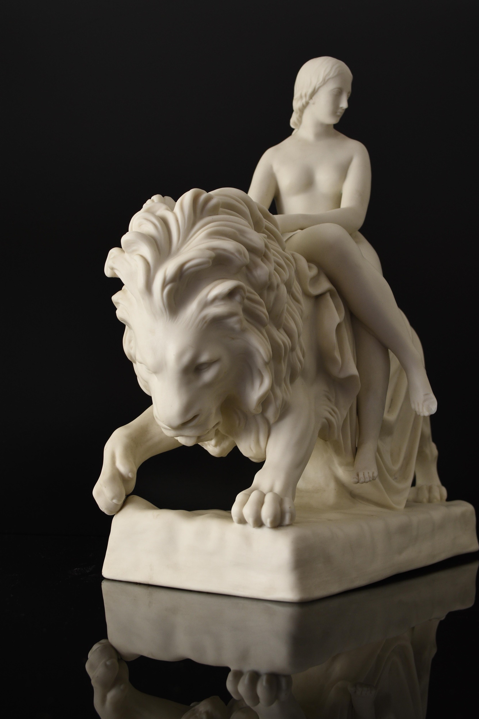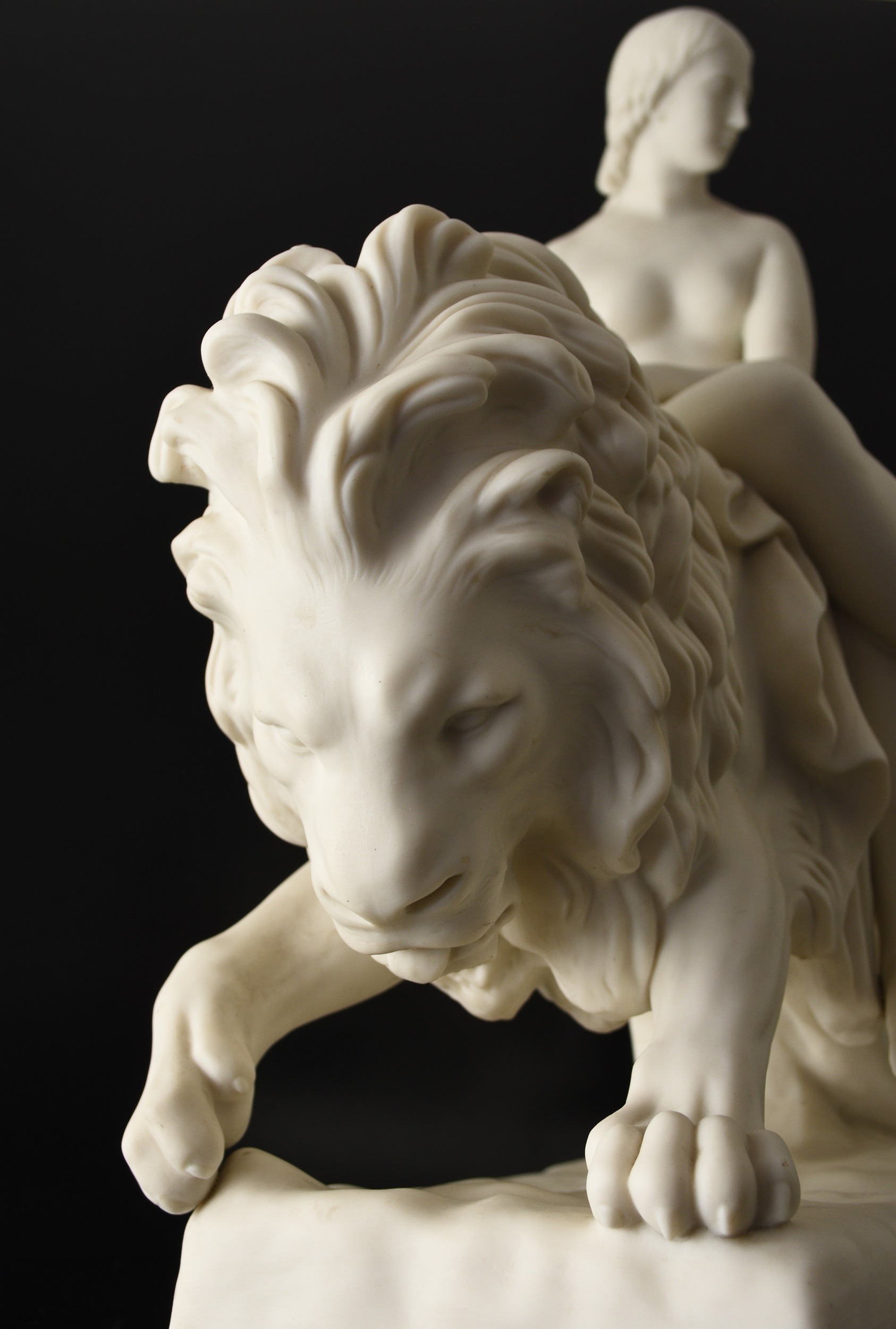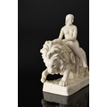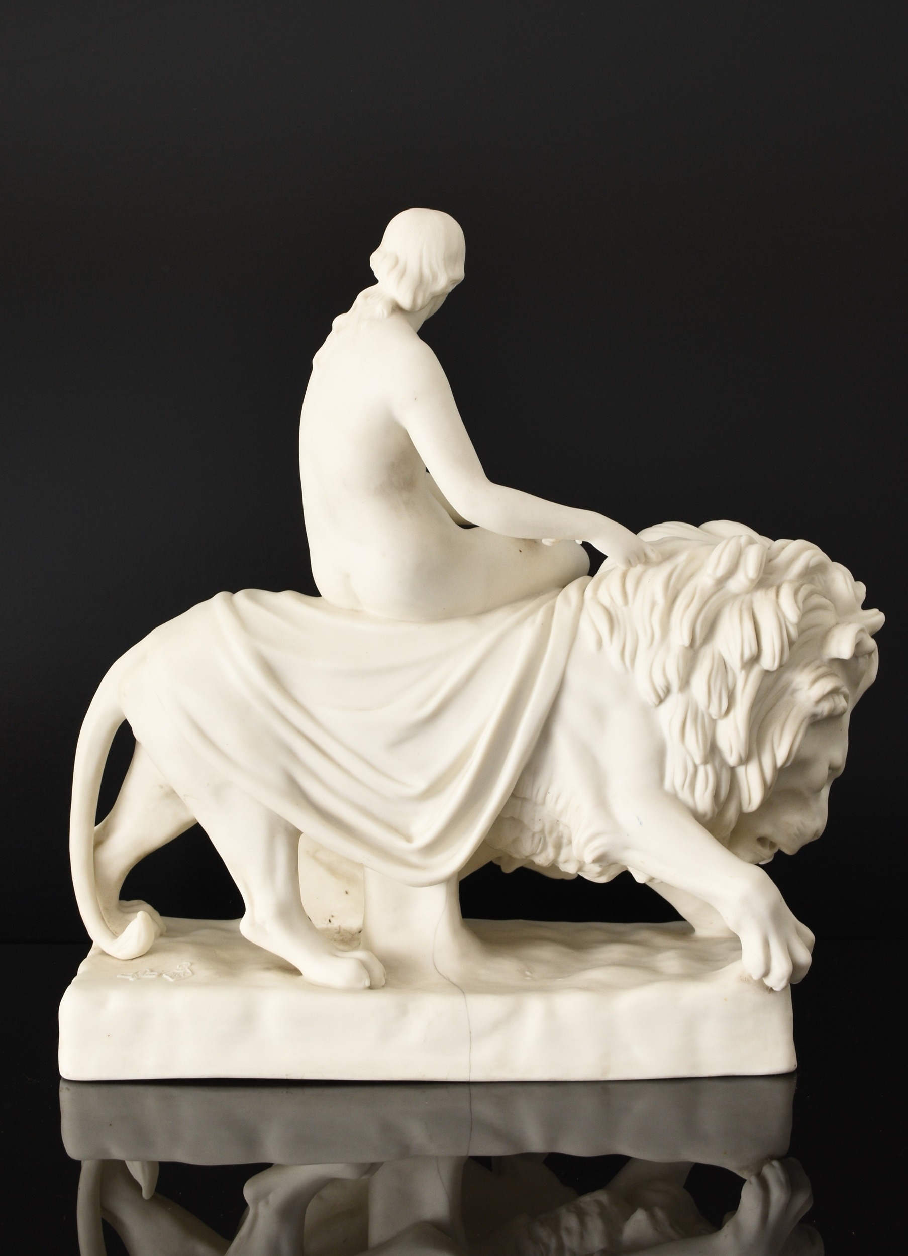 A Minton parian figural group of Una and the Lion after a model by John Bell (1812-1895), the nude figure seated astride a male lion, raised John Bell and Victorian diamond registration mark, impressed factory marks, 37cm high (a.f) Condition:Base cracked