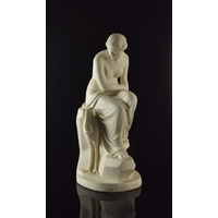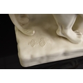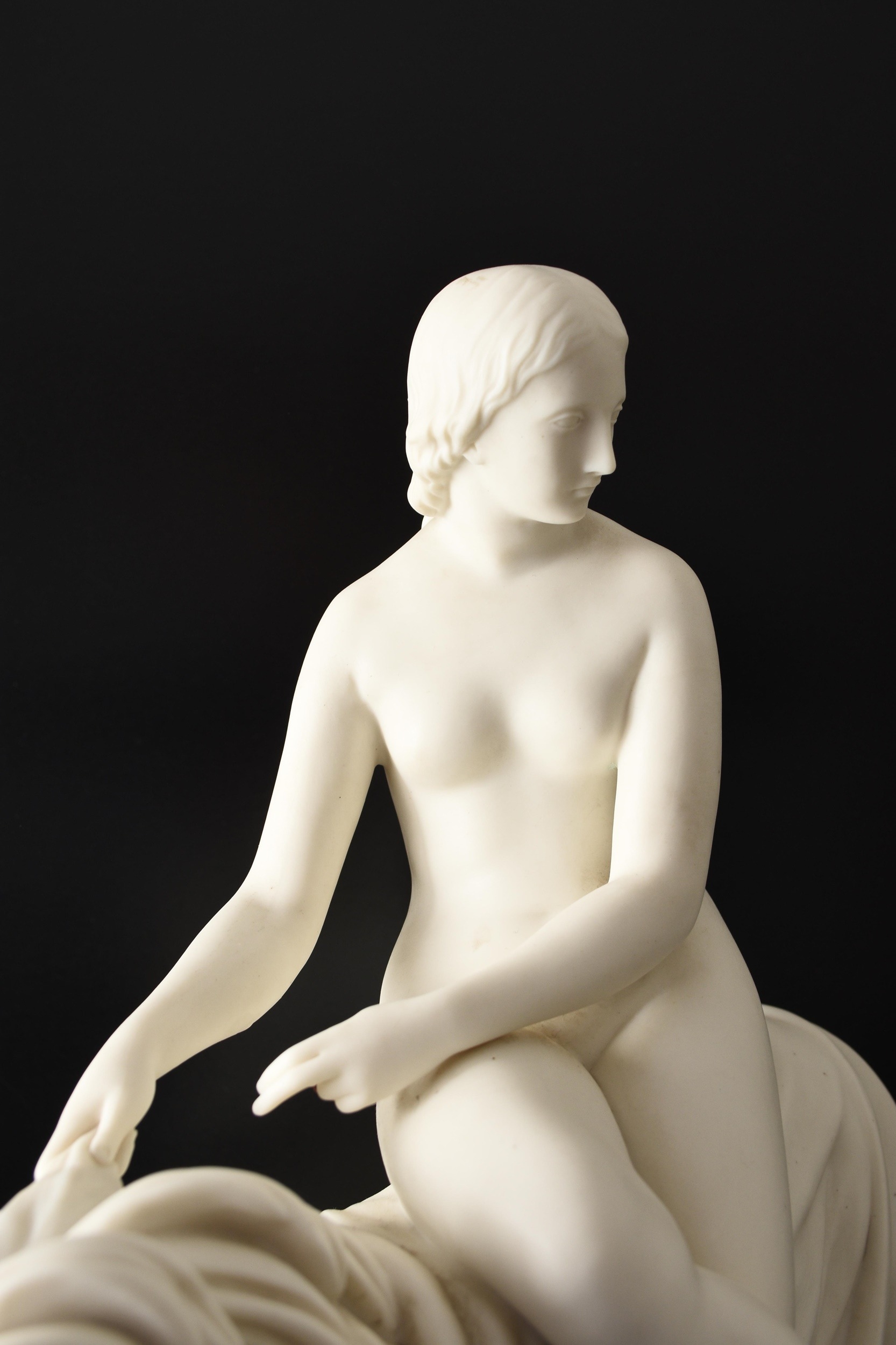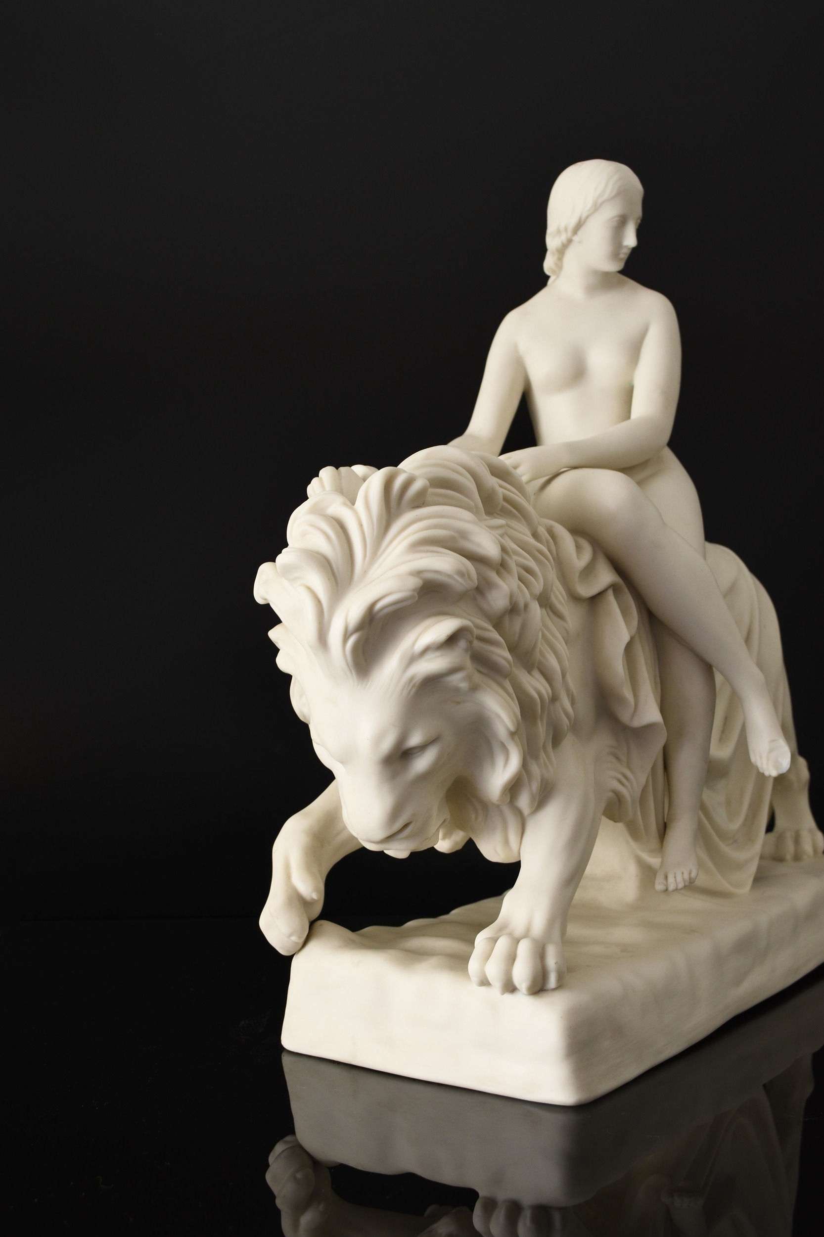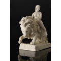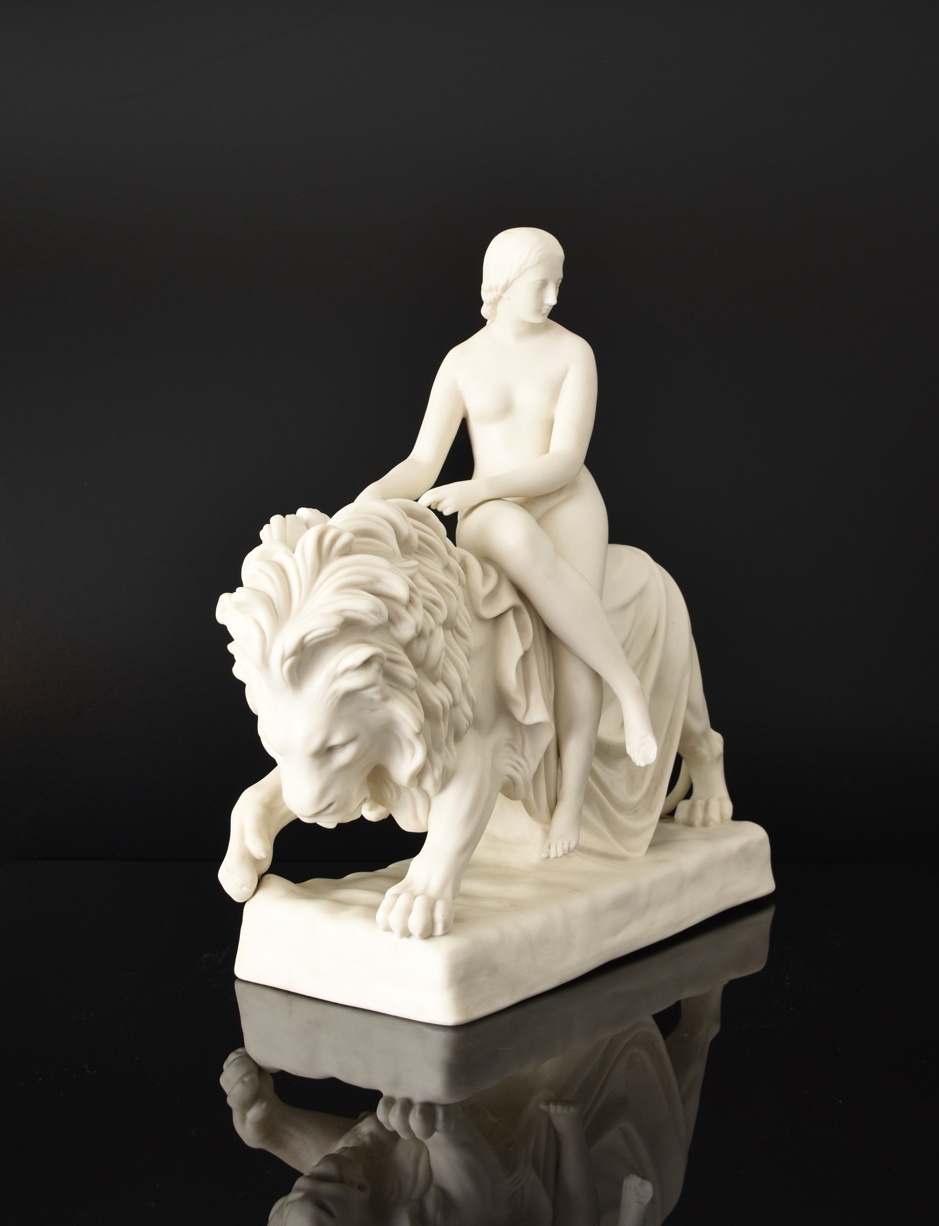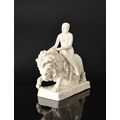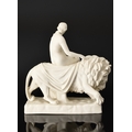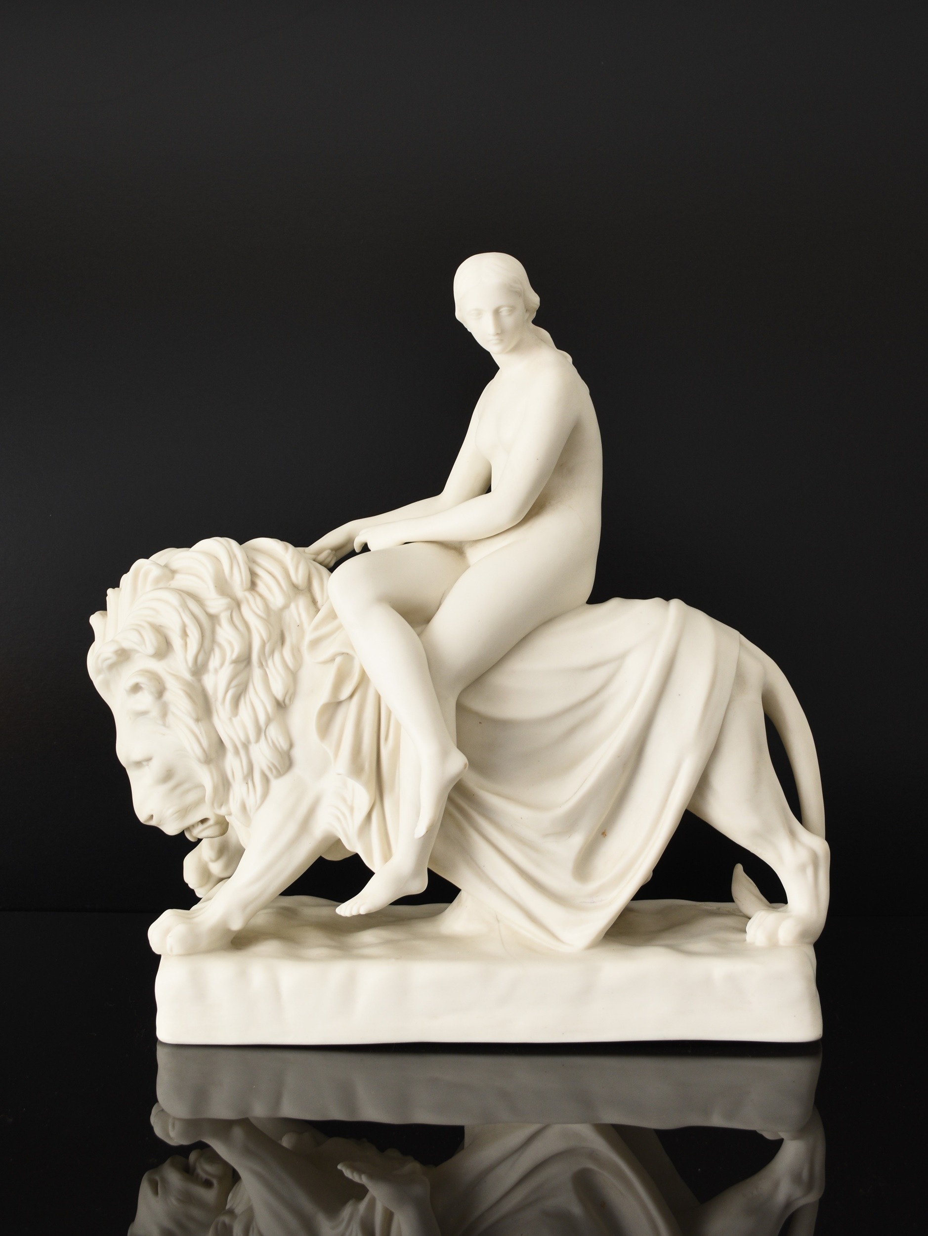 A Minton parian figural group of Una and the Lion after a model by John Bell (1812-1895), the nude figure seated astride a male lion, raised John Bell and Victorian diamond registration mark, impressed factory marks, 37cm high (a.f) Condition:Base cracked