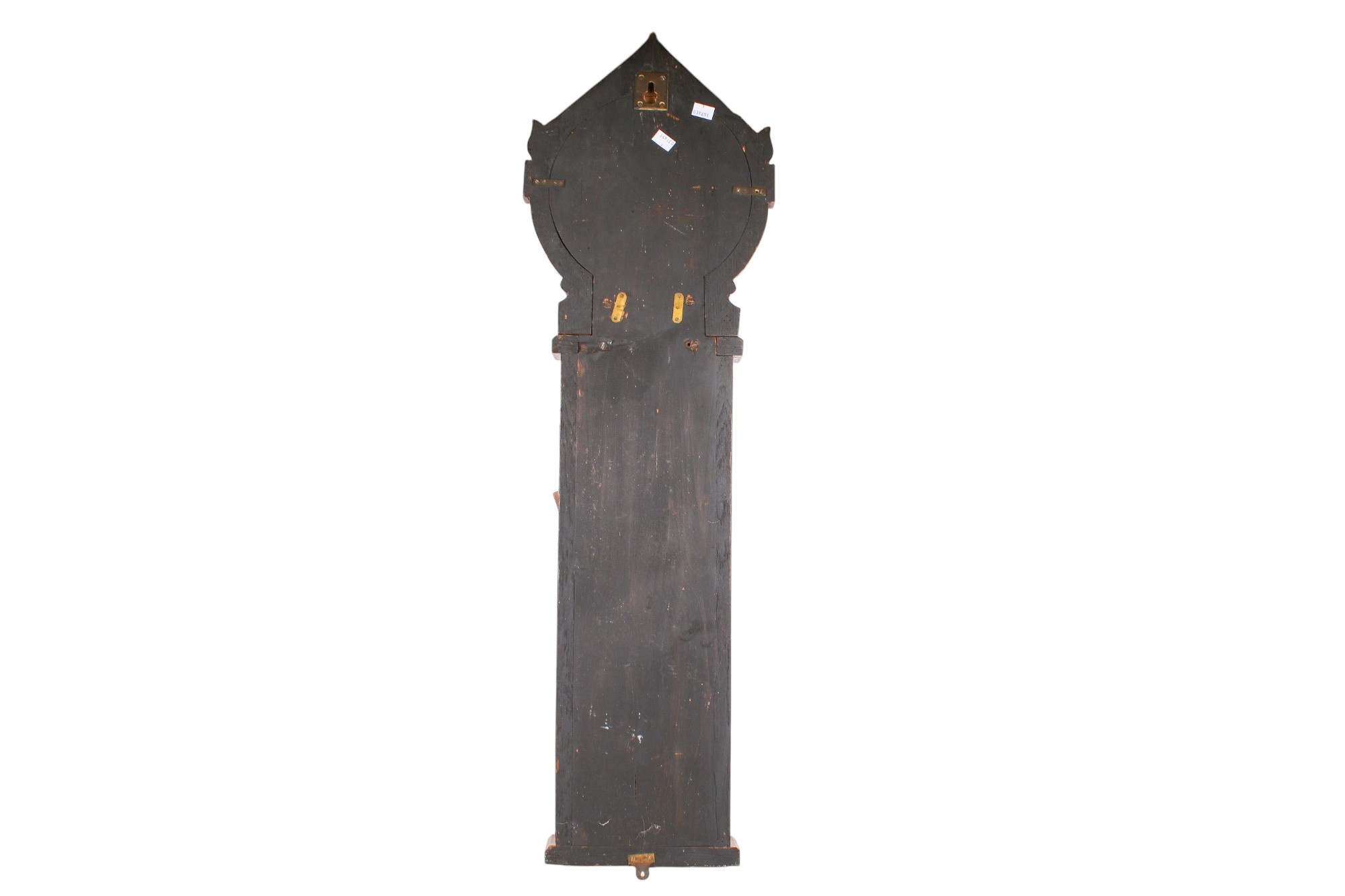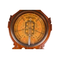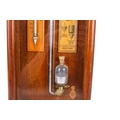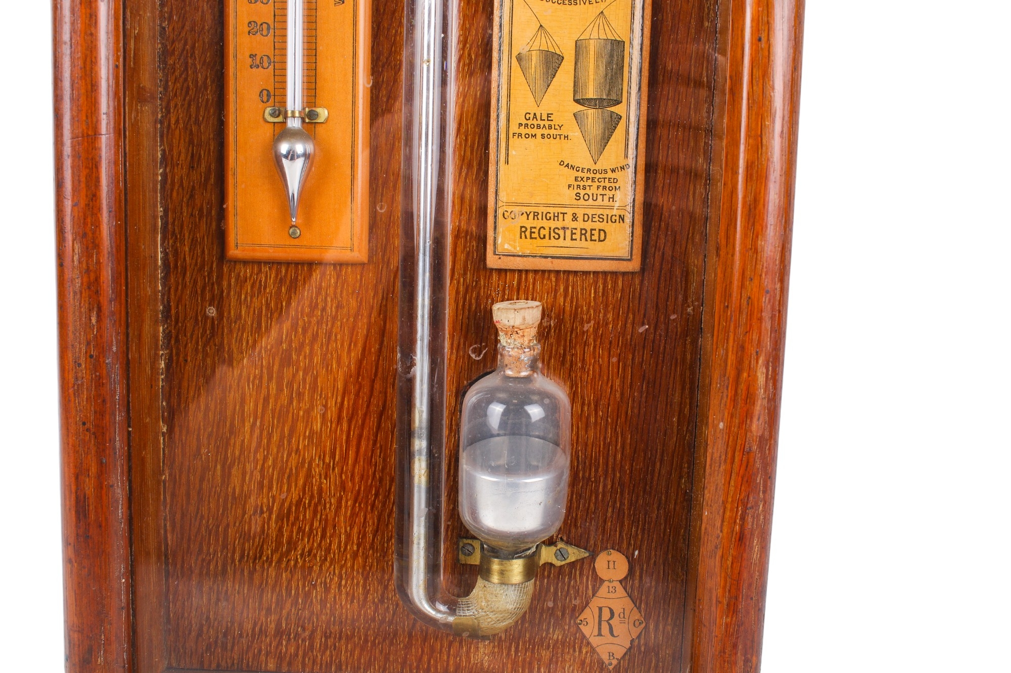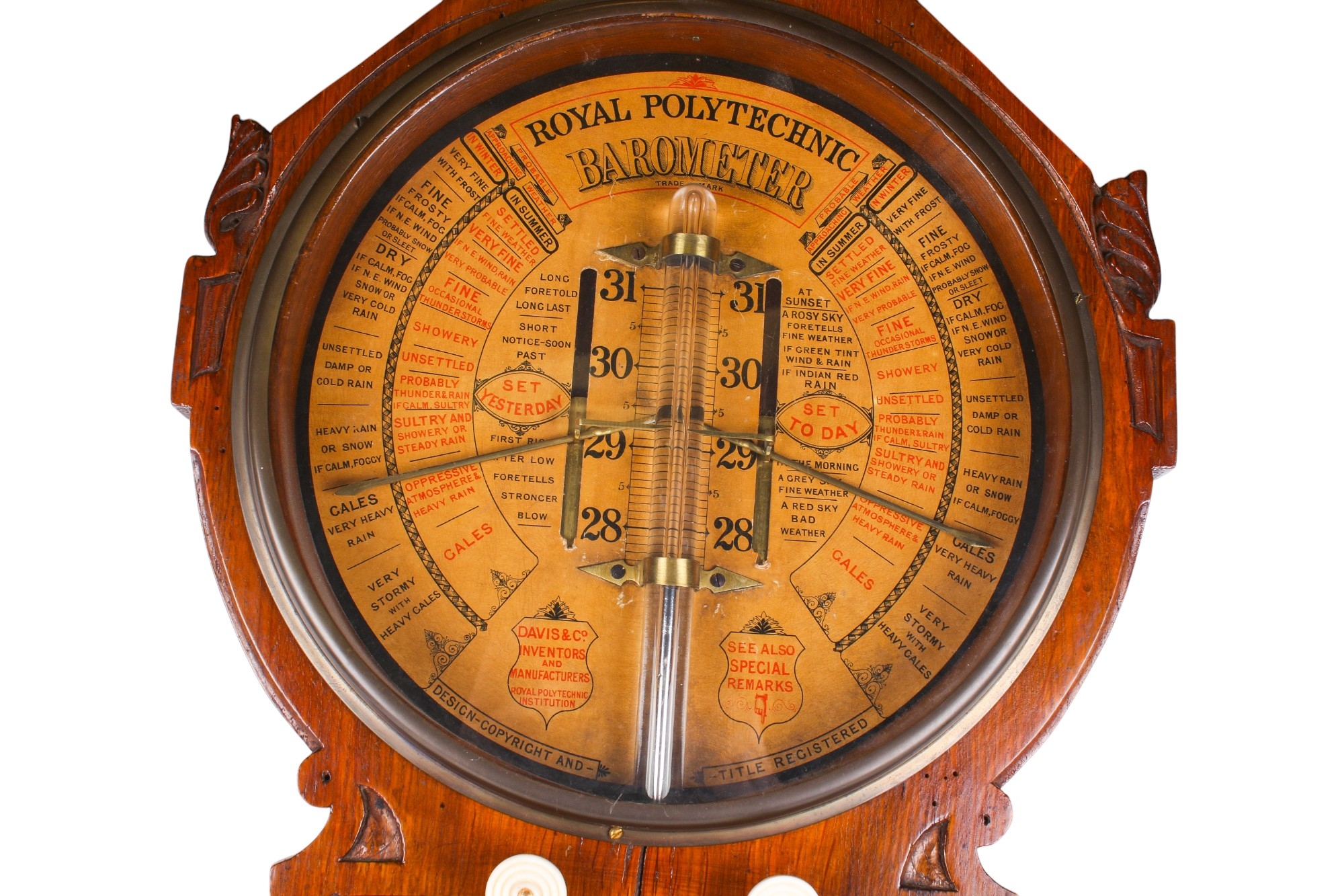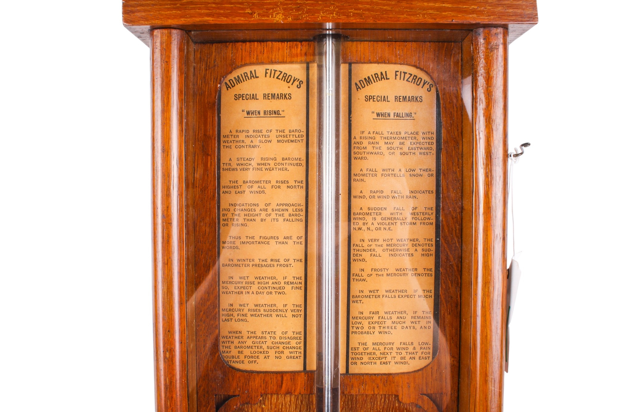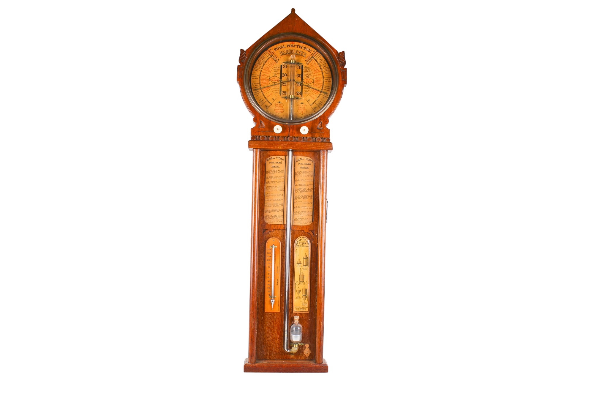 A 19th century Royal Polytechnic 'Admiral Fitzroy' oak cased barometer by Joseph Davis & Co. The case carved with a pediment enclosing a large printed card circular dial, a large glass tube running down to the trunk with an open well of mercury, to brass hands and sliding brass pointers and a pair of ivorine turning knobs, the glazed trunk with the original card labels with Admiral Fitzroy's comments and a wine thermometer, height 104cm