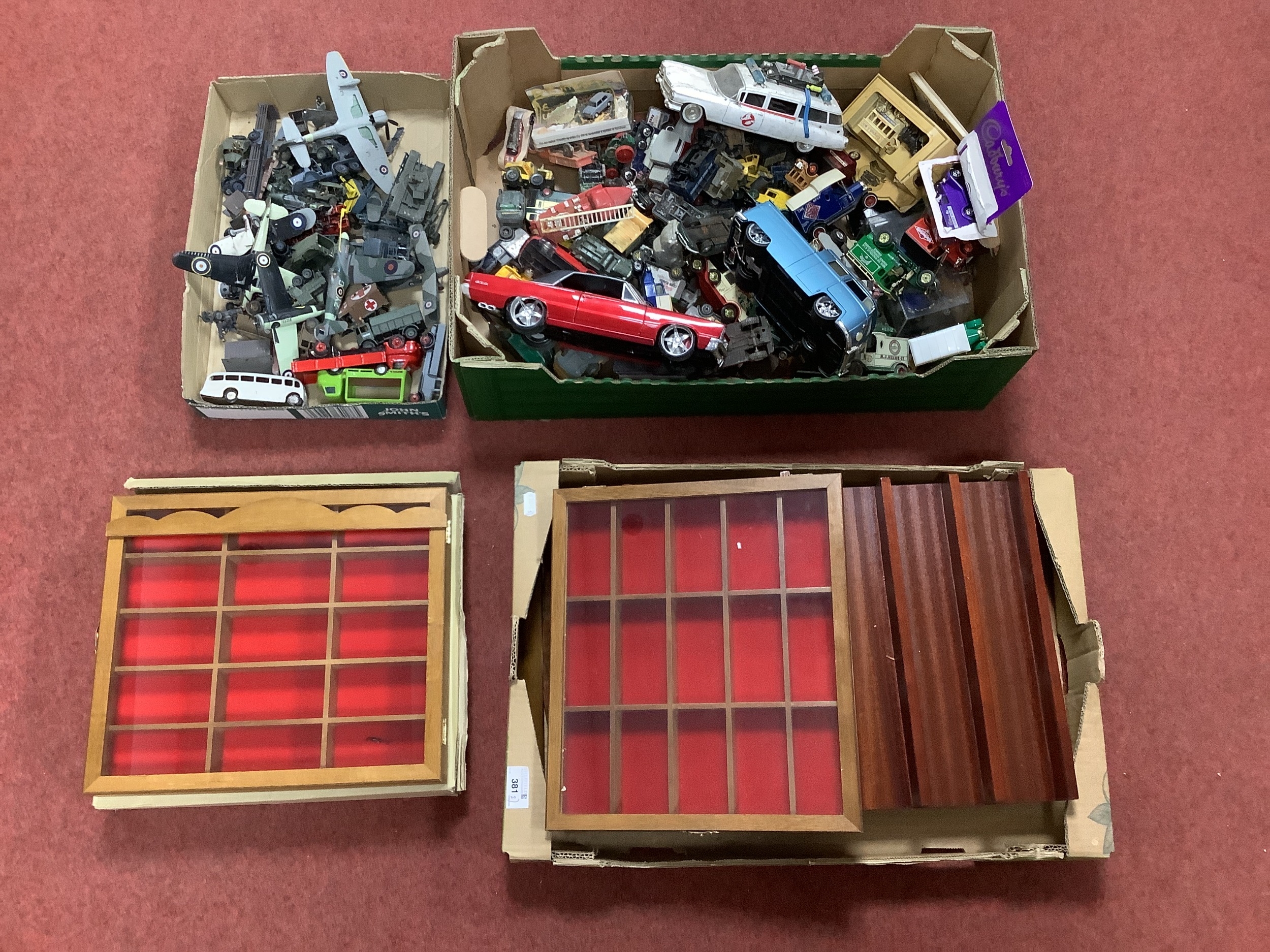 A Quantity of Diecast, Plastic Model Vehicles by Corgi, Dinky, Lledo and other. Many models would benefit from a clean, original repainted Corgi and Dinky noted. All playworn. Together with Five Wooden Wall Mounted Display Cabinets/Shelves suitable for displaying diecast model vehicles