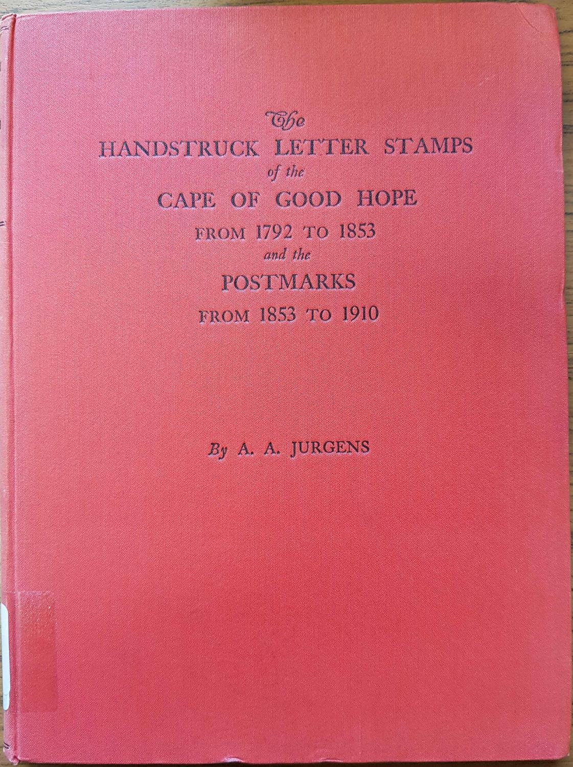 THE HANDSTRUCK LETTER STAMPS OF THE CAPE OF GOOD HOPE: by Jurgens (c1943), HB in red. Good condition with bumped corner and slightly faded spine. (1)Cross Reference: CAPE OF GOOD HOPE
