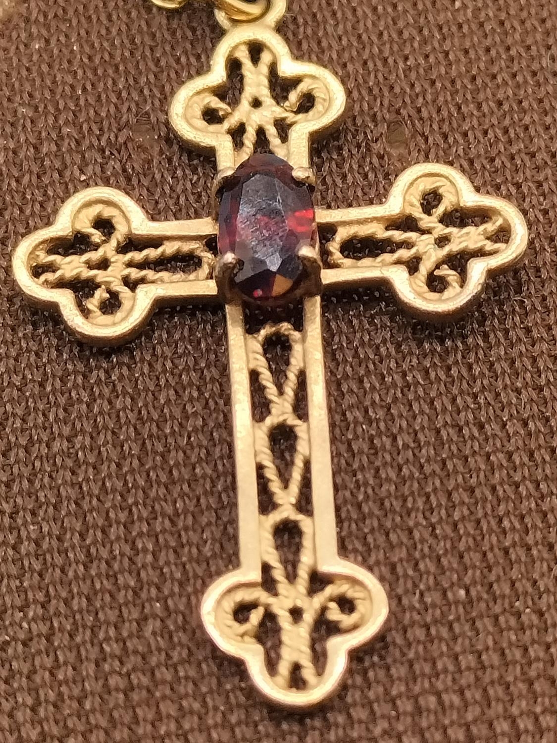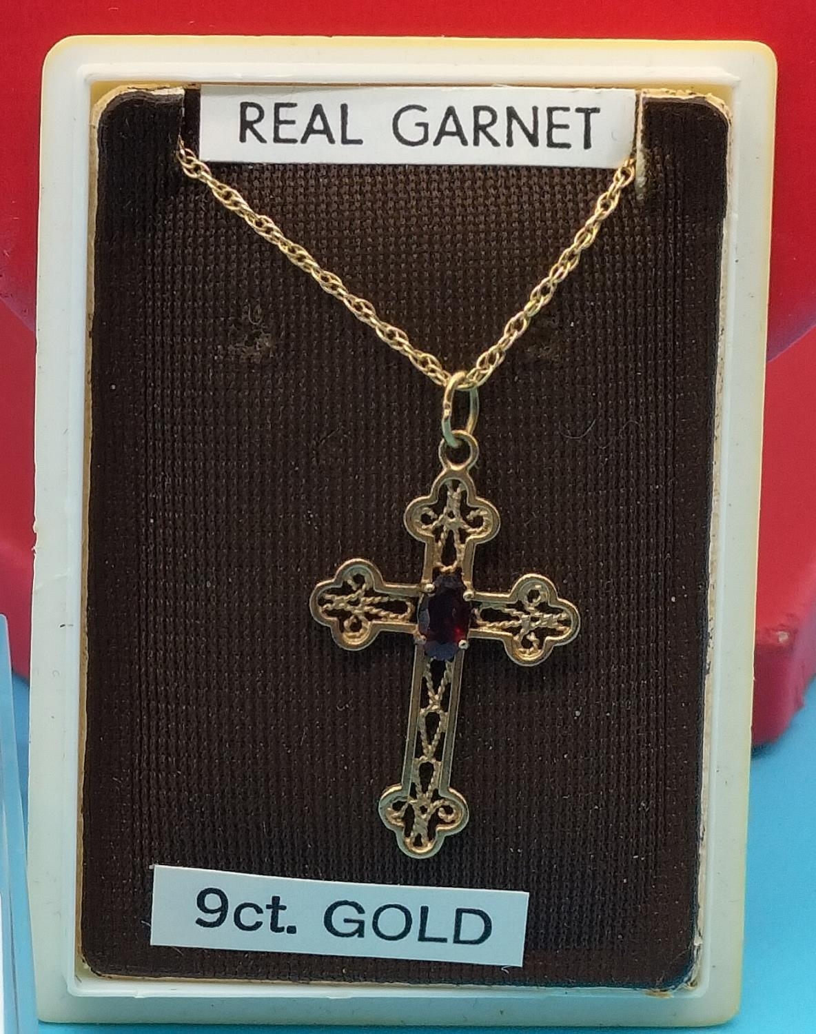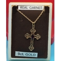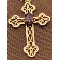 9ct Gold and Garnet Cross and Chain. 1.6 Grams.